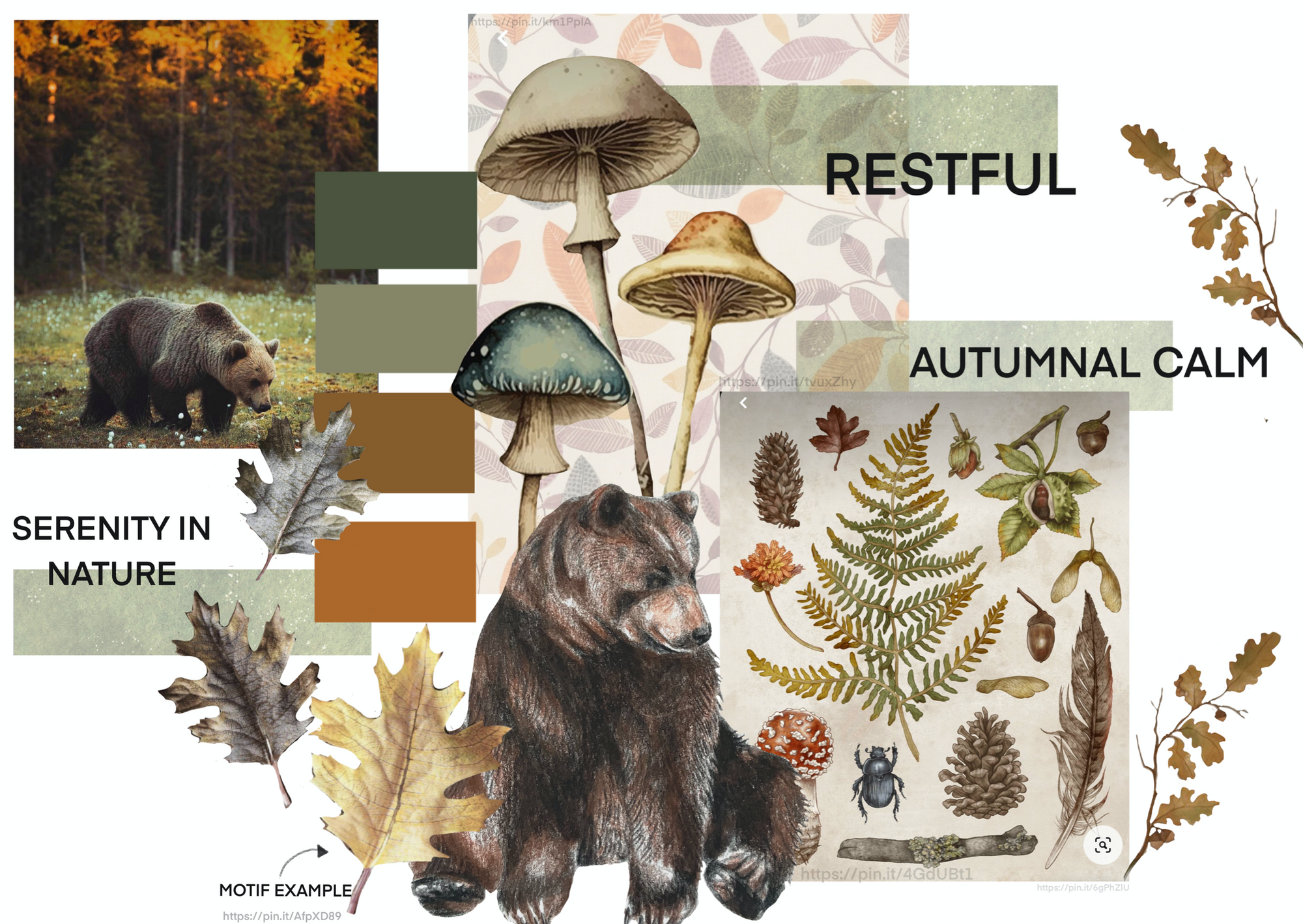 In this collection for The Tiny Toucan, I sourced my inspiration from a North American Autumn. I have always loved autumn as the world seems to calm and quiet down, blessing us with the beautiful hues of gold and orange. I illustrated bears preparing for hibernation, to represent the serenity that this season also gives us. I hope you find joy in these designs, as much as I did in creating them.