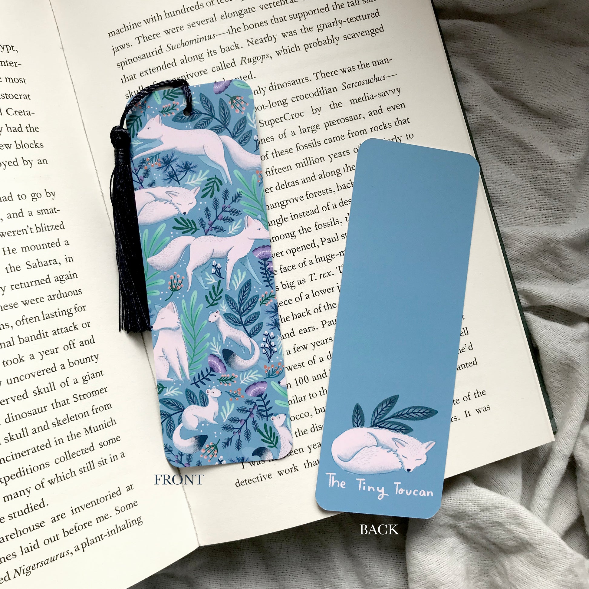 Illustrated Arctic Fox and Stoat bookmark featuring plenty of wintery plants and snow creatures. Available with or without a silky soft tassel.