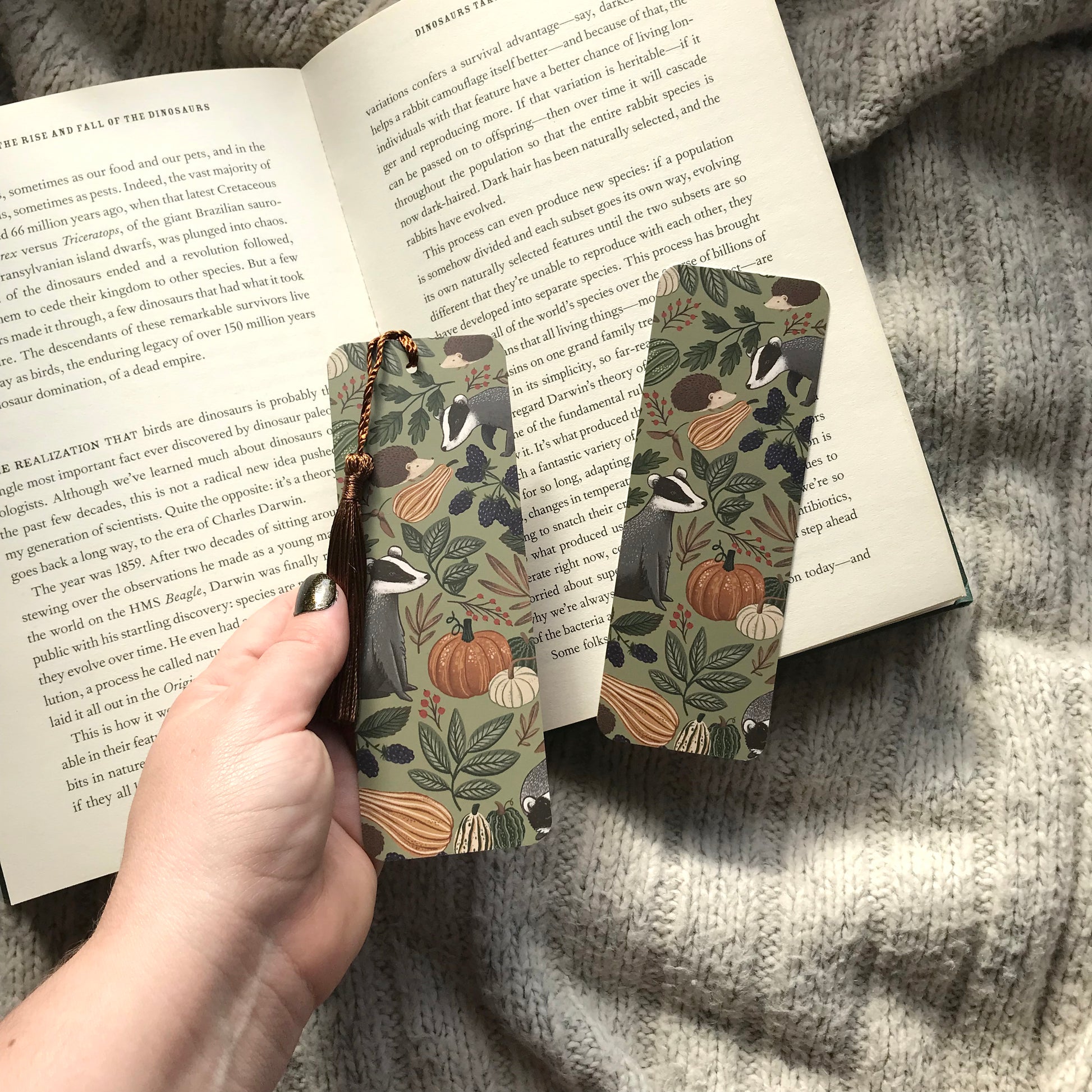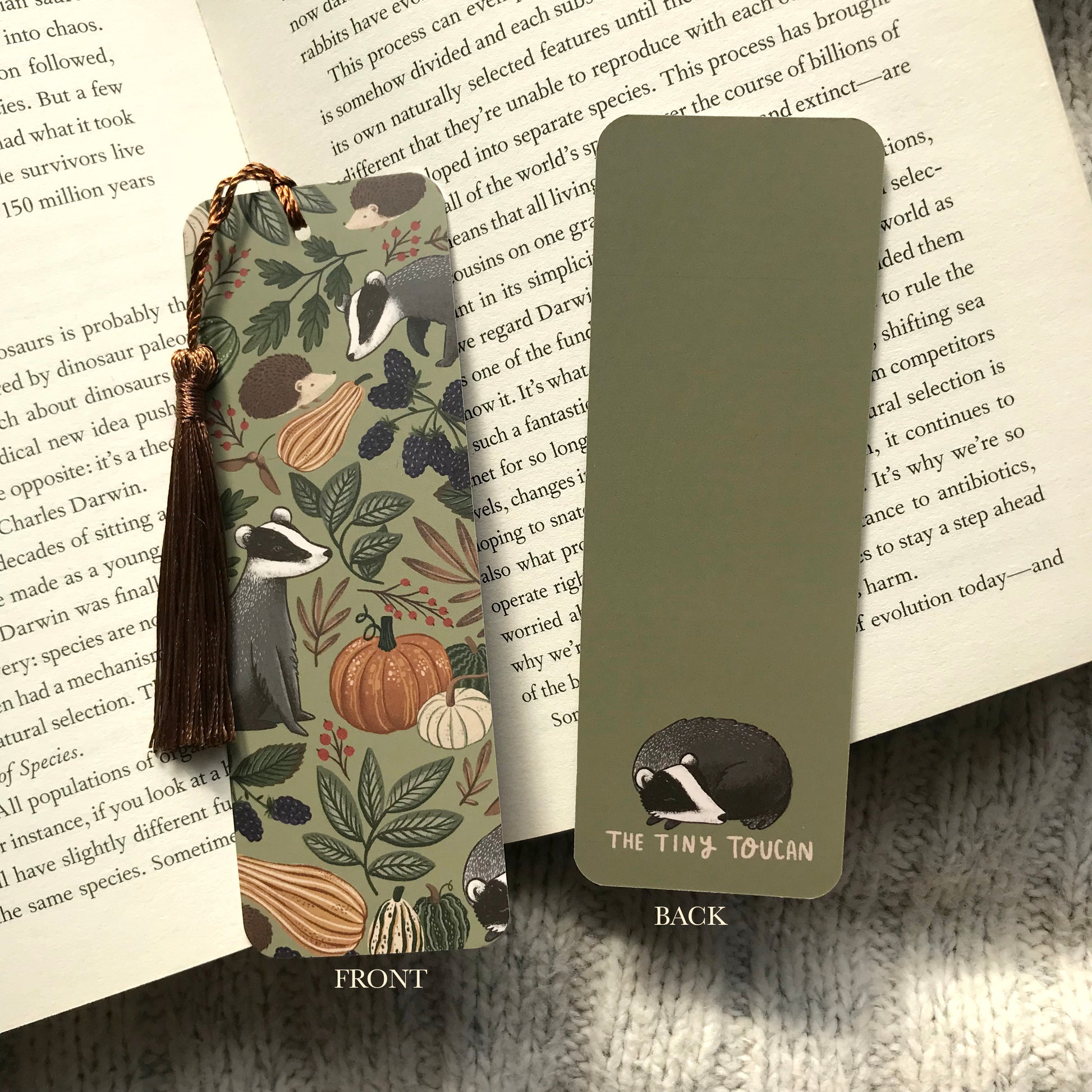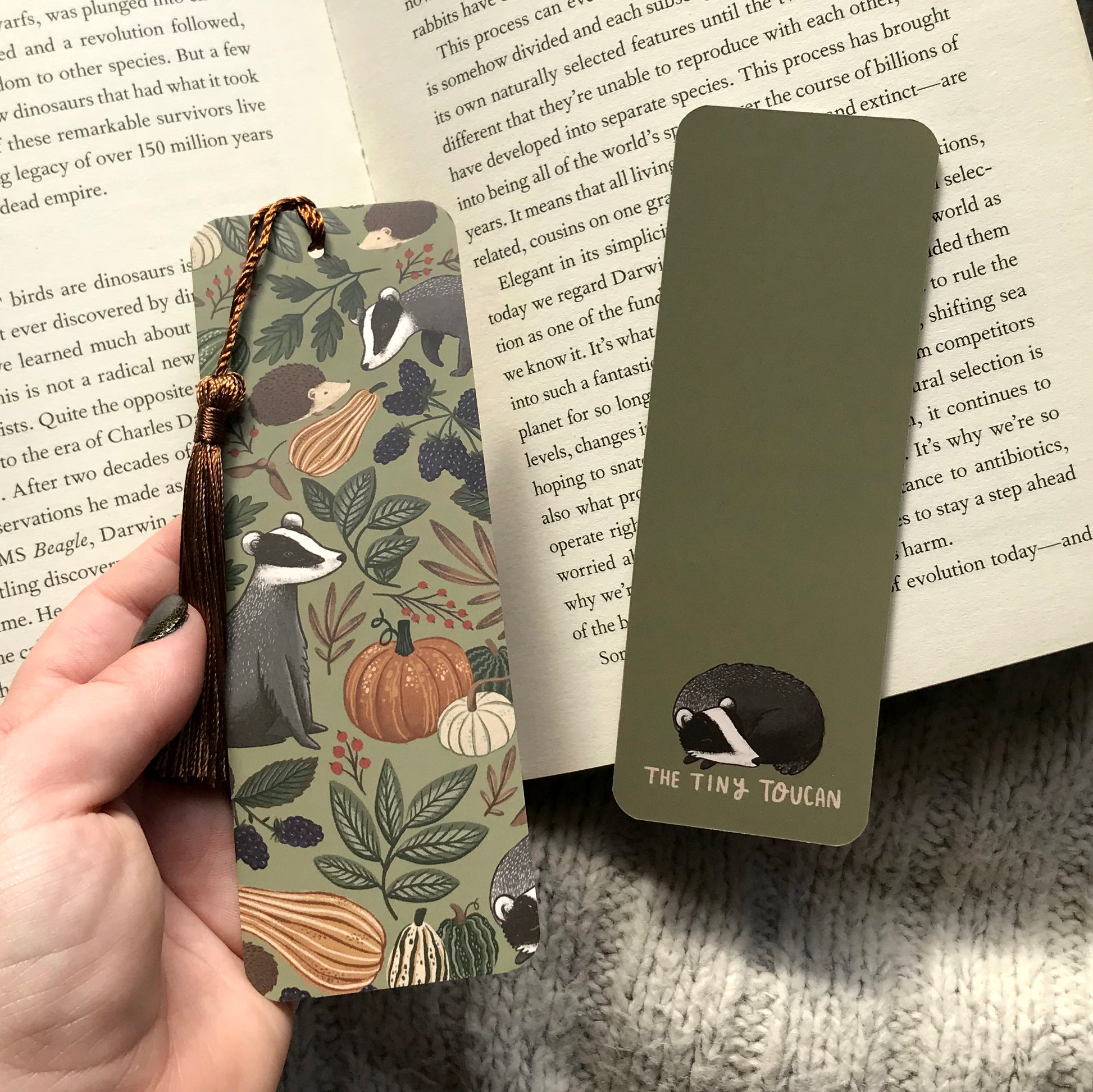 Illustrated autumnal badgers, hedgehog, pumpkins and gourds bookmark available with or without a silky soft tassel.