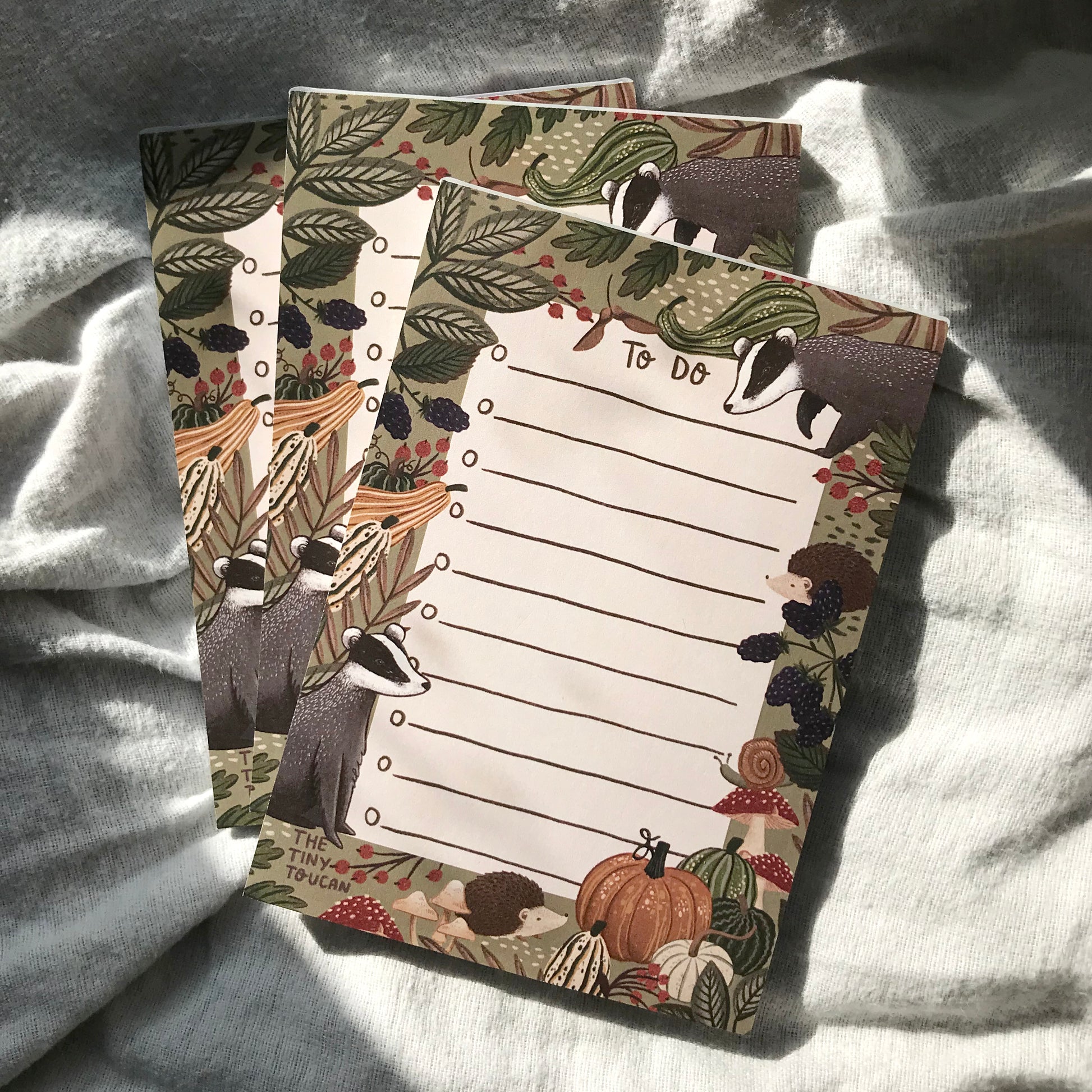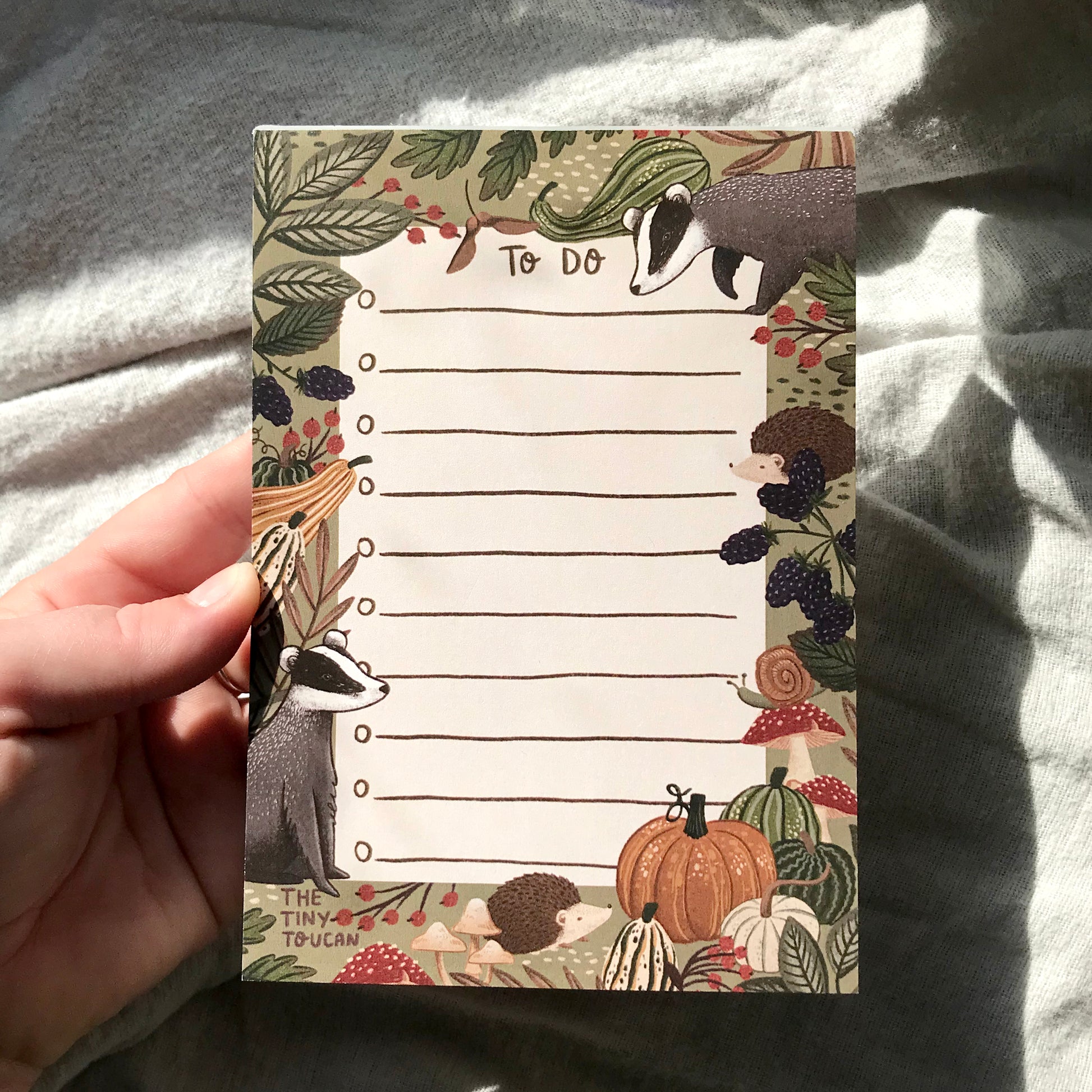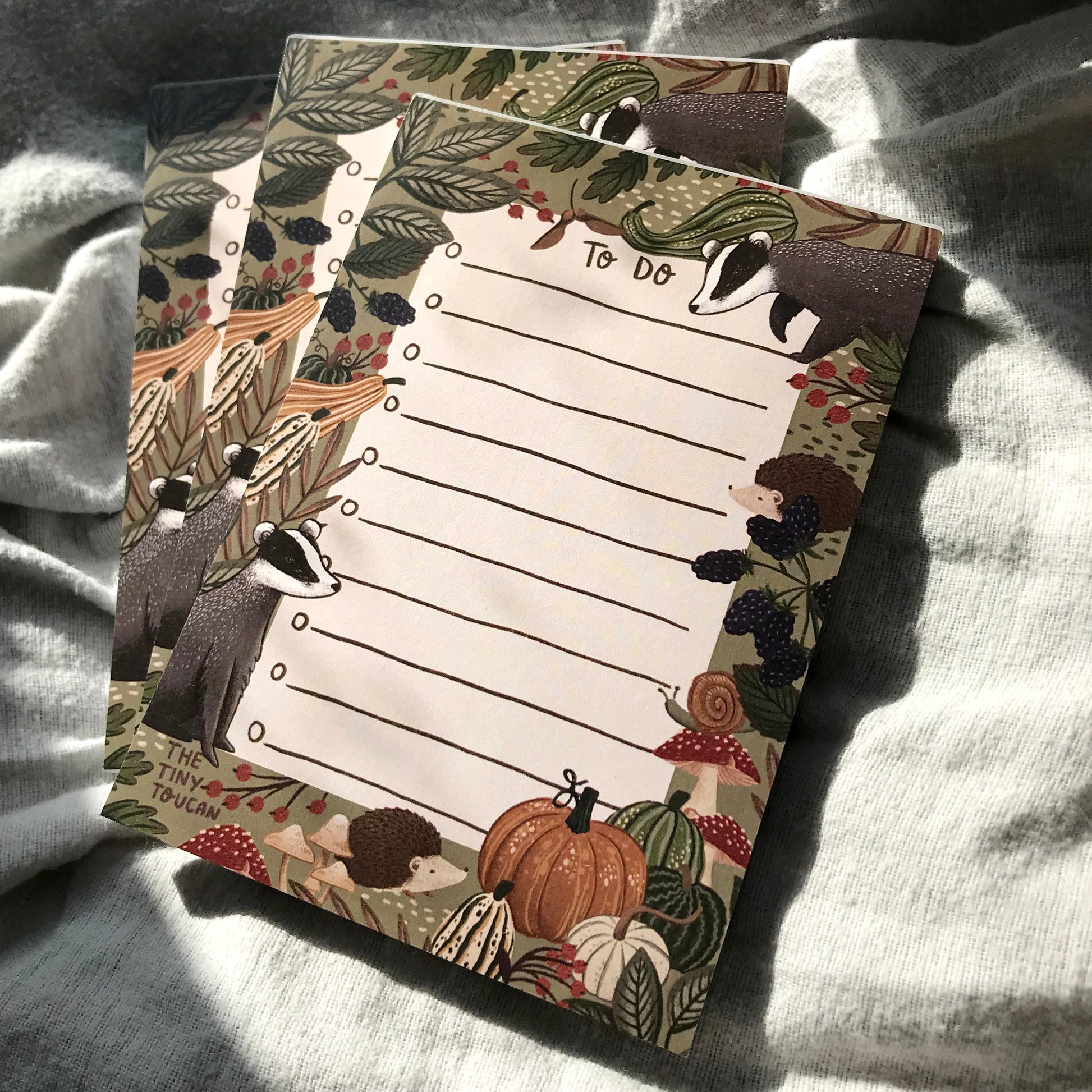 Badgers and Gourds to do list. Illustrated autumnal badgers, hedgehog, pumpkins and gourds, the perfect autumnal organiser.