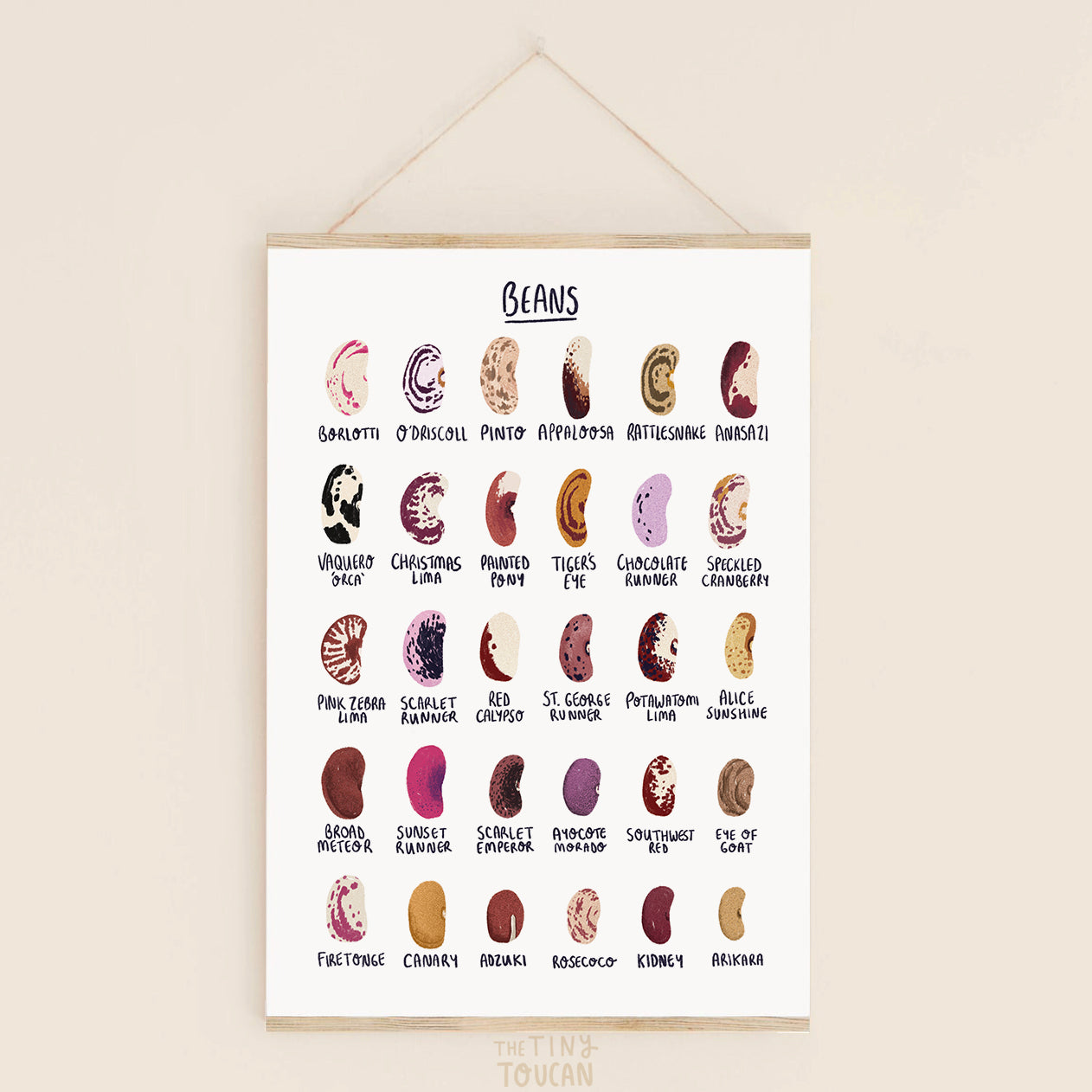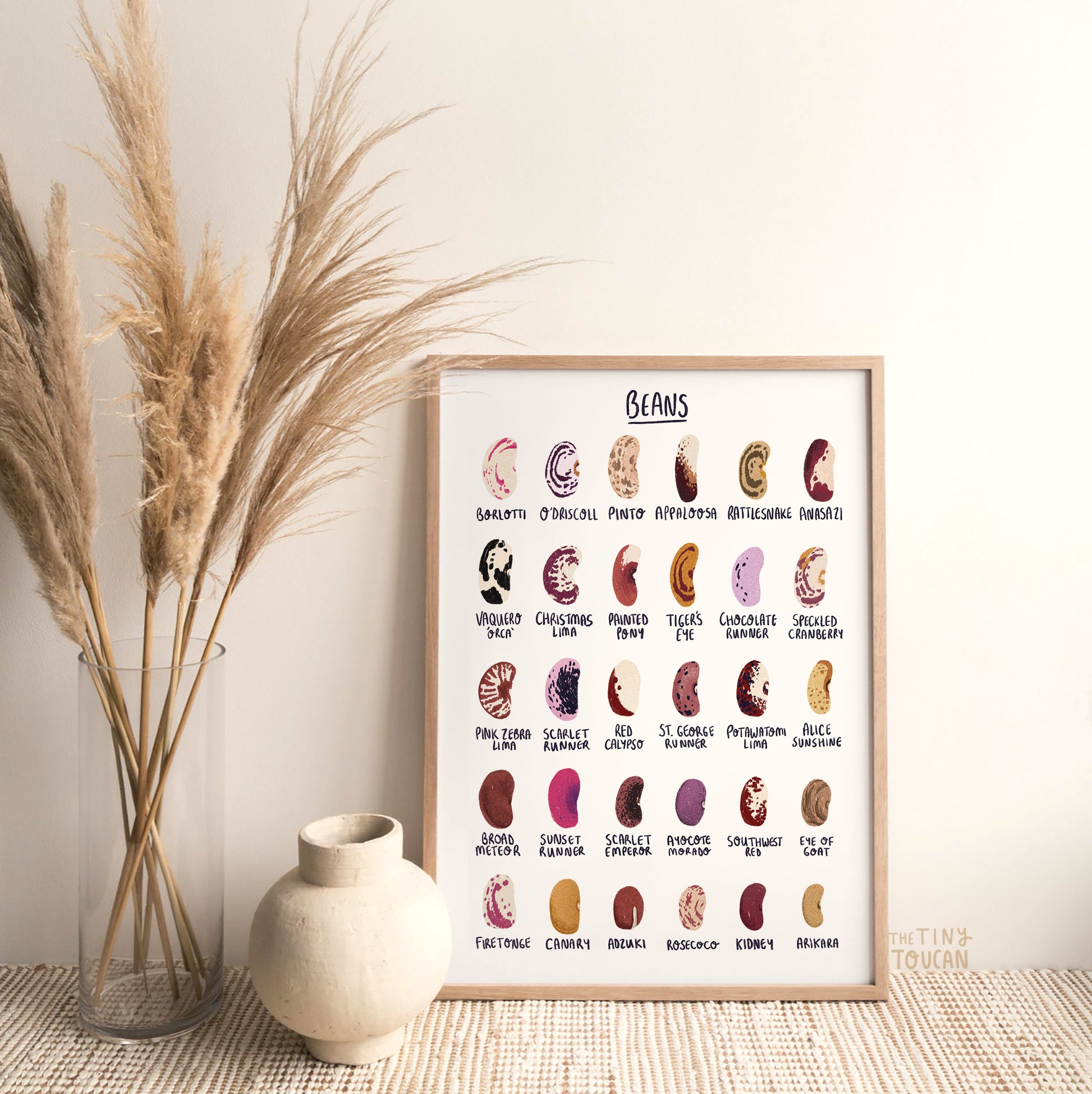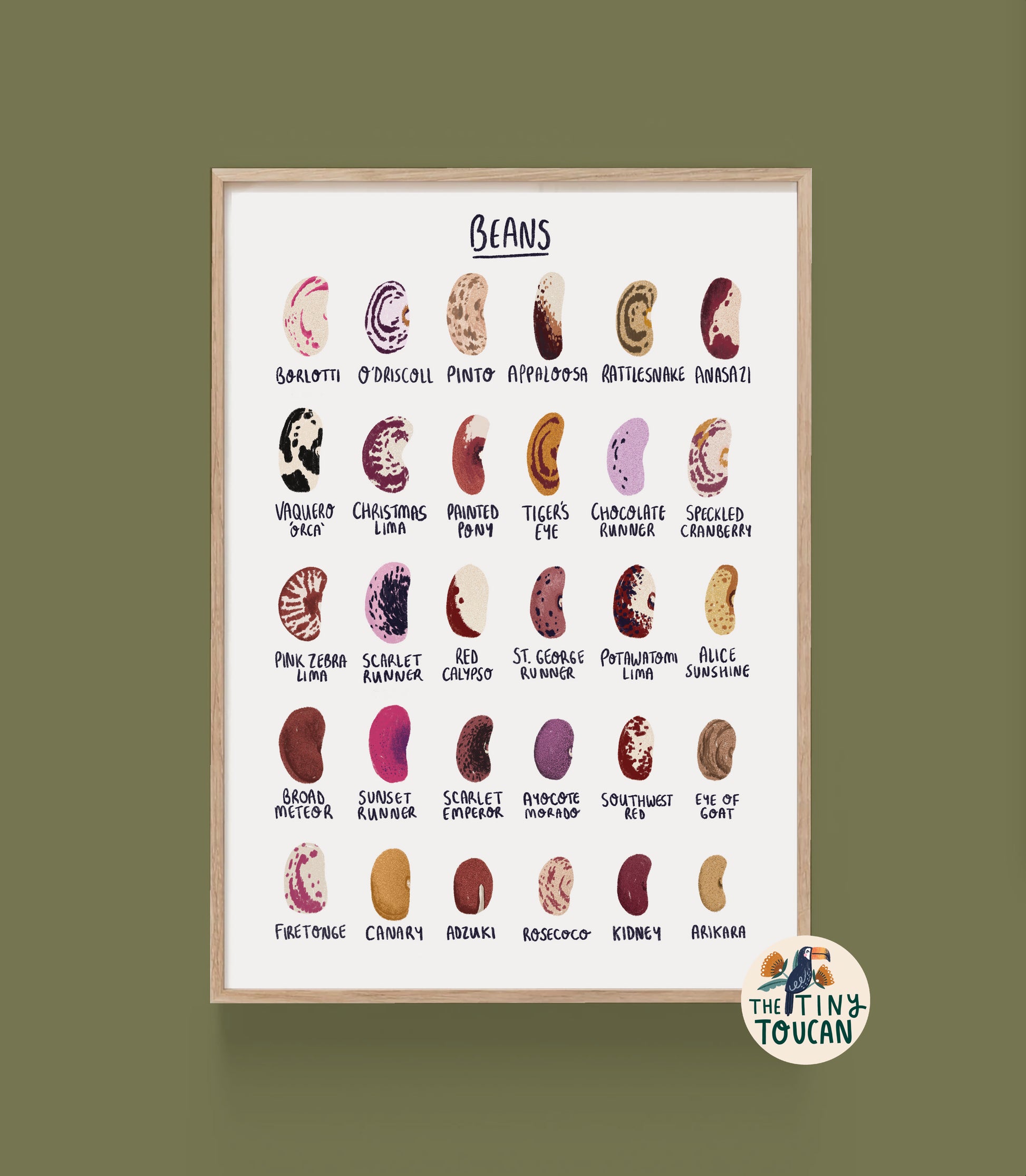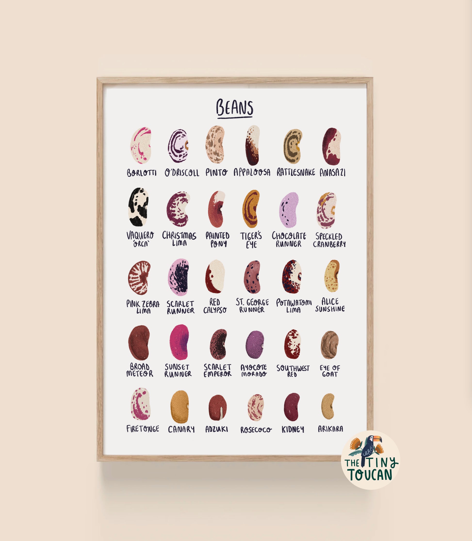 This print would be a fab addition to any green fingered kitchen, office space living room decor or woodland themed nursery. Featuring all kinds of dried bean seeds and their beautiful colourful patterns.