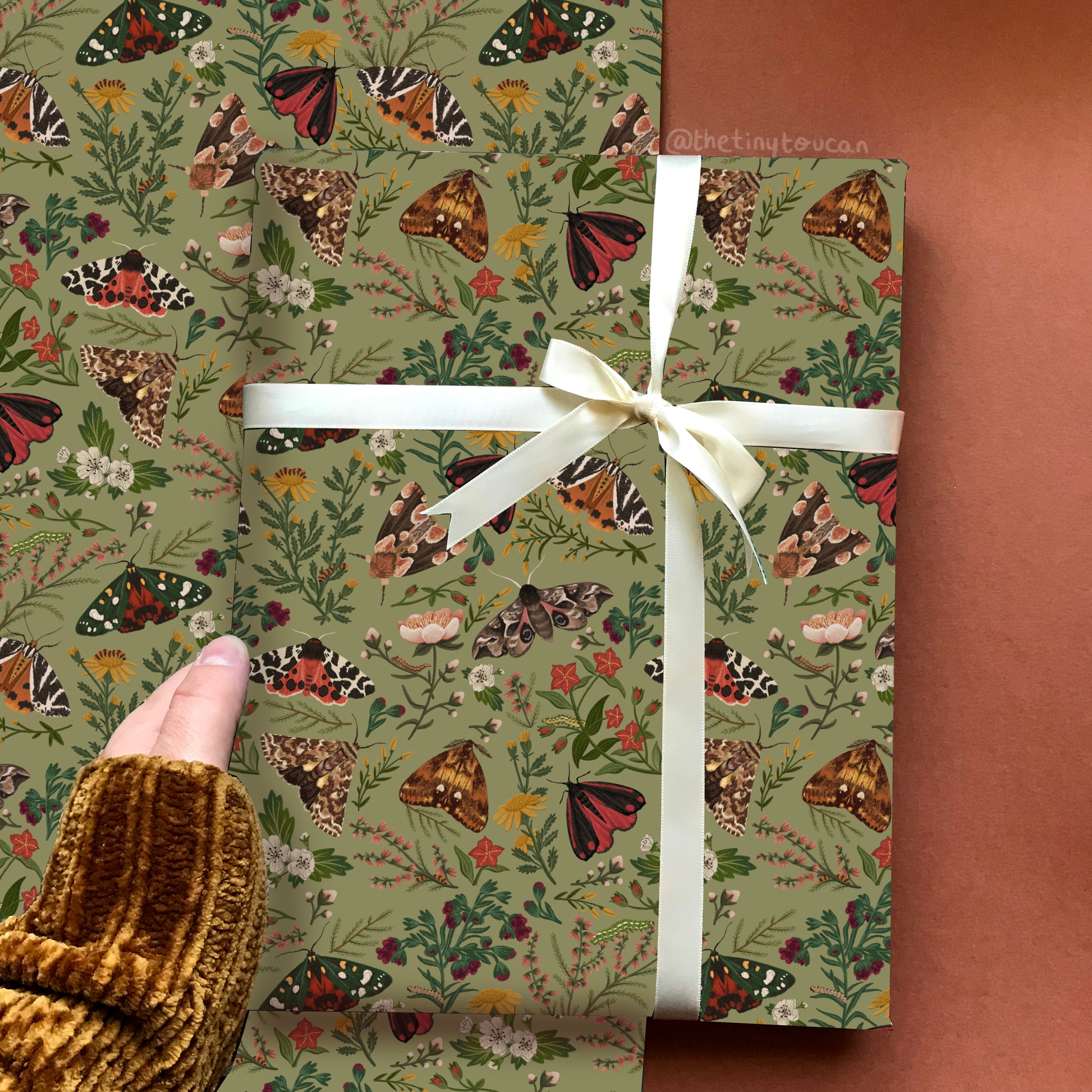 Illustrated British Moths wrapping paper. Featuring the Jersey Tiger, Eye Hawk, Garden Tiger, Scarlet Tiger, Peach Blossom, Cinnabar, Beautiful Yellow Underwing moths.