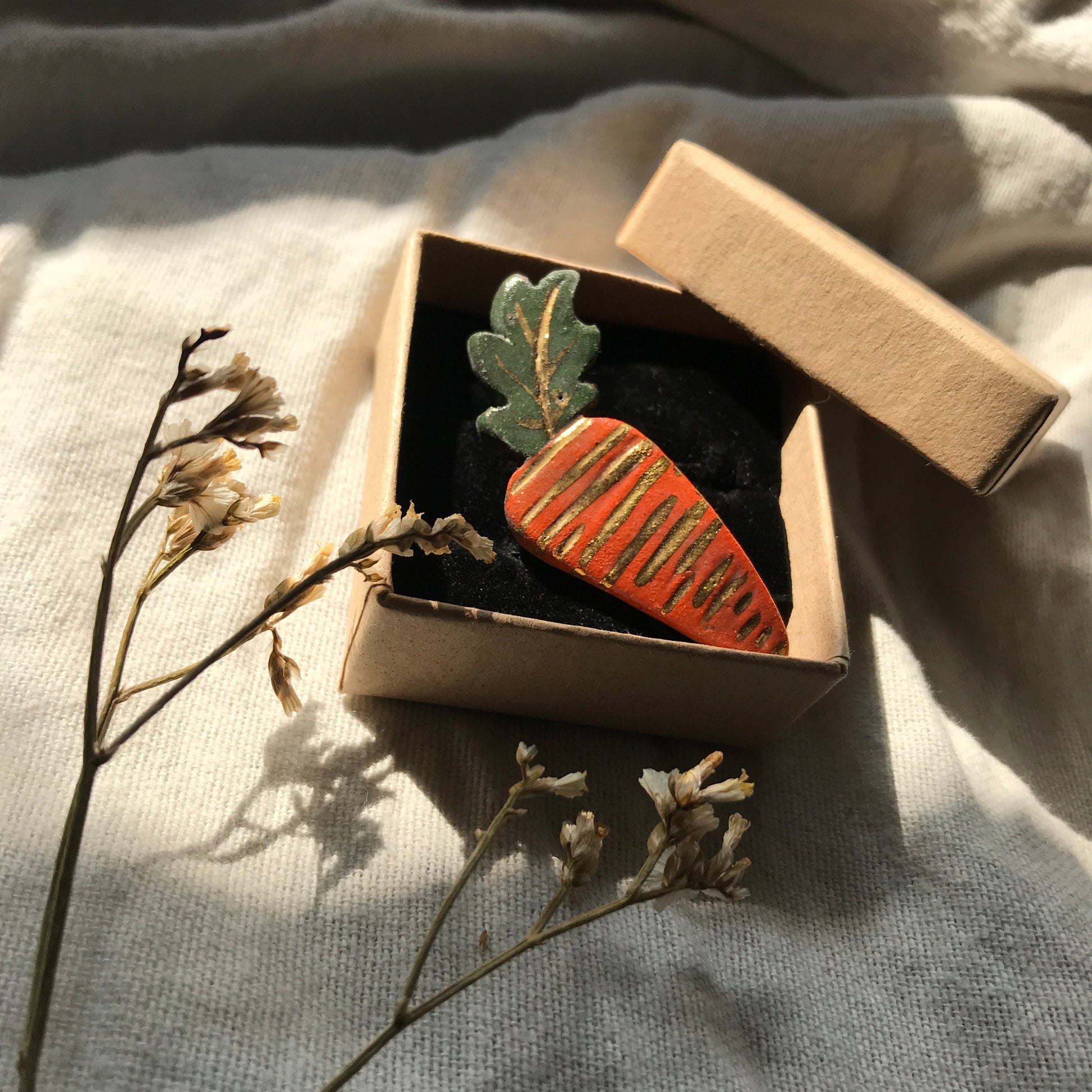 Hand made Stoneware ceramic carrot pin with real 24k Gold Details and brass butterfly clasp.