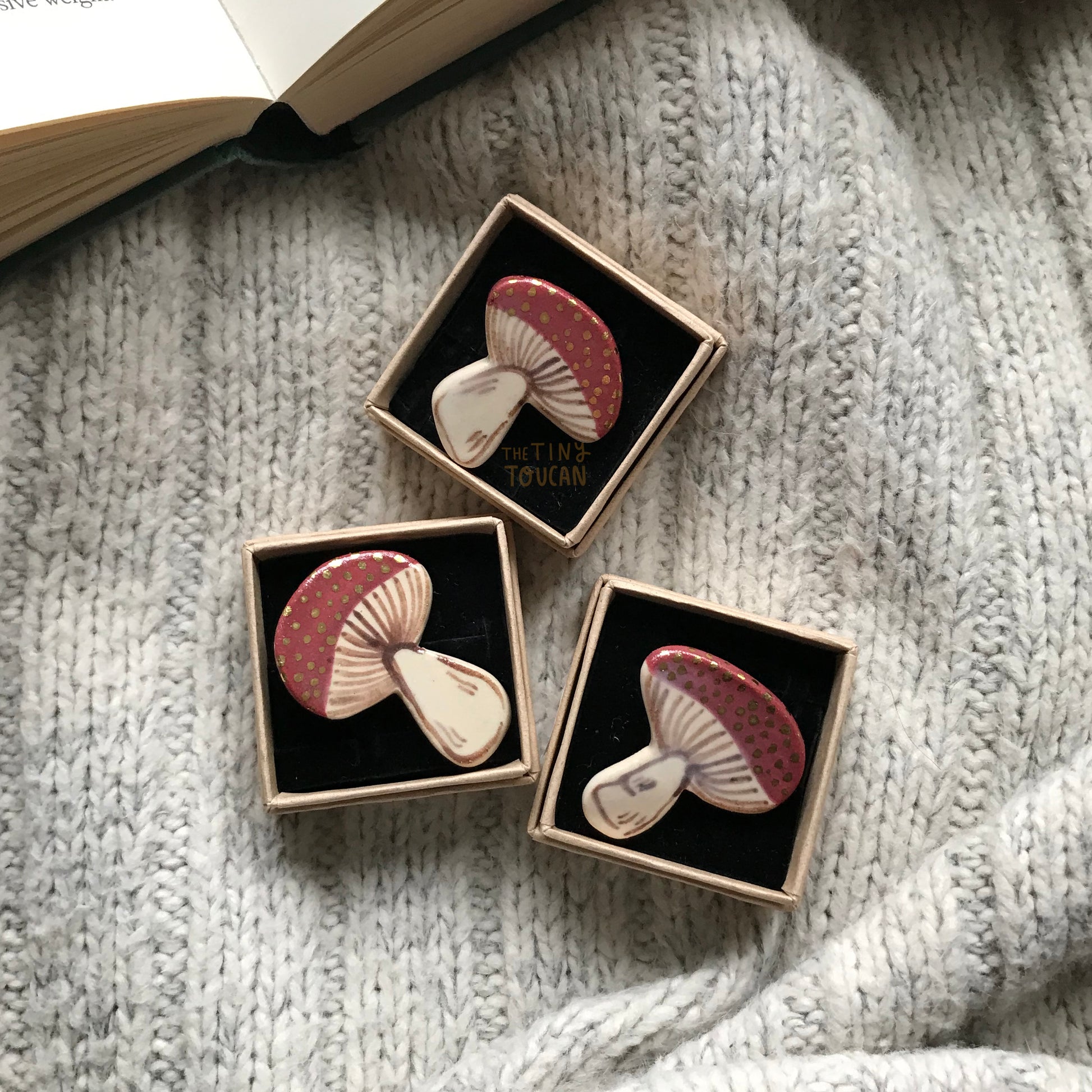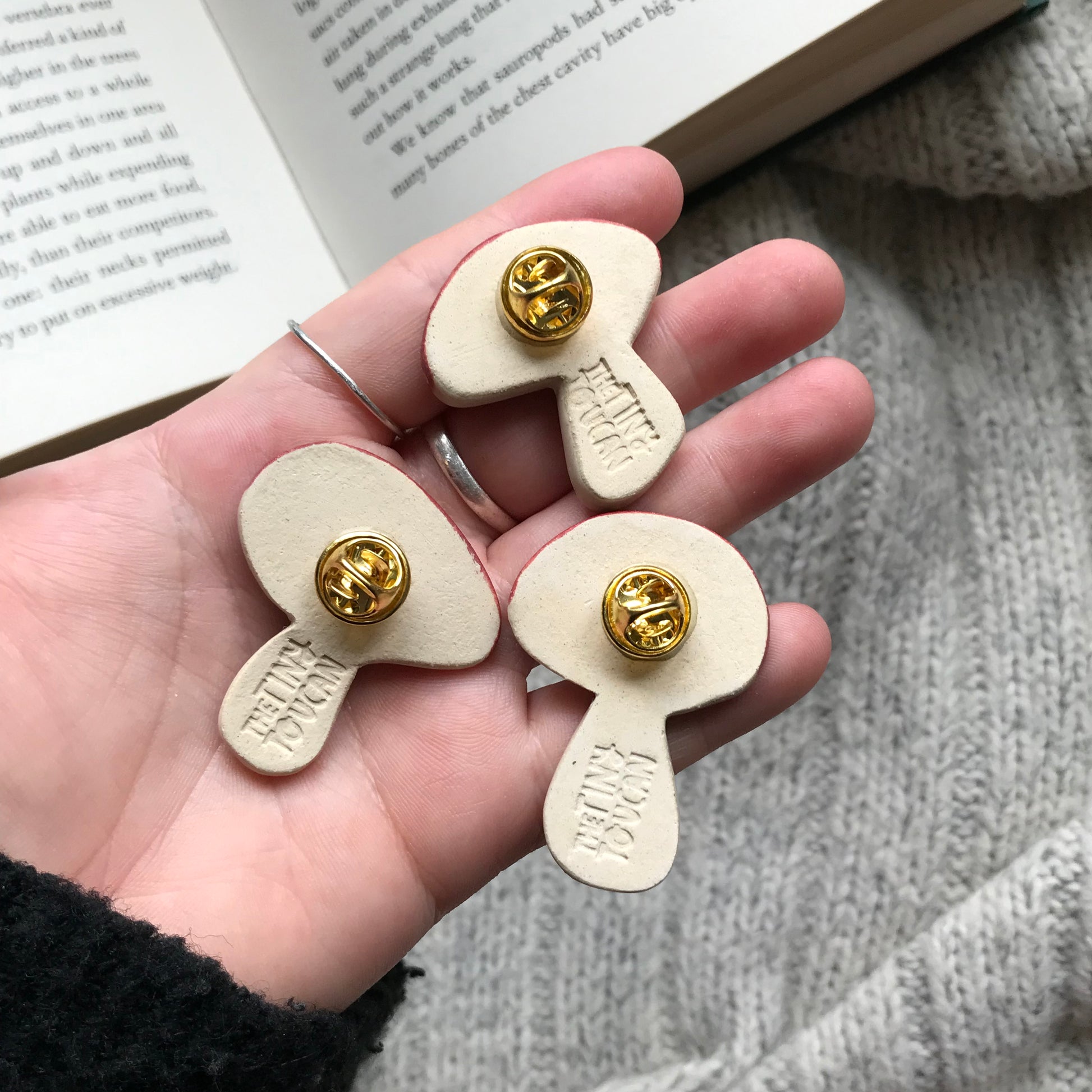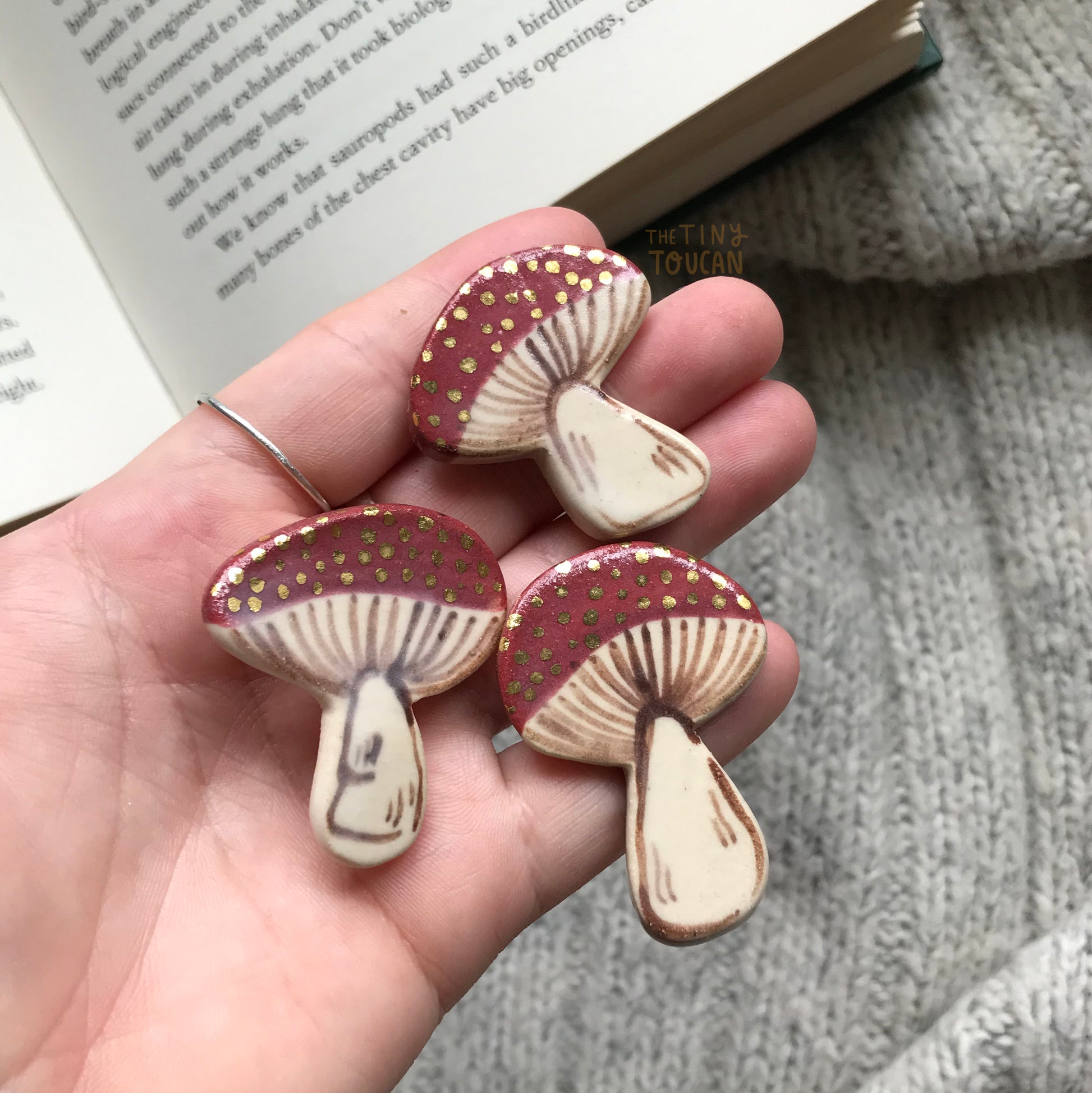 Hand made Stoneware ceramic mushroom pin with real 24k Gold Details and brass butterfly clasp.