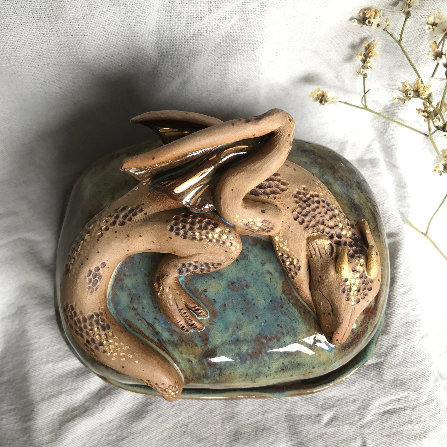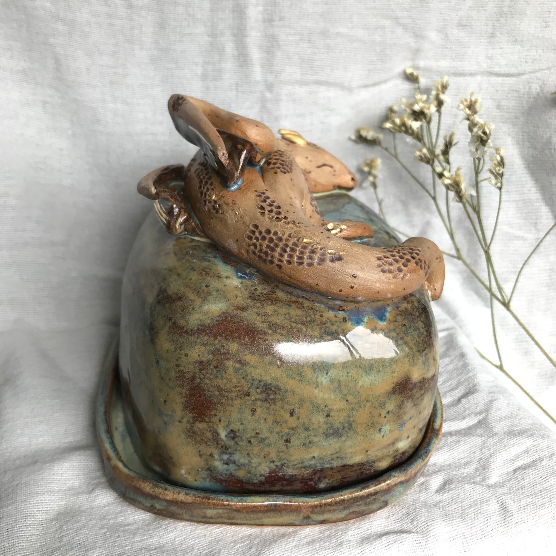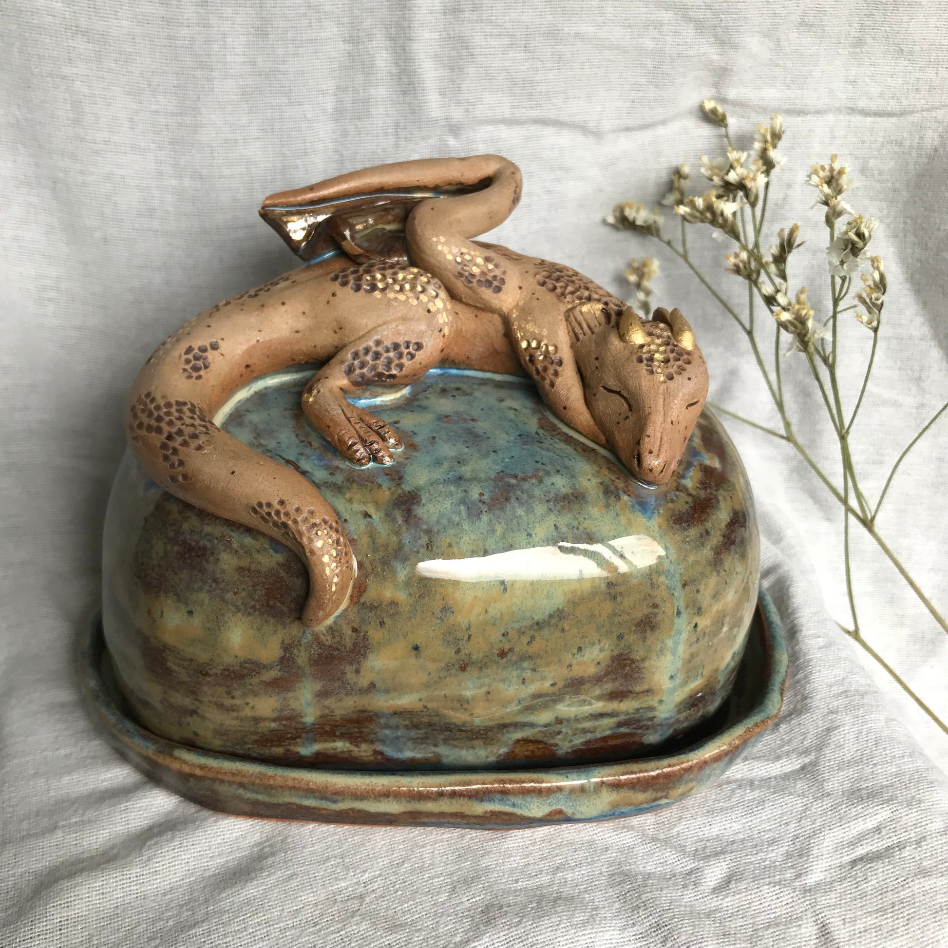 Stoneware hand sculpted sleeping dragon butter dish with matching tray. This butter dish would make a fantastic statement talking piece for the centre of any breakfast table with tonnes of details and a beautiful moss glaze. Finished with 24k Gold lustre details including a hidden dragons horde of gold coins!