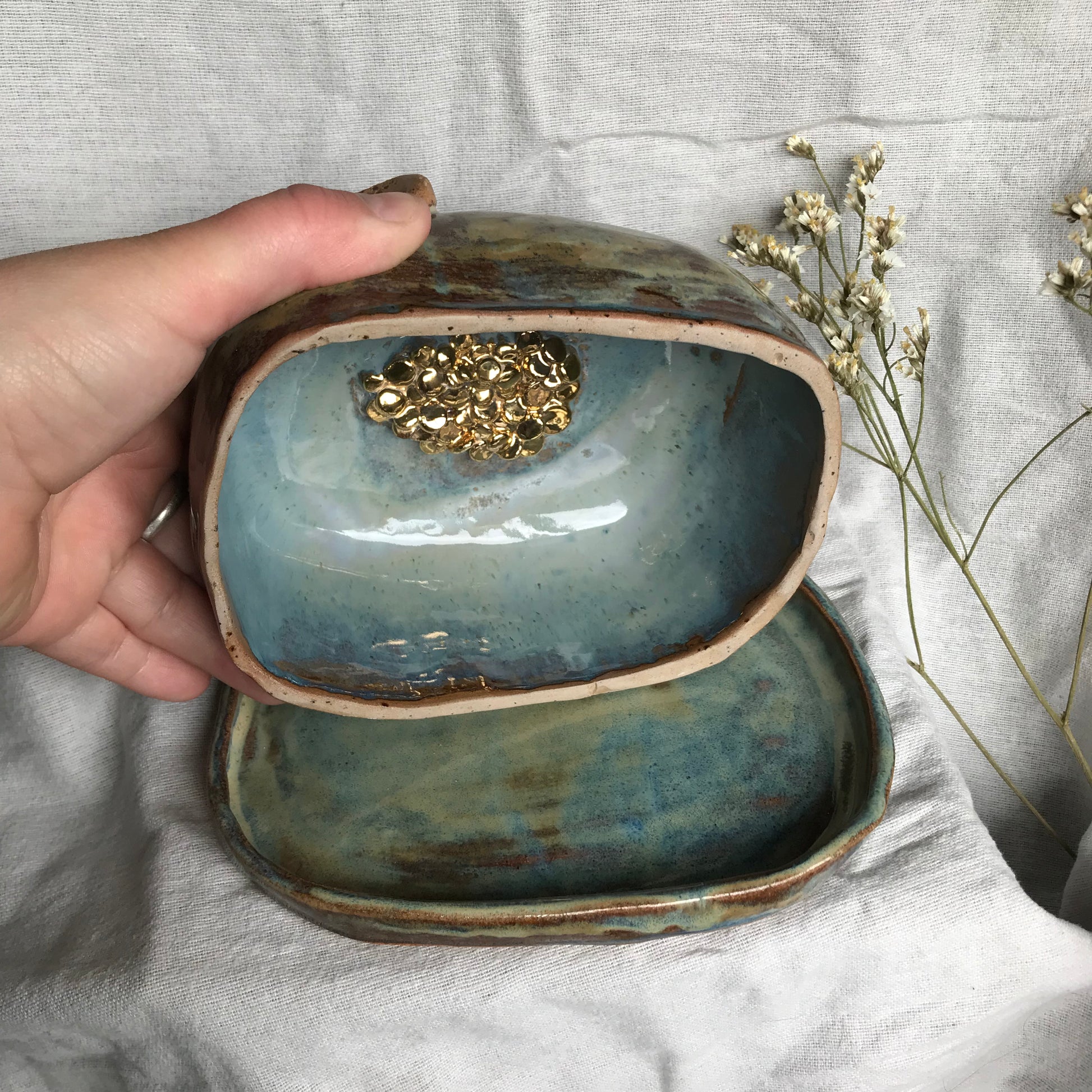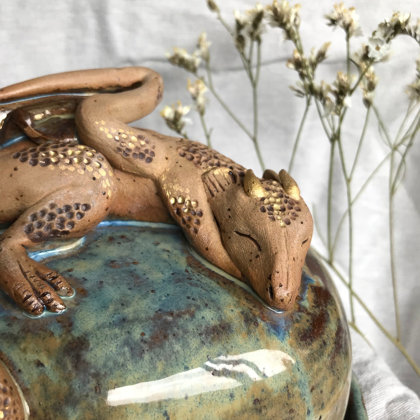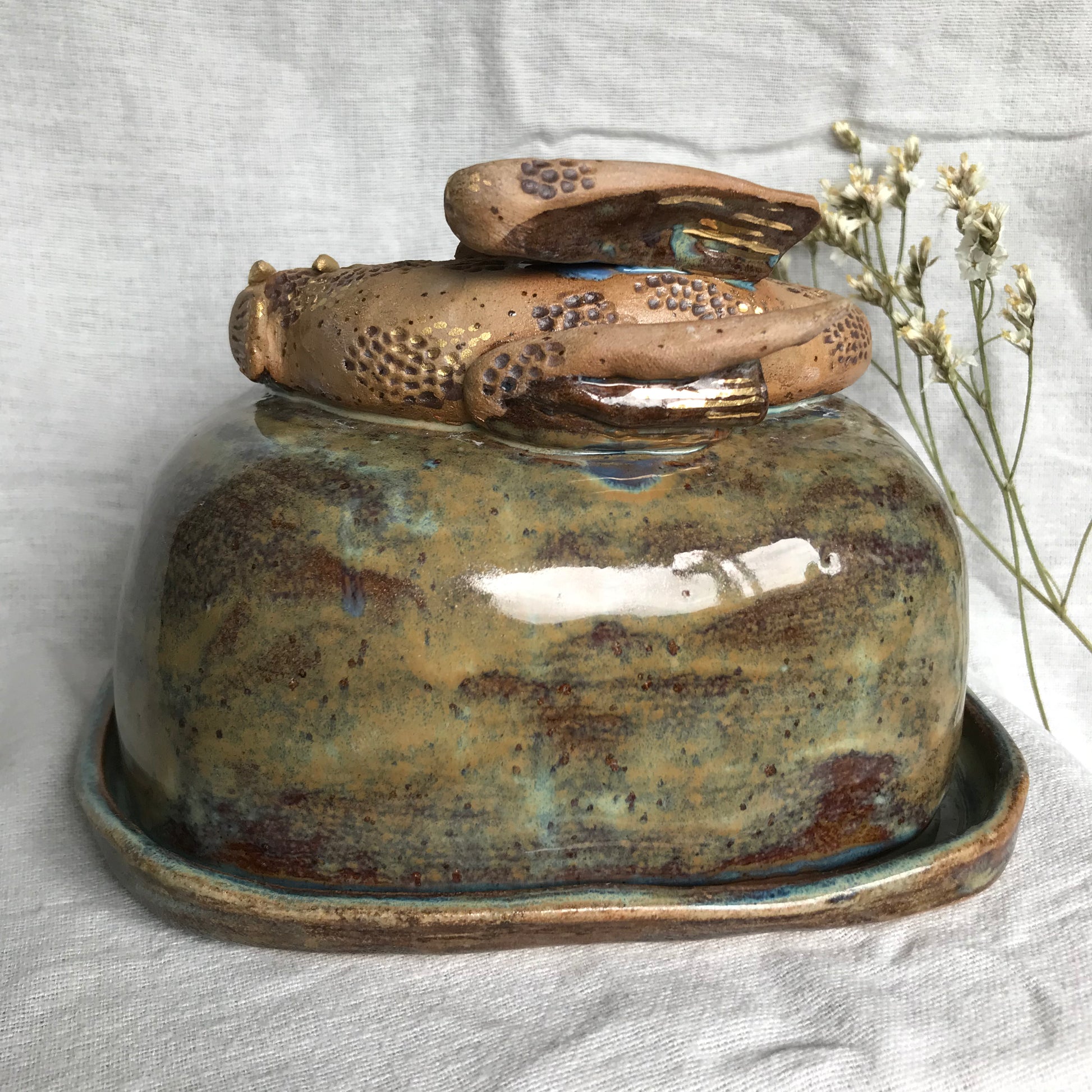 Stoneware hand sculpted sleeping dragon butter dish with matching tray. This butter dish would make a fantastic statement talking piece for the centre of any breakfast table with tonnes of details and a beautiful moss glaze. Finished with 24k Gold lustre details including a hidden dragons horde of gold coins!