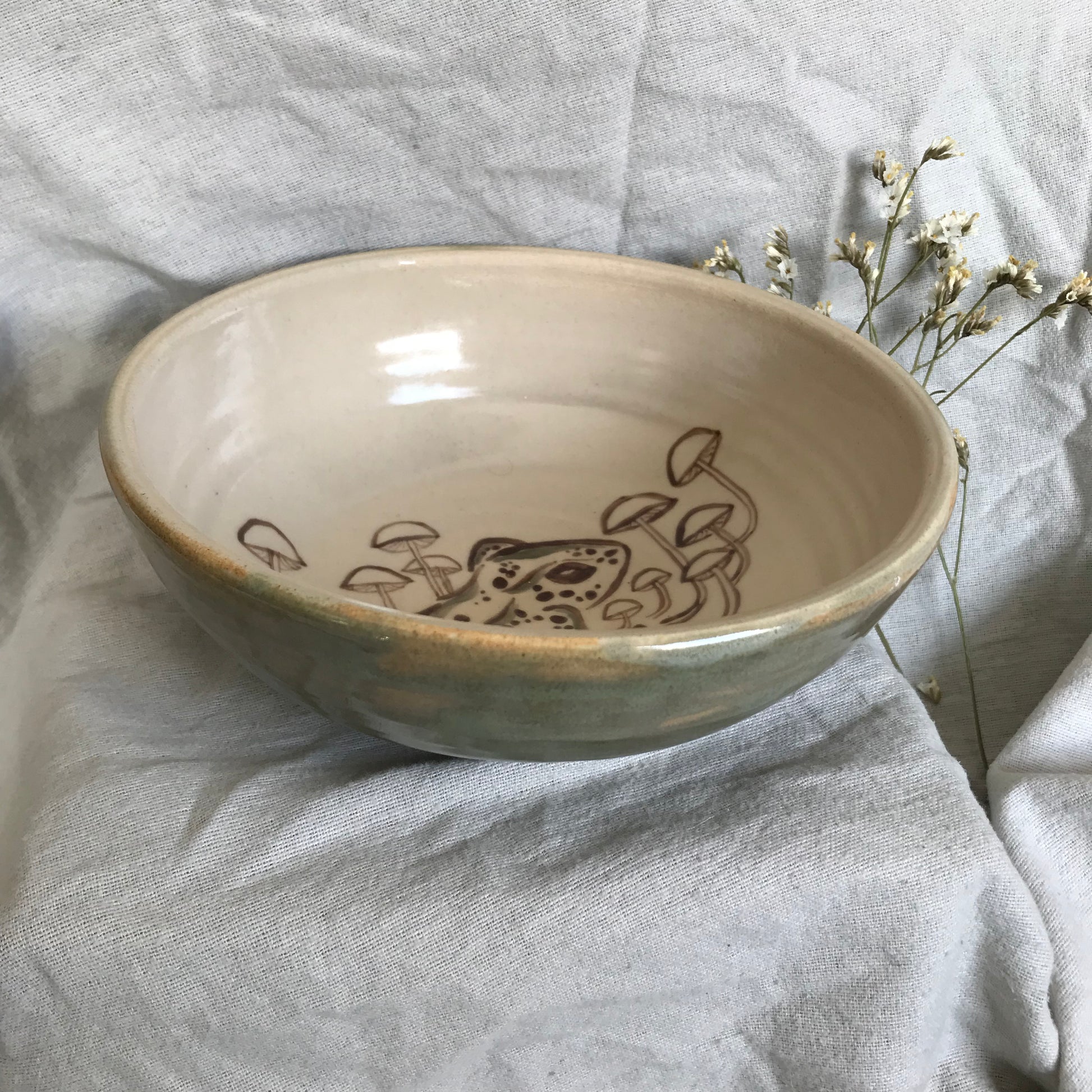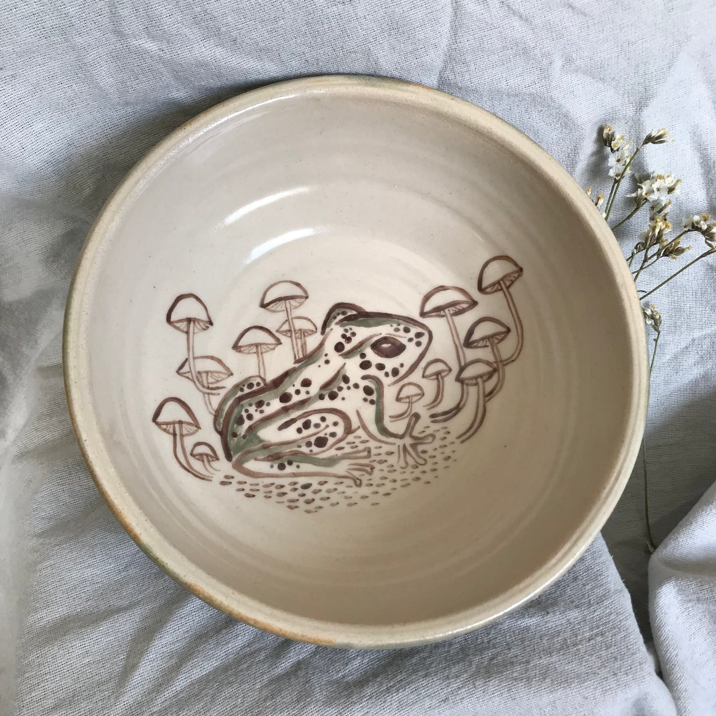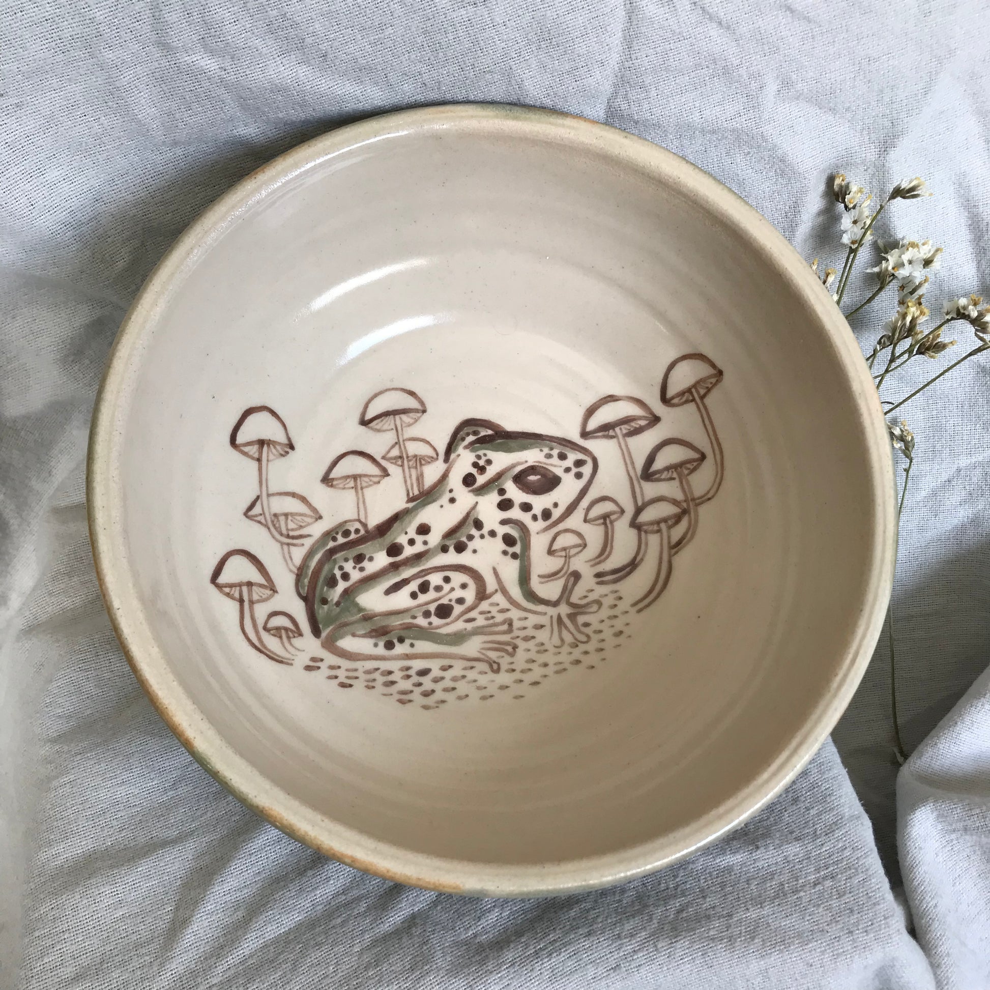 Stoneware illustrated Frog and mushies bowl, perfect for soup, ramen, cereal or your other favourite meal.