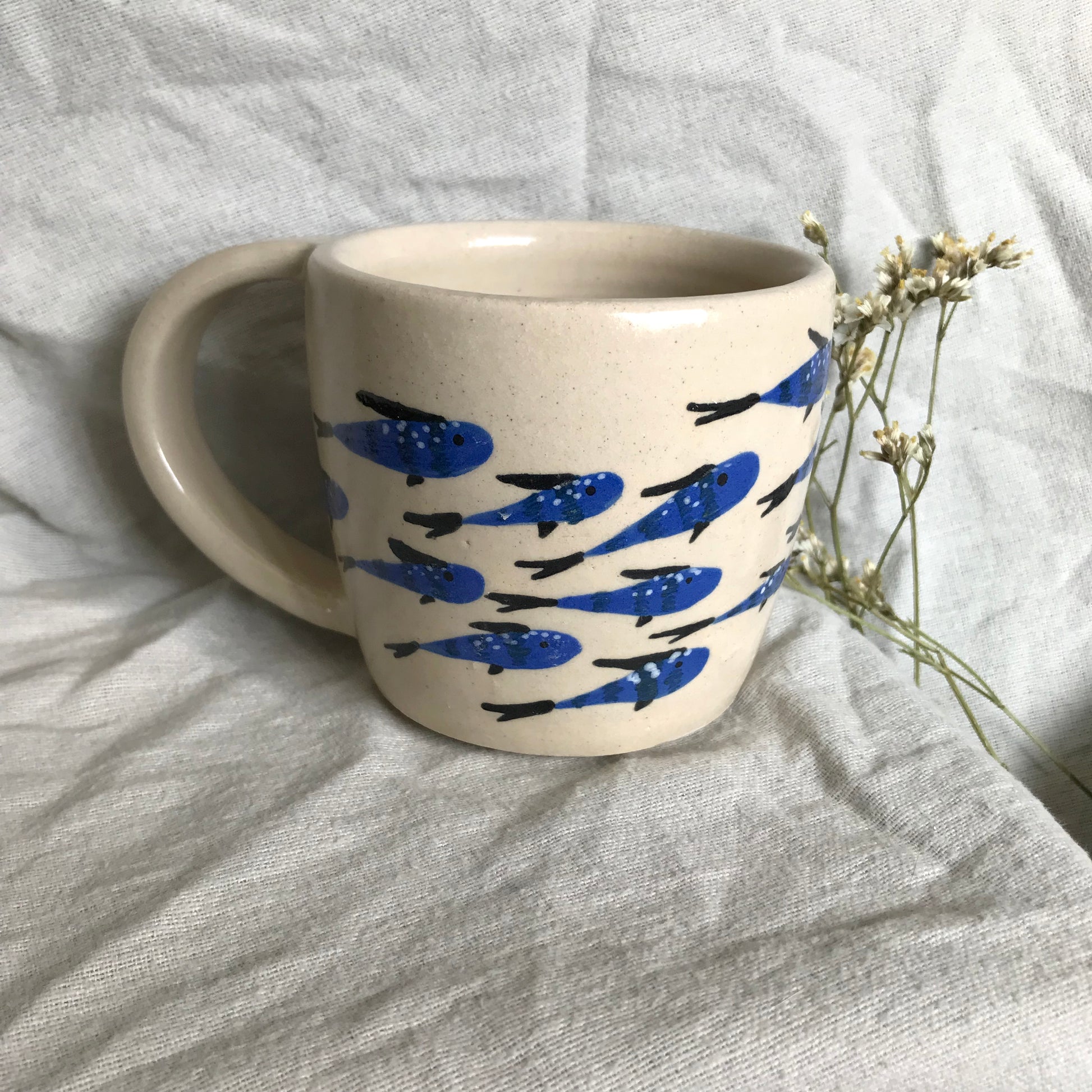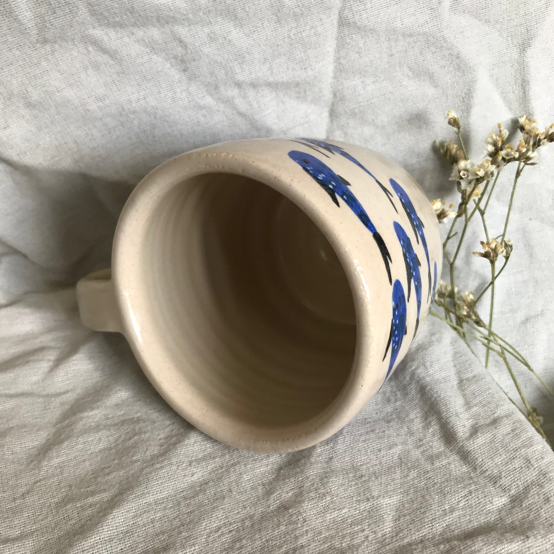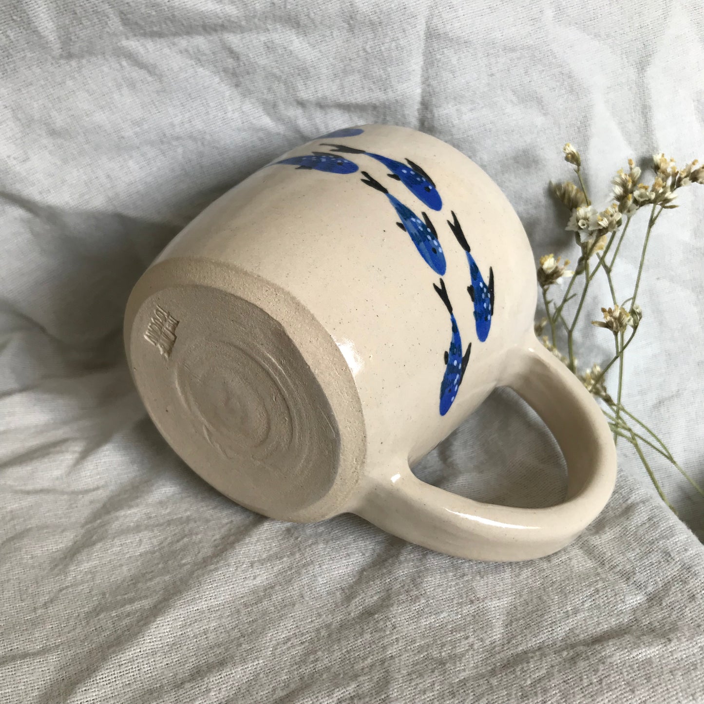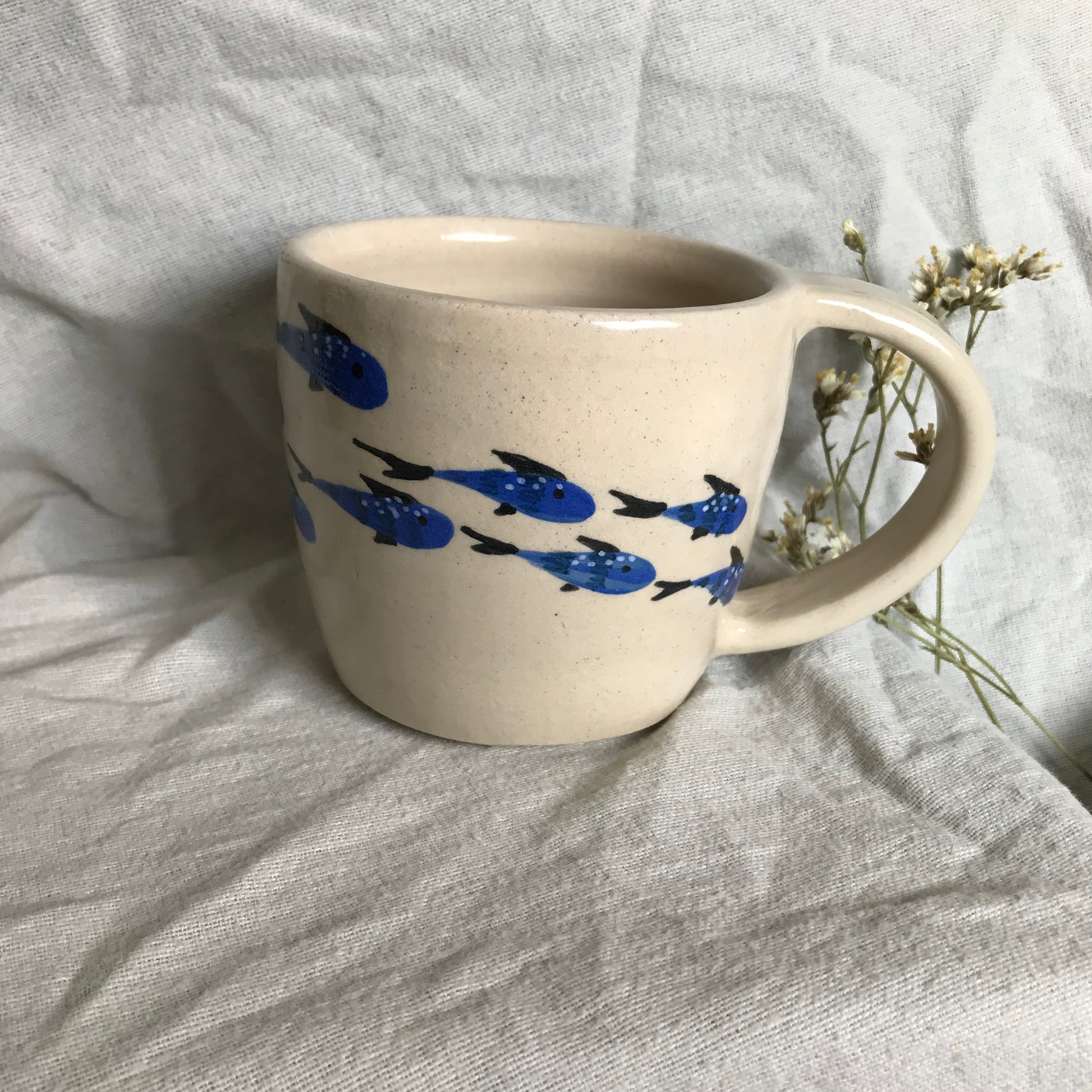 Stoneware mug with hand painted fishies, perfect for any hot drink. Holds approx 350ml.