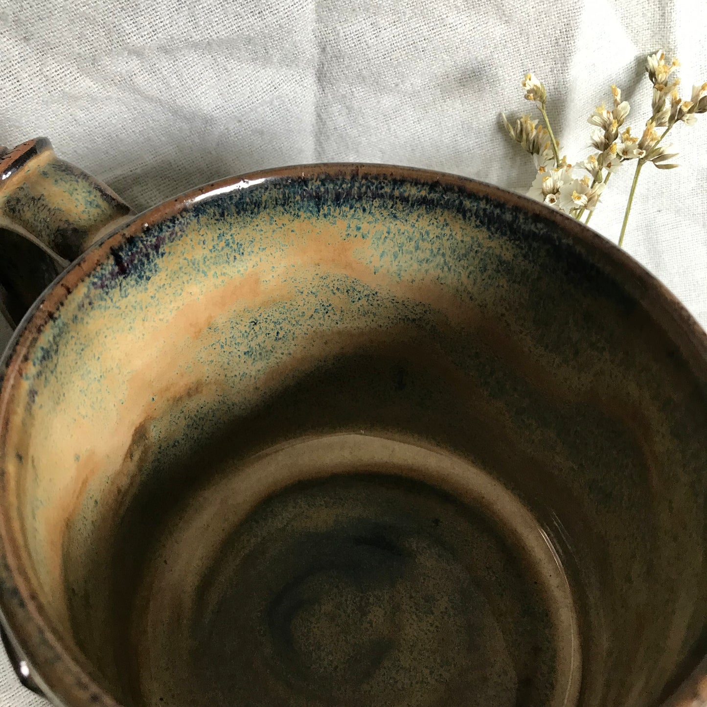 Made with beautifully speckled clay with a stunning dark swamp waterfall glaze.