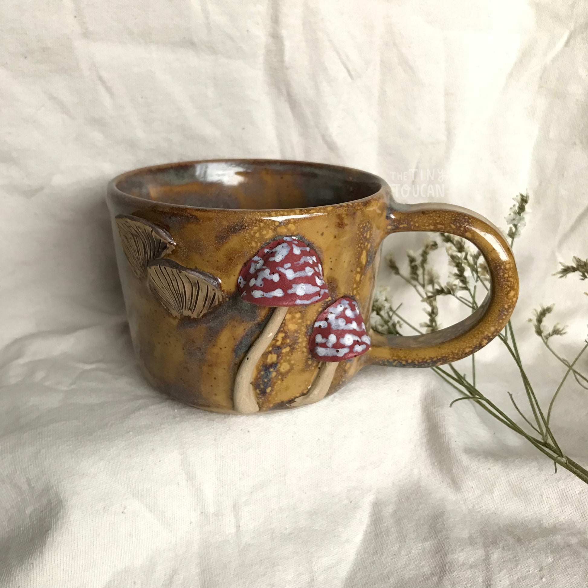 Stoneware mug with 3D sculpted mushrooms perfect for any hot drink.