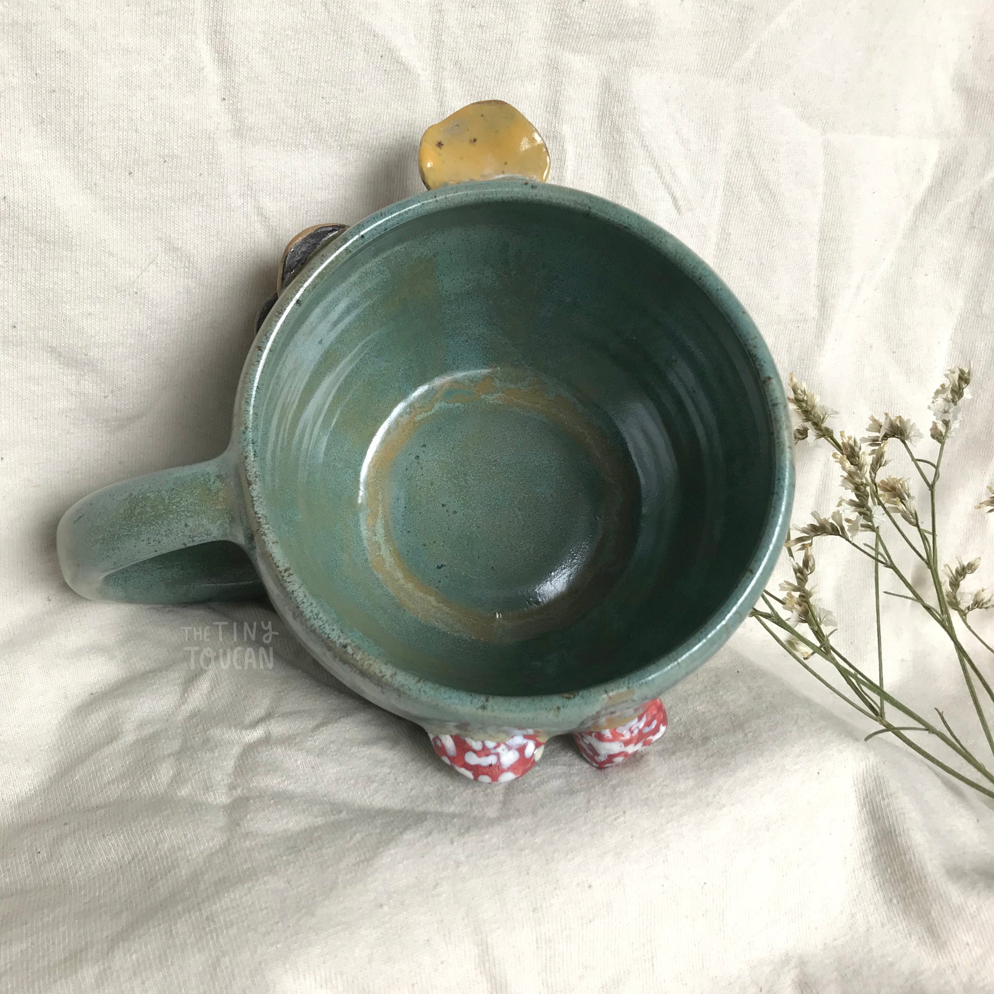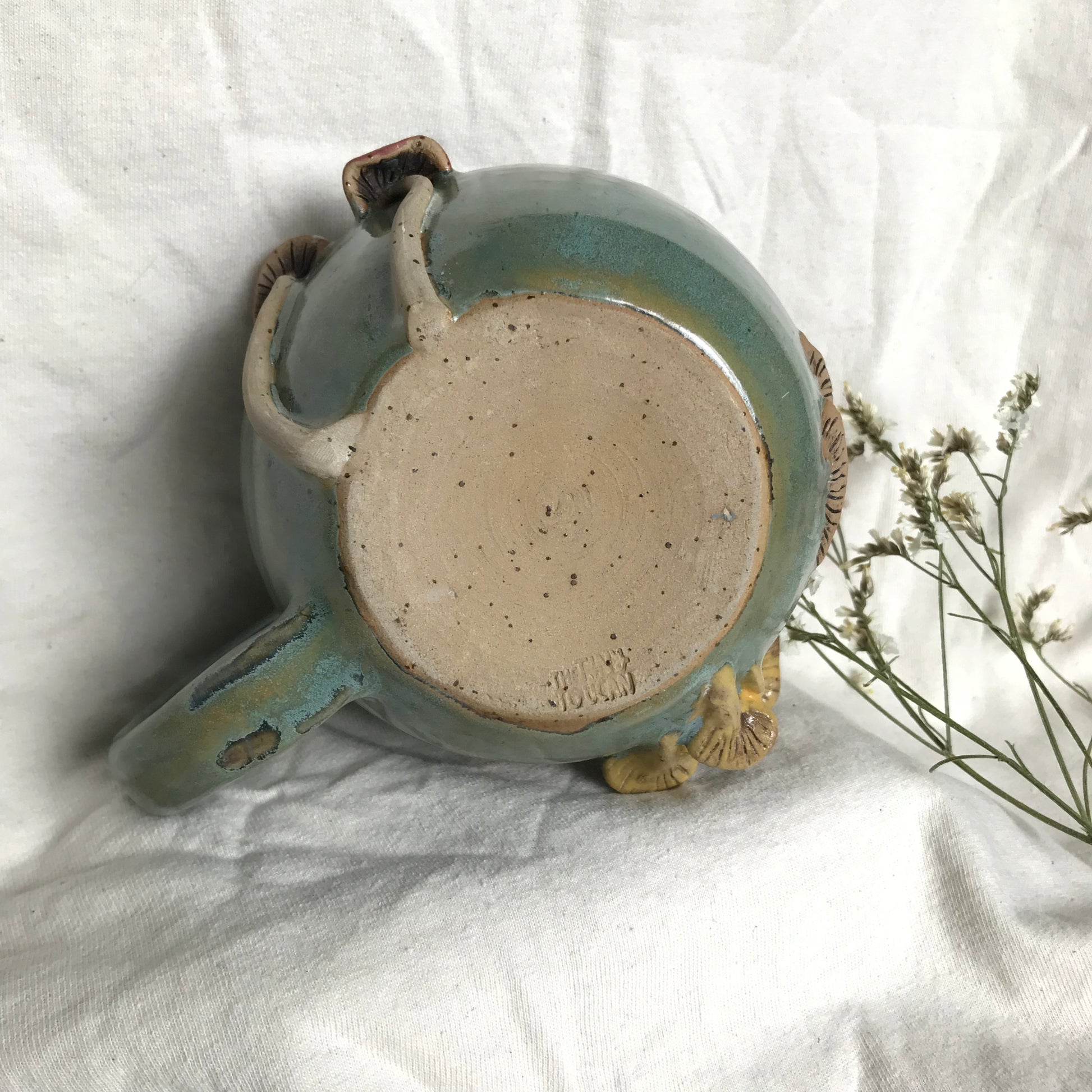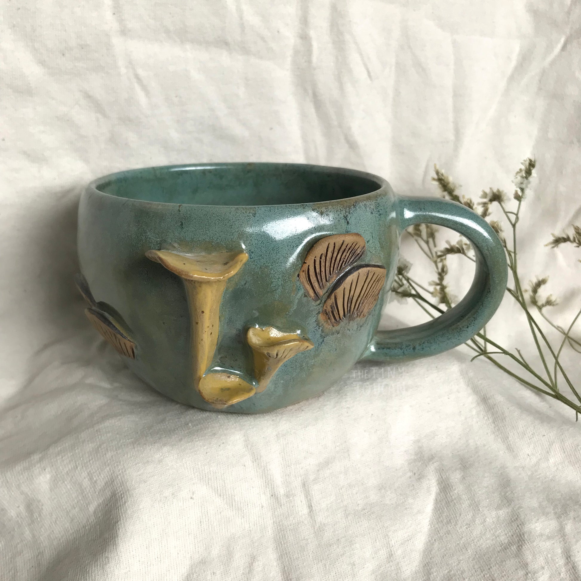 Stoneware mug with 3D sculpted mushrooms perfect for any hot drink.