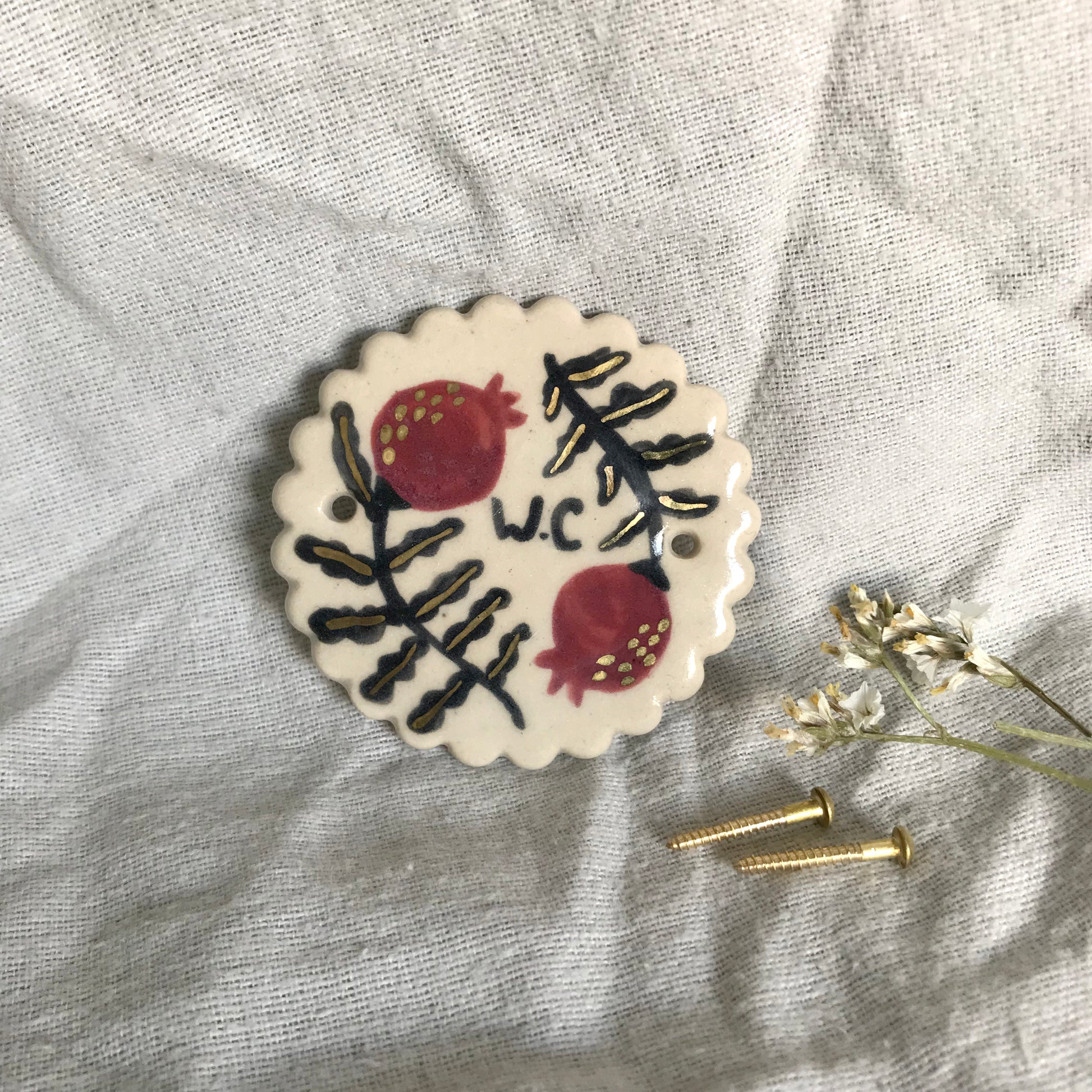 Stoneware 'WC' Bathroom signage with Pomegranate and 24k Gold Lustre.