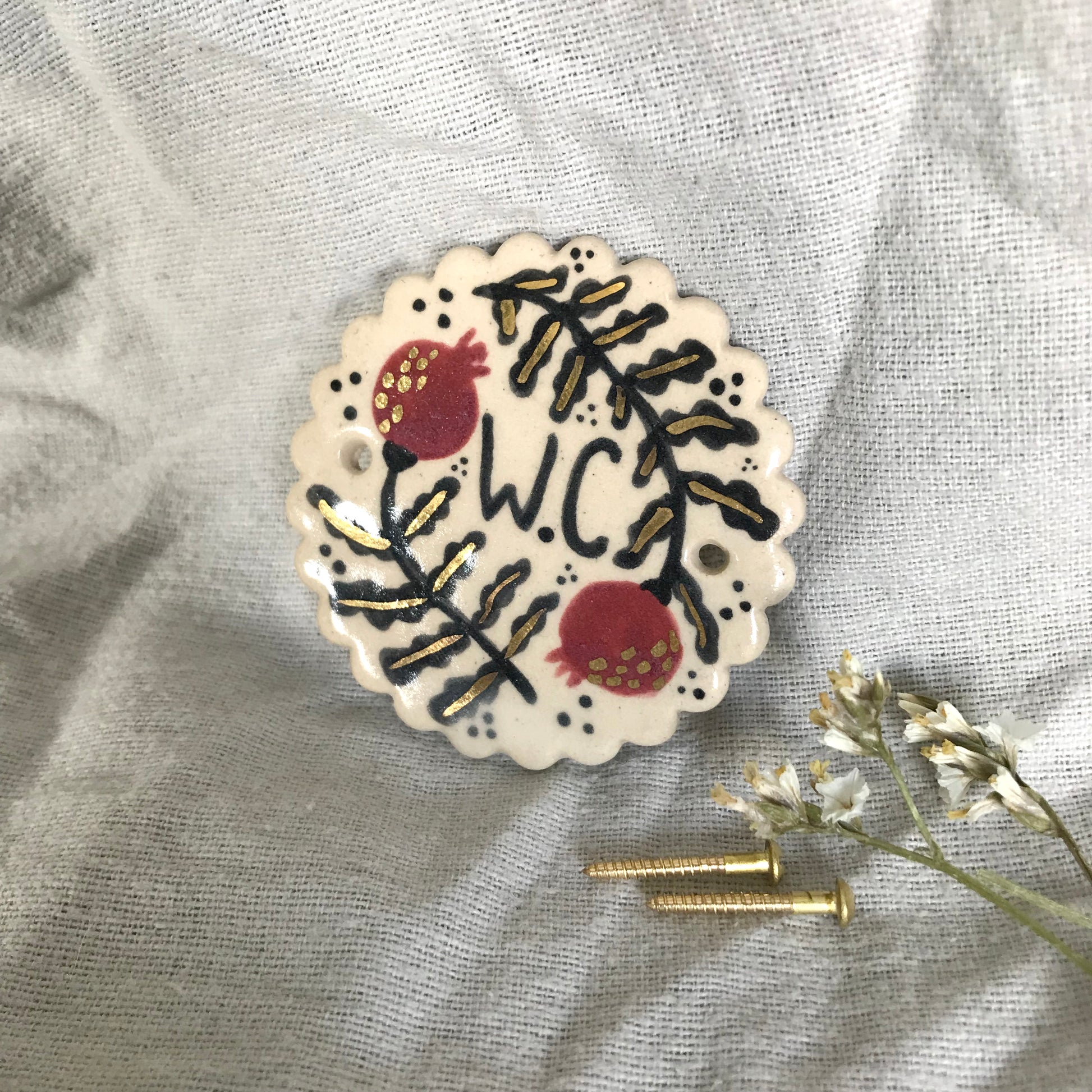 Stoneware 'WC' Bathroom signage with Pomegranate and 24k Gold Lustre.