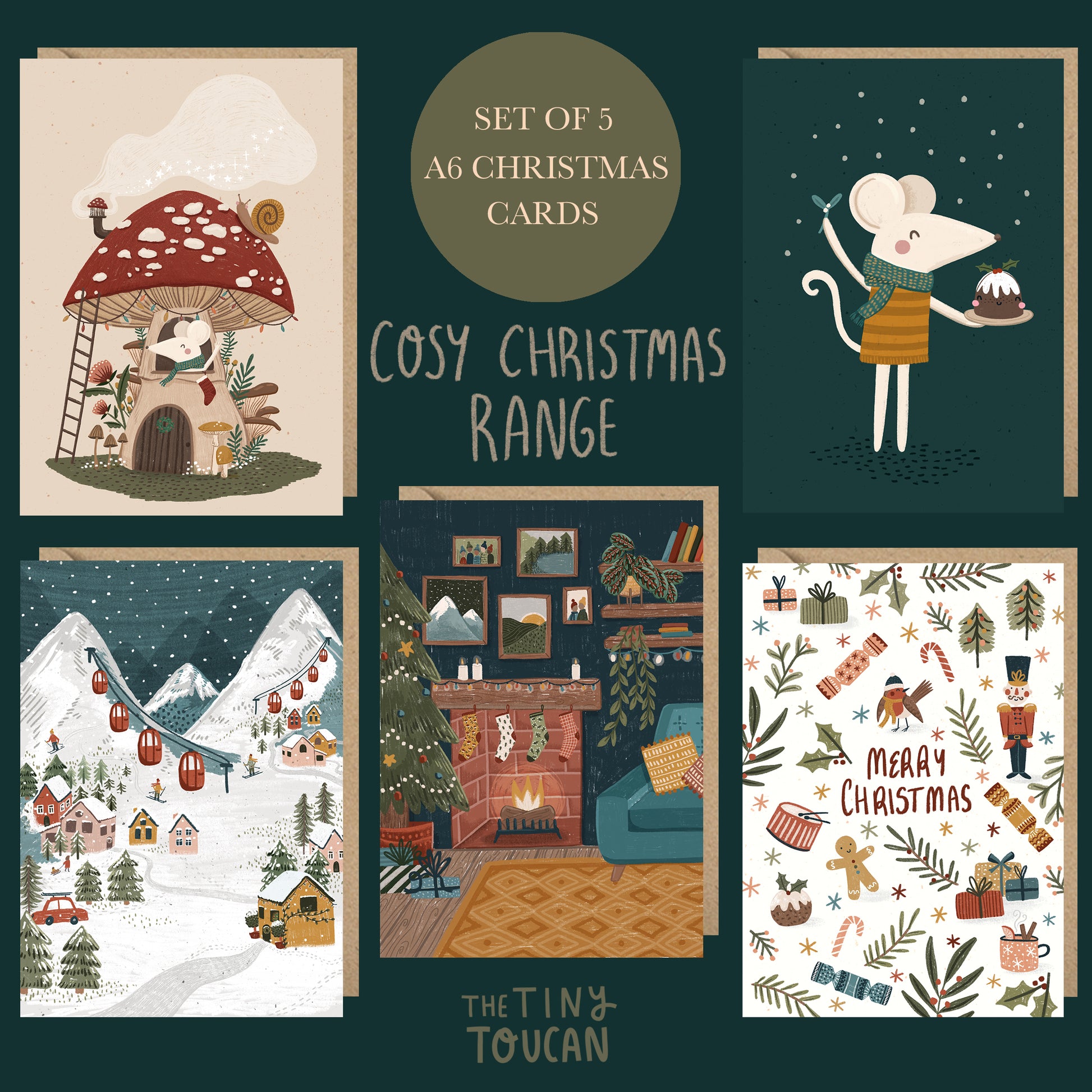 Set of 5 cosy warm Christmas cards. Featuring mushrooms, mice, mountains, ski, cosy living rooms, open fires and all sorts of other cosy winter illustrations.
