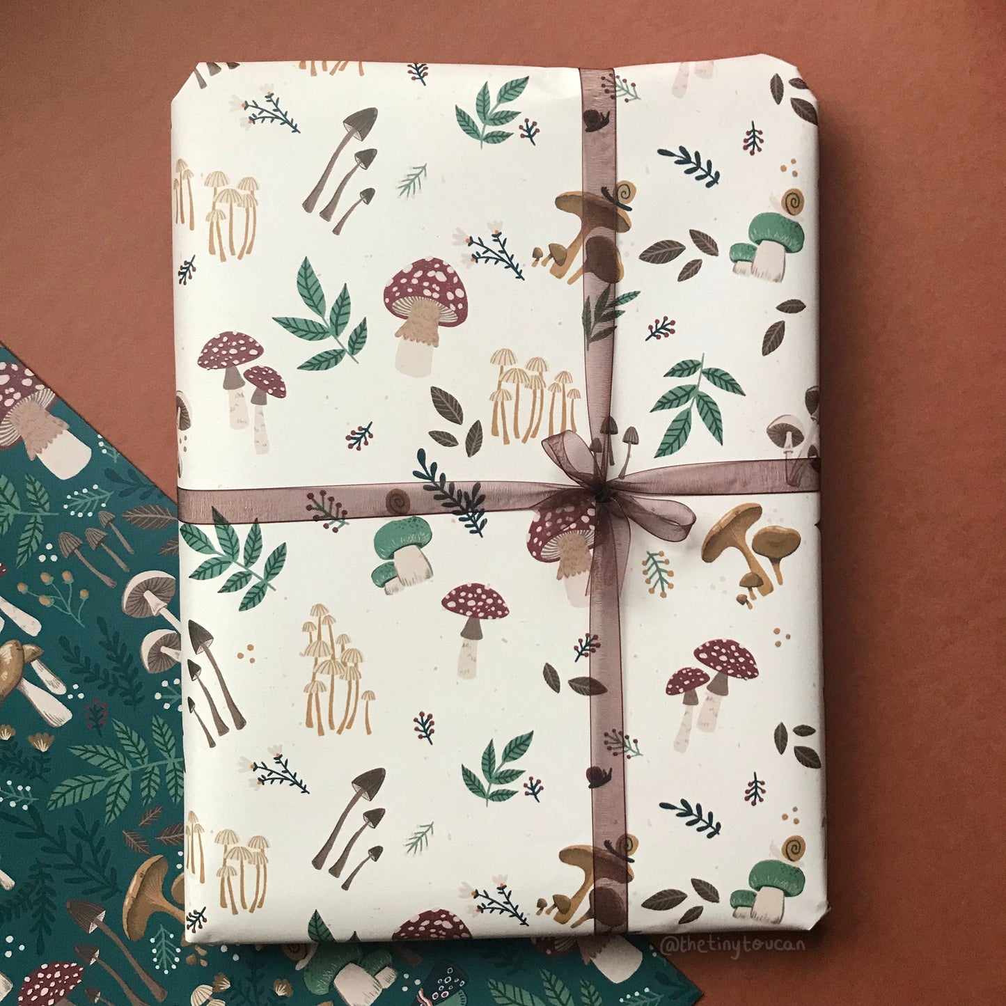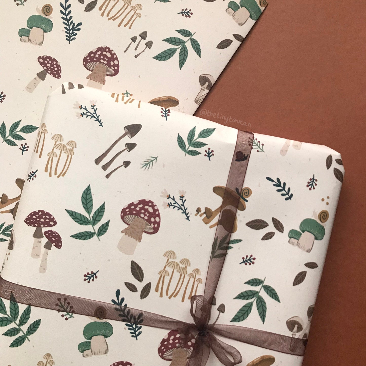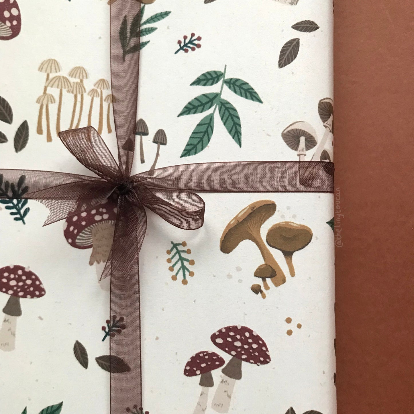 Illustrated cream mushrooms wrapping paper. Printed on sustainably sourced, FSC certified, 100% recyclable, uncoated thick paper. This paper has no plastic coating or foil making it able to be recycled with your normal household card recycling.