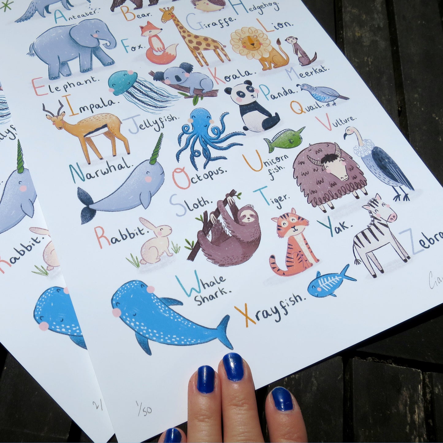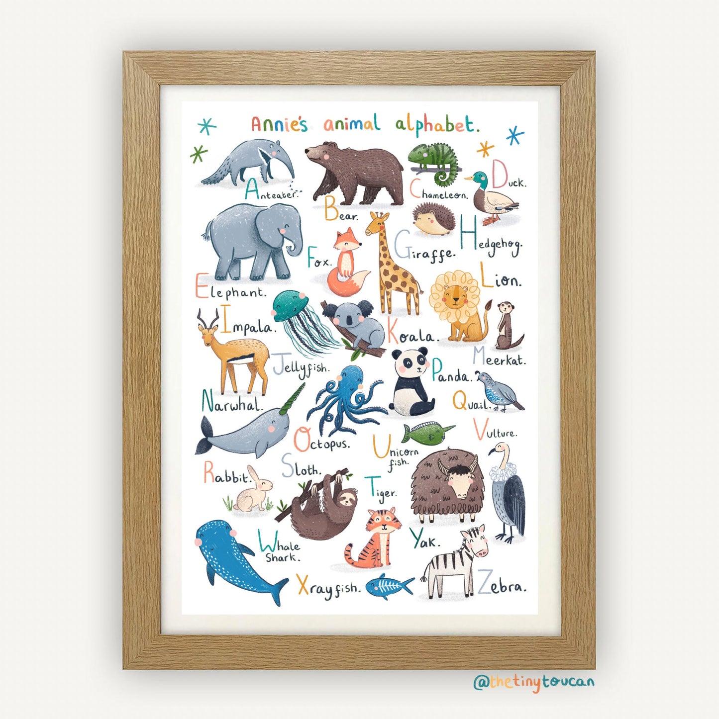 This animal alphabet is fun, educational and gender neutral art options which will add a pop of colour to any Childs bedroom or nursery. A fun way to learn animal names and ABC's with your child and also a lovely keepsake. The custom name option gives this print a lovely personal touch making it a perfect gift.