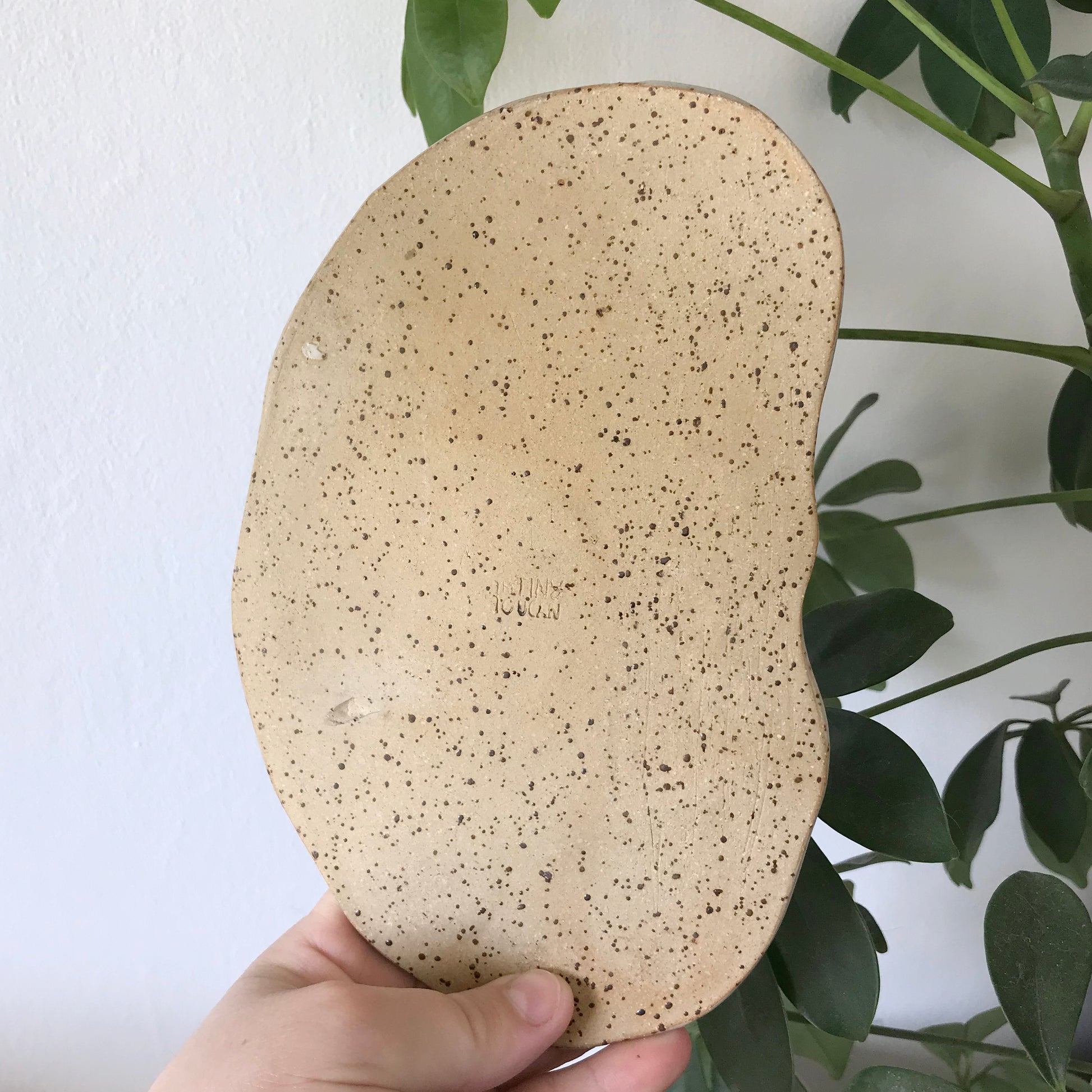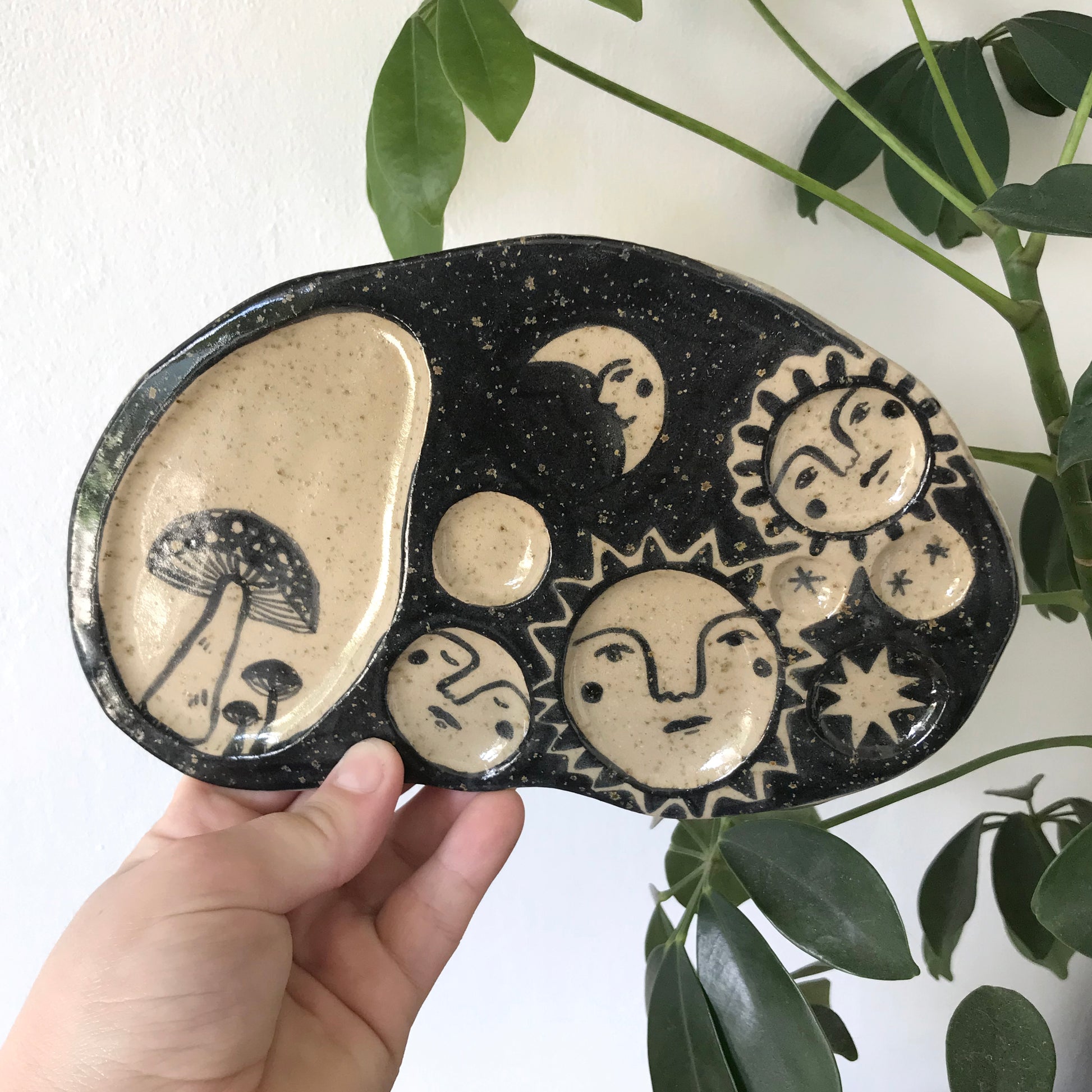 Speckled Stonewear paint palette with hand painted stars, moons, suns with little faces and mushrooms design.