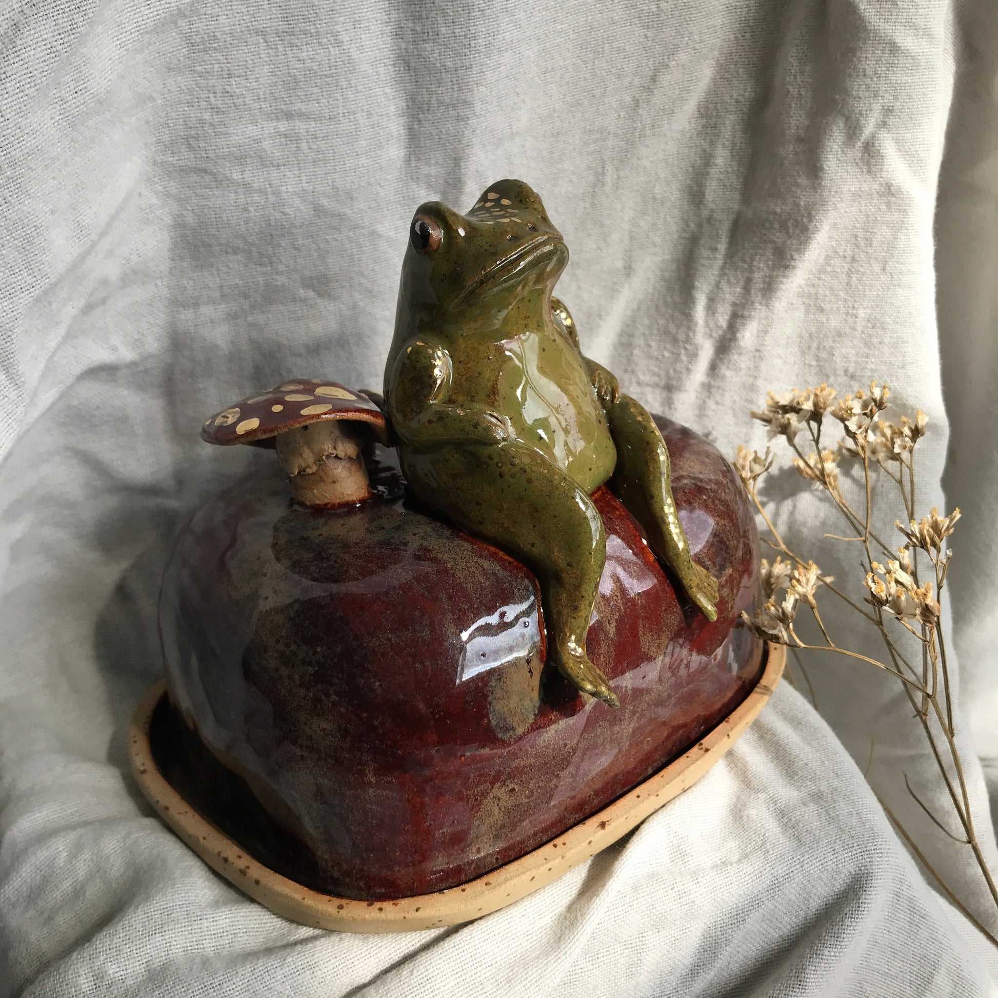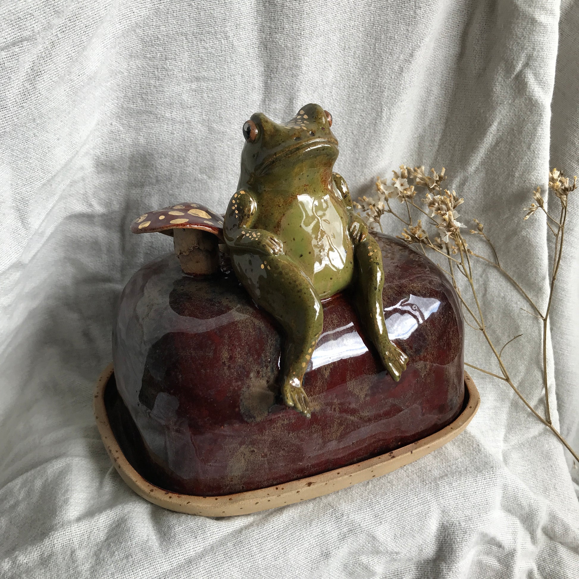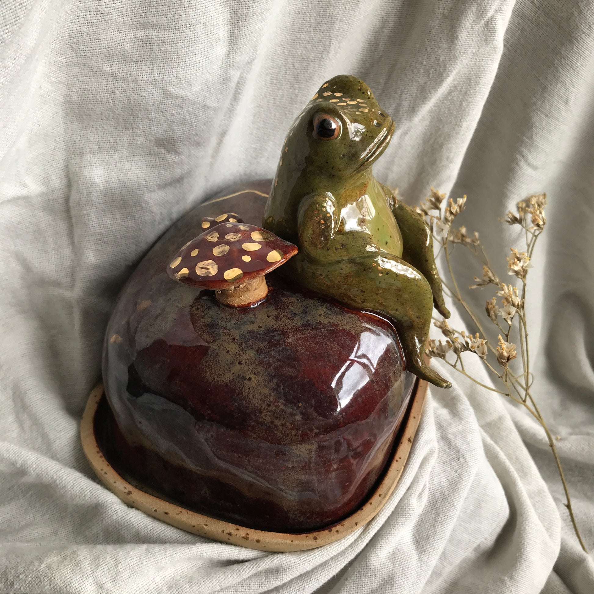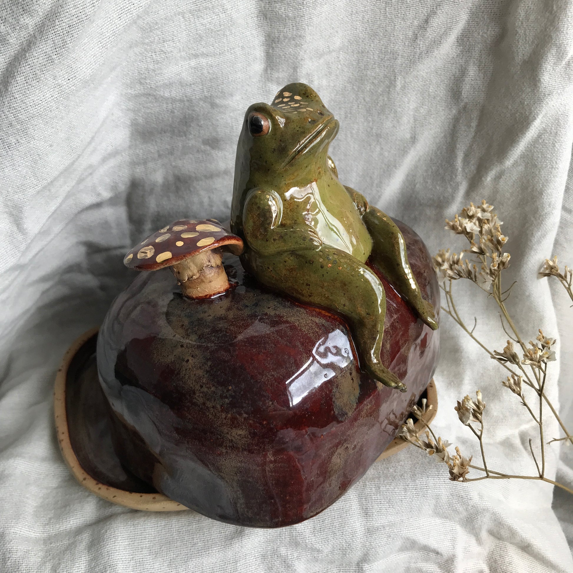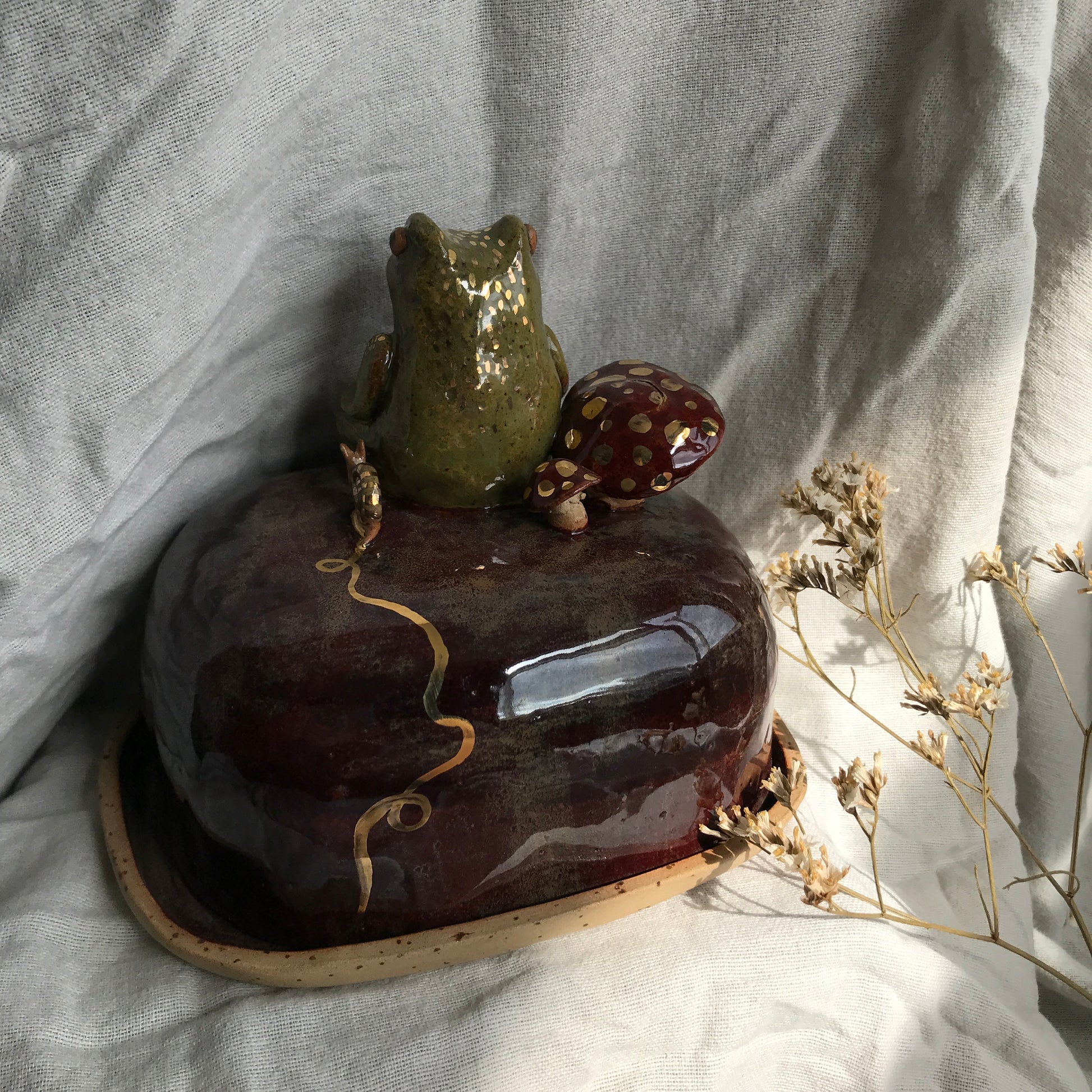 Stoneware butter dish with hand sculpted sitting frog, mushrooms and snail best friend. Glazed with a complex deep red glaze with hints of mustard yellow, greens and browns adding loads of depth. This piece is also finished with real, hand painted 24 karat gold lustre detailing.