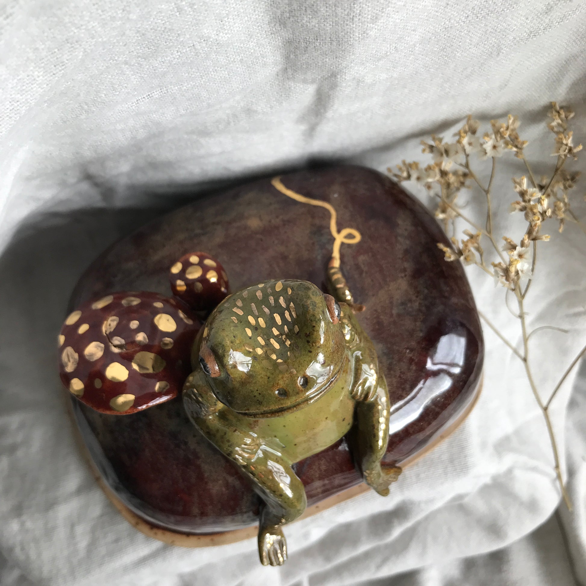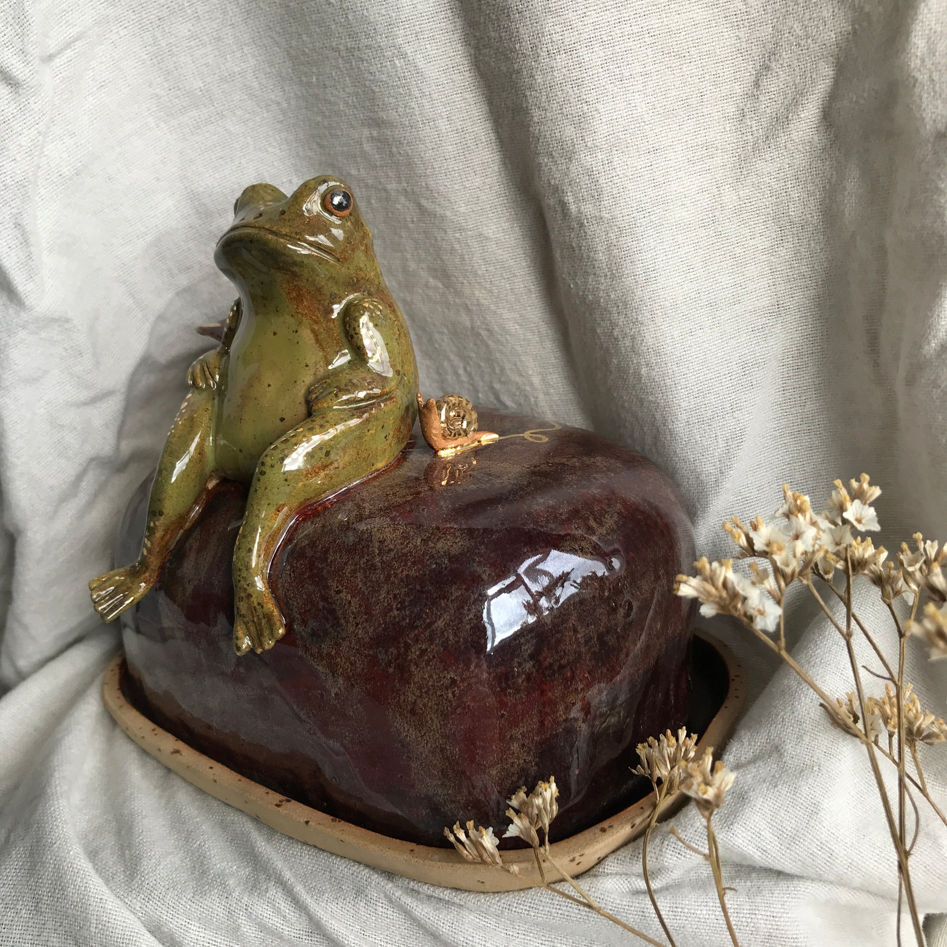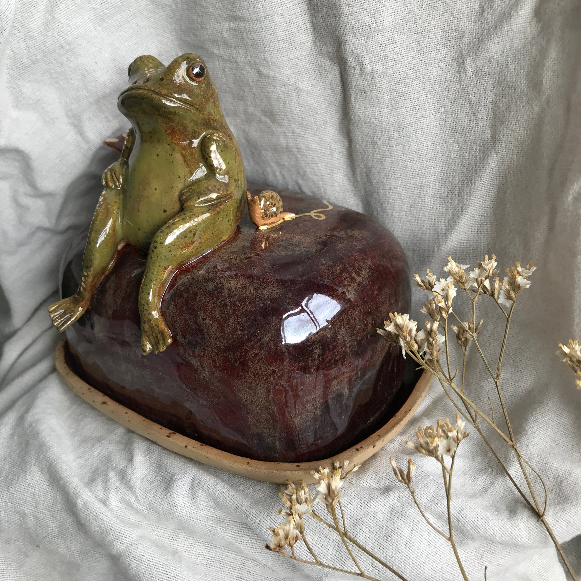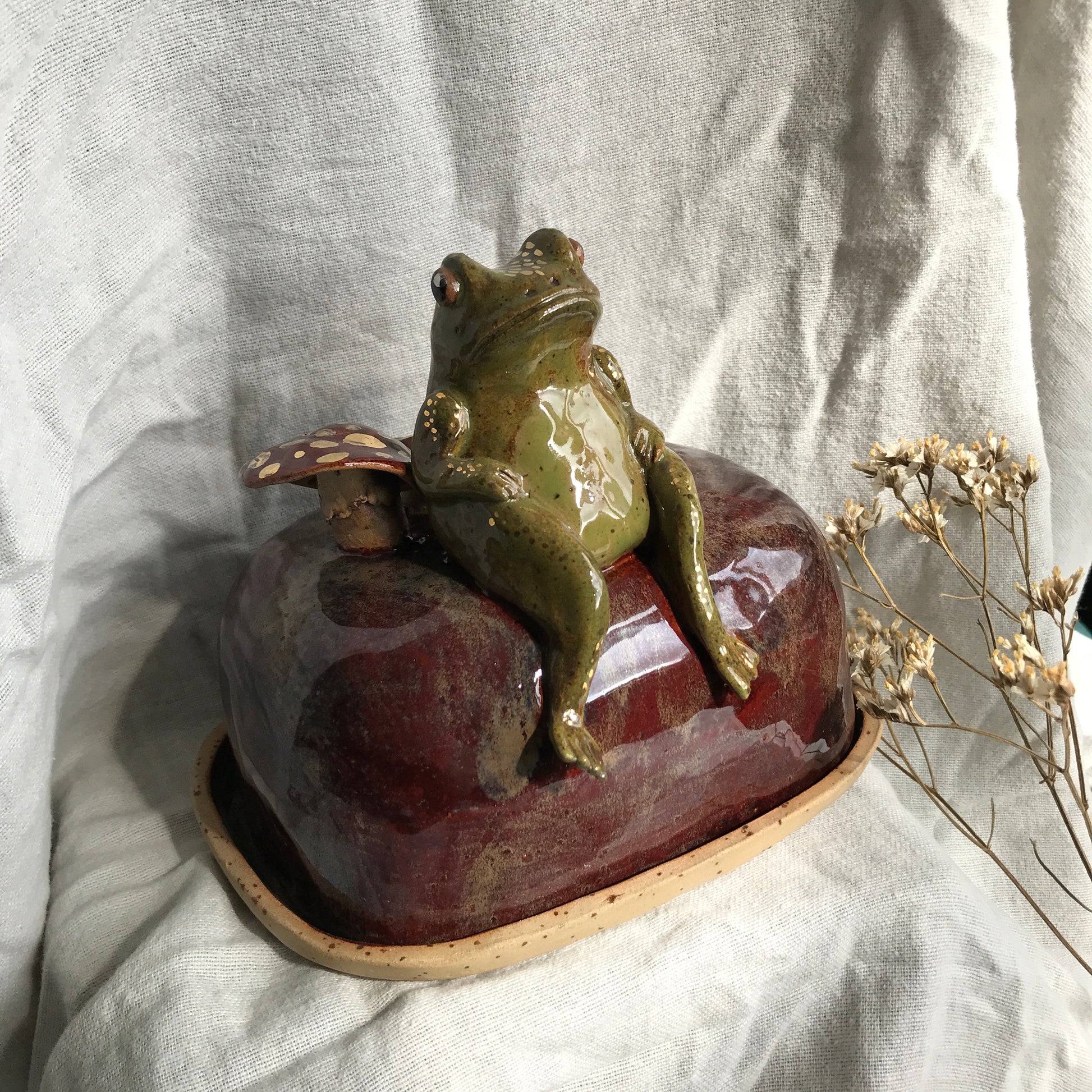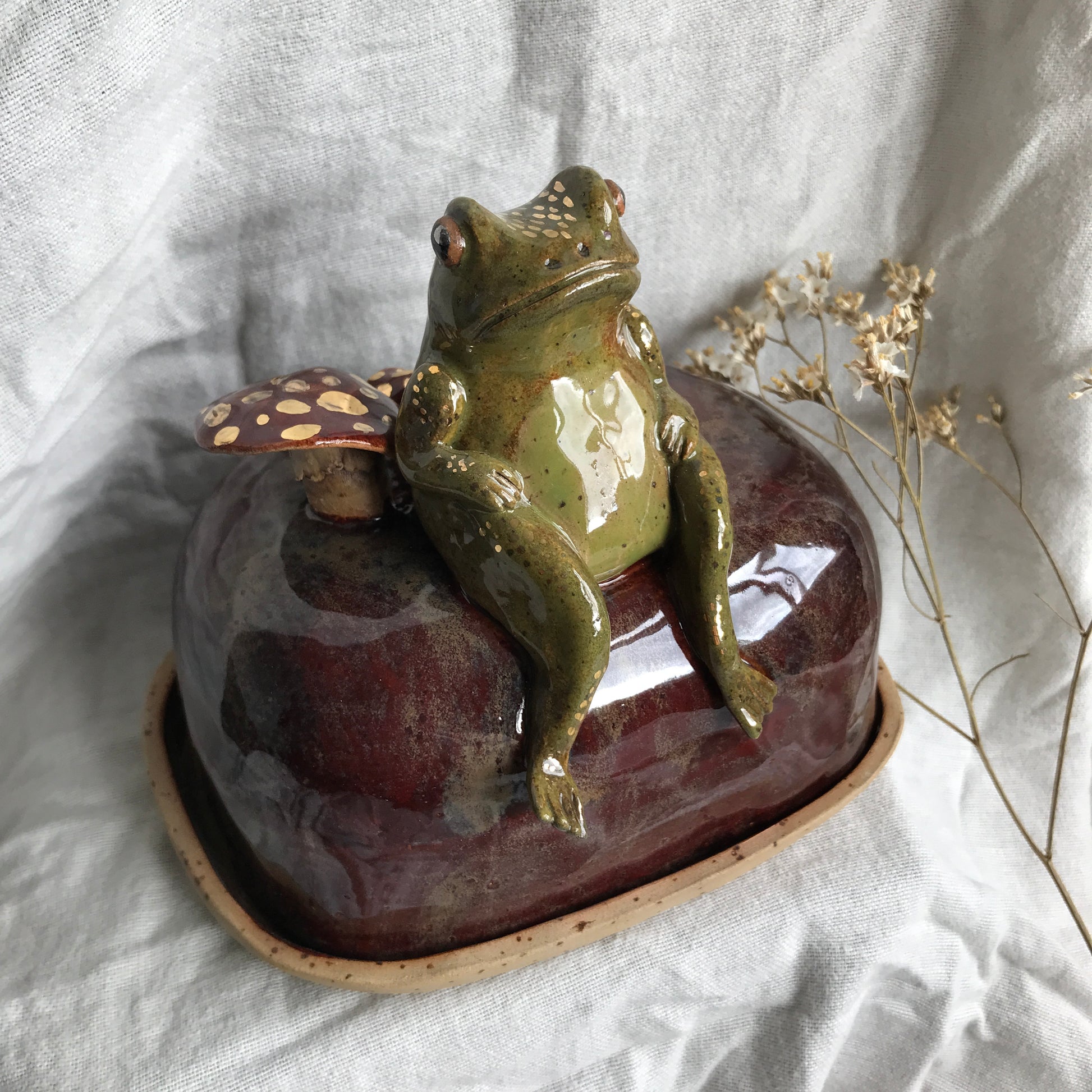 Stoneware butter dish with hand sculpted sitting frog, mushrooms and snail best friend. Glazed with a complex deep red glaze with hints of mustard yellow, greens and browns adding loads of depth. This piece is also finished with real, hand painted 24 karat gold lustre detailing.