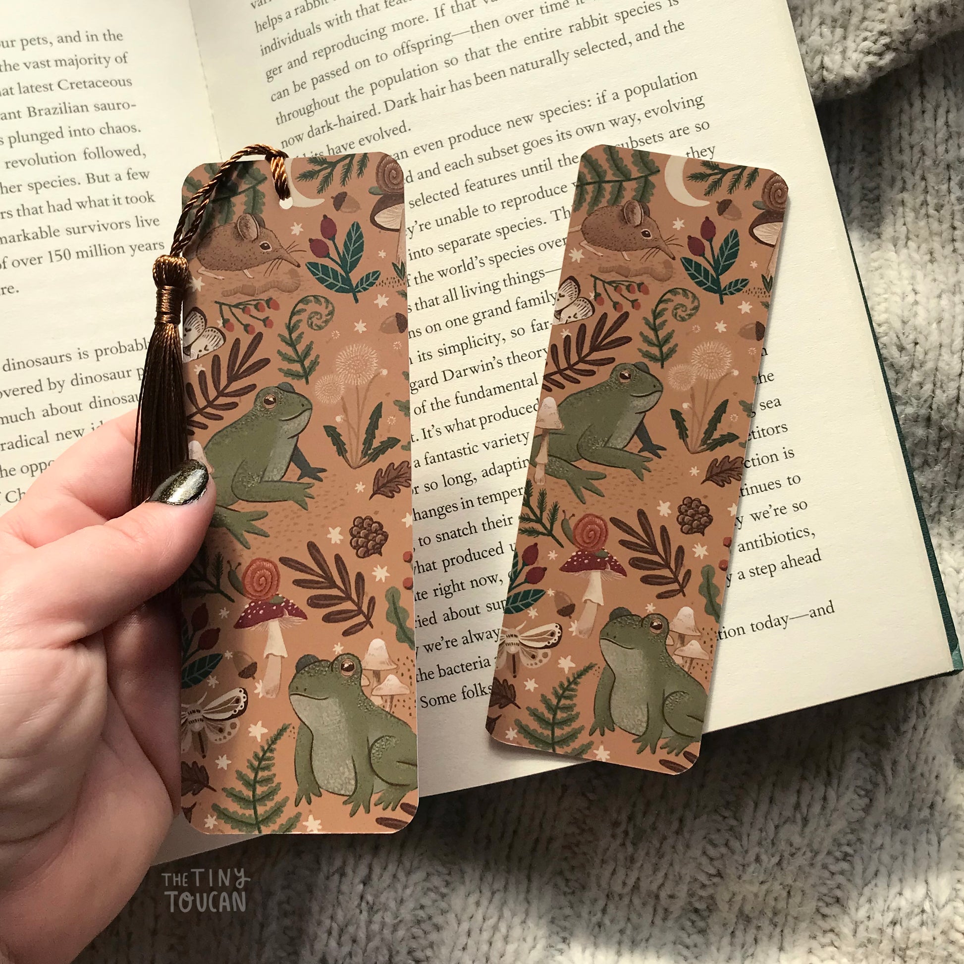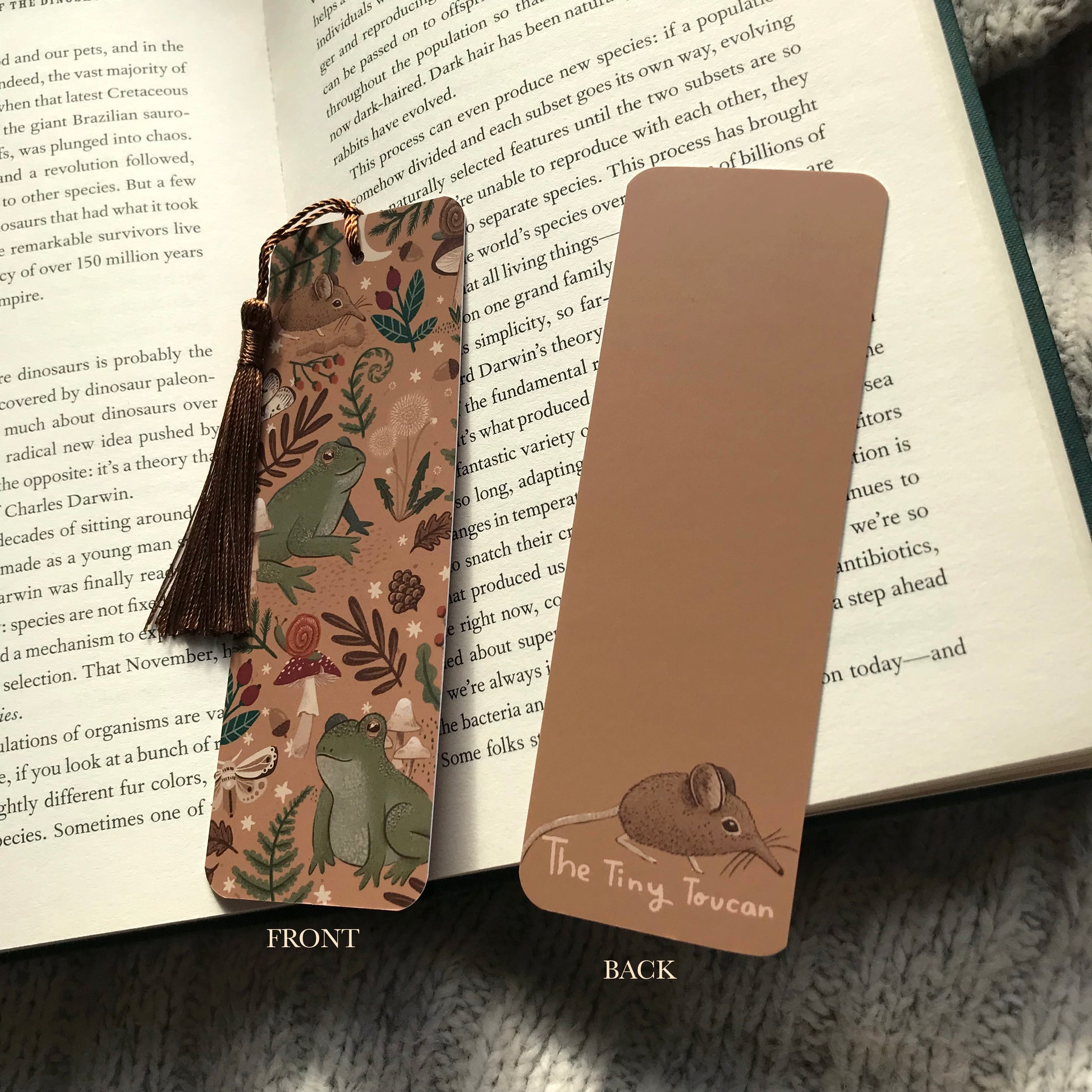 Illustrated autumnal frogs, shrew, mushrooms bookmark available with or without a silky soft tassel.