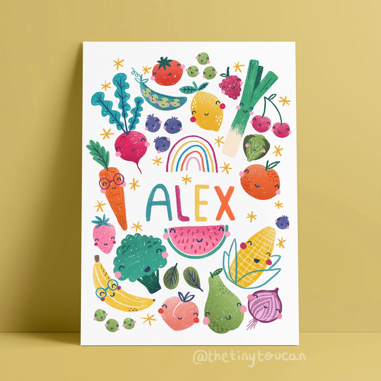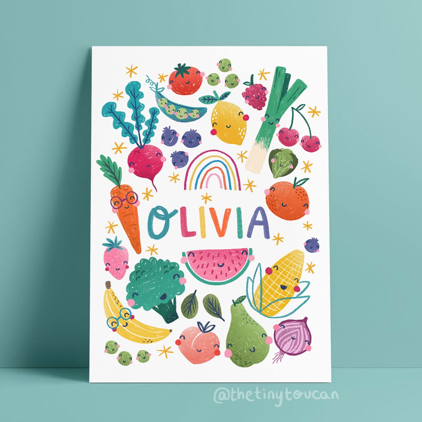 Colourful Fruits and Veggies custom name print! A great gender neutral addition to any nursery and a fun way to learn some fruit and vegetable names!