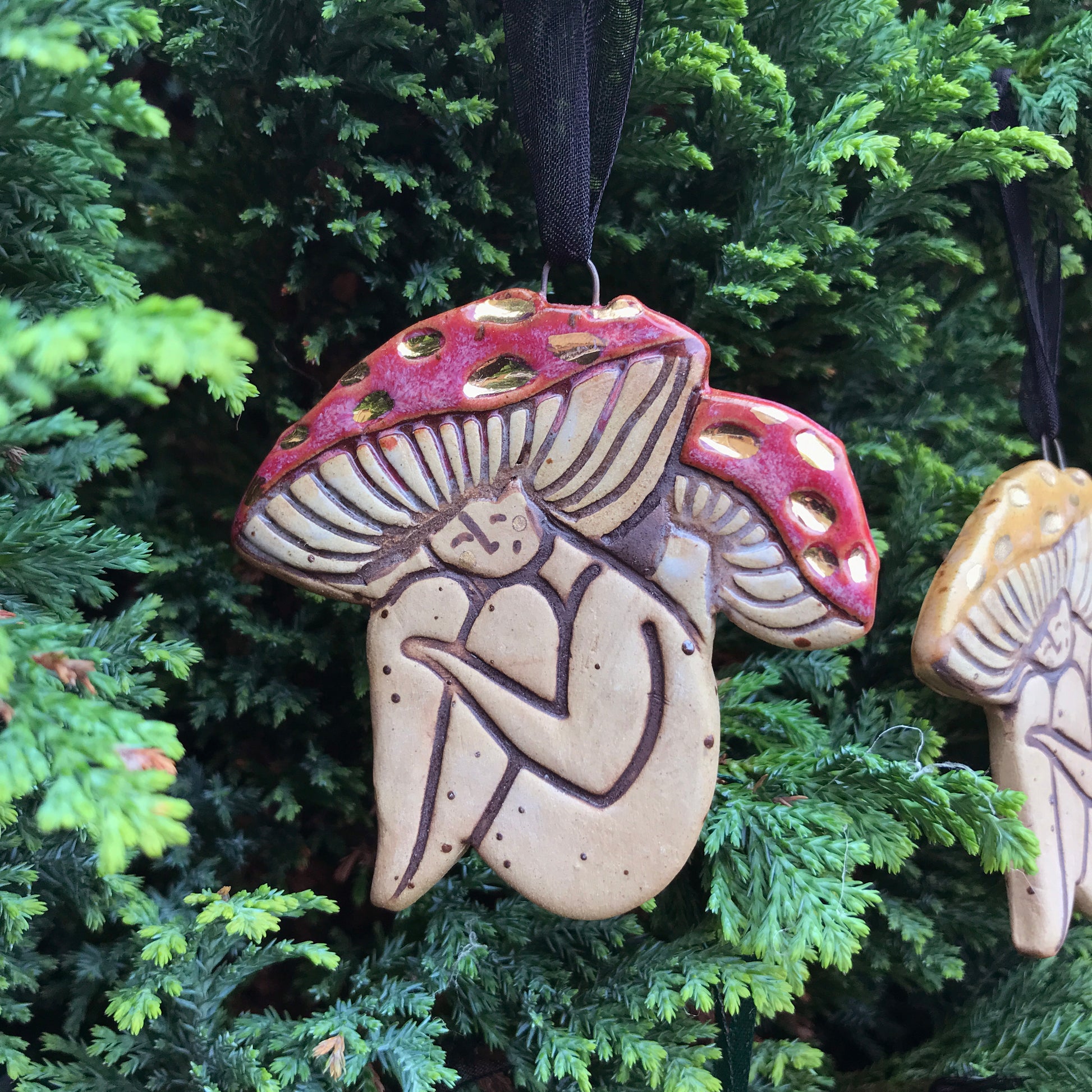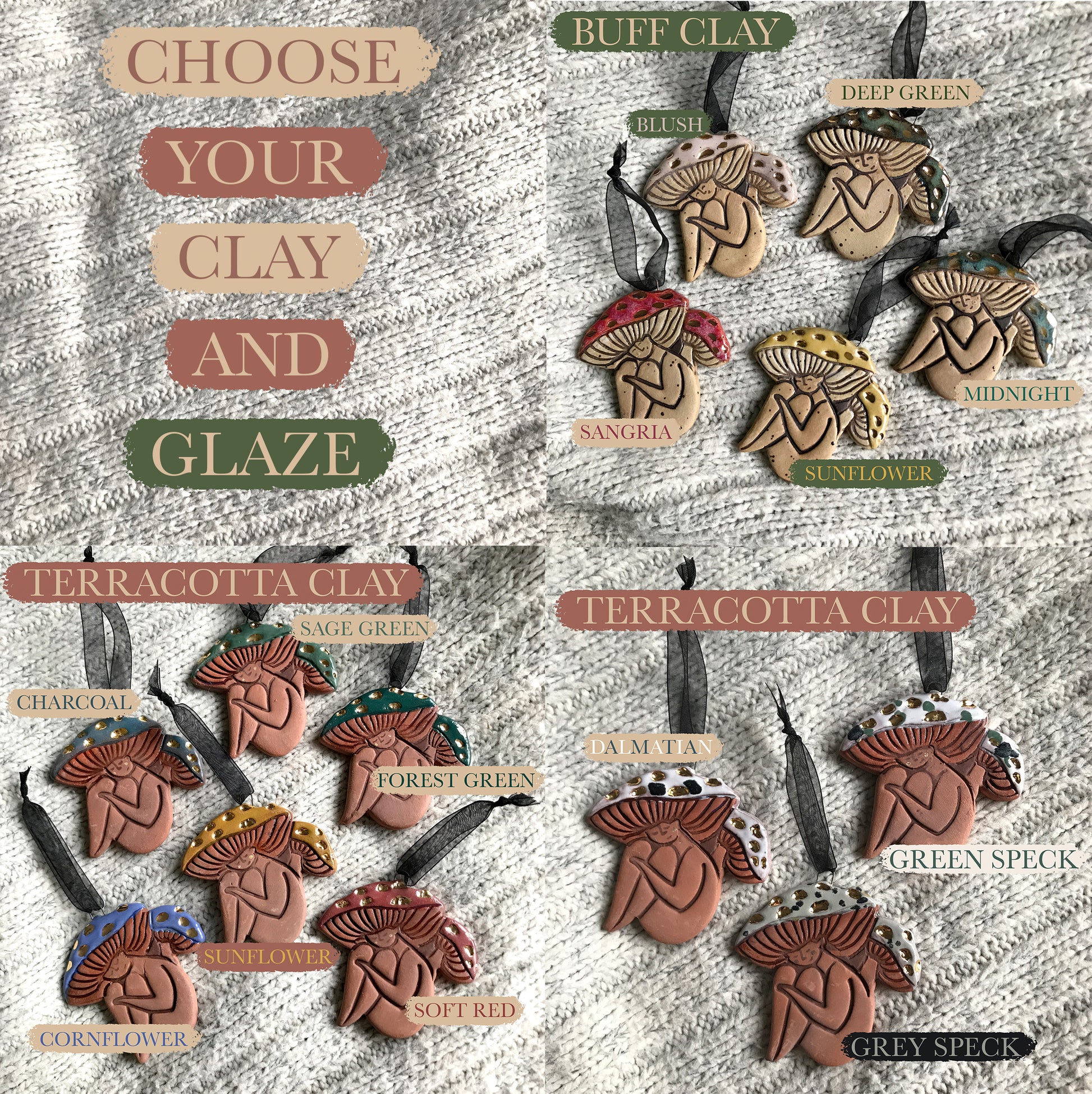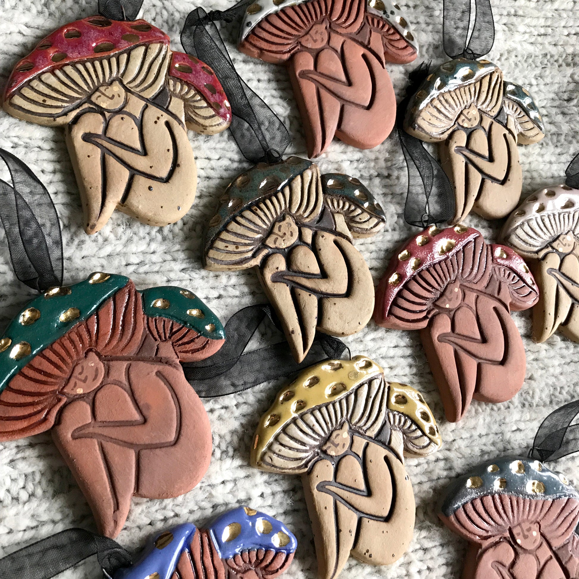 These Fungi folk decorations have been a joy to create. Starting as a pencil sketch, to a full illustration and now a hand made, hand painted, ceramic ornament hand made from reclaimed clay. It has been magical developing them to their final mushie form. Every colour mushroom capped beauties finished with real 24k Gold lustre.