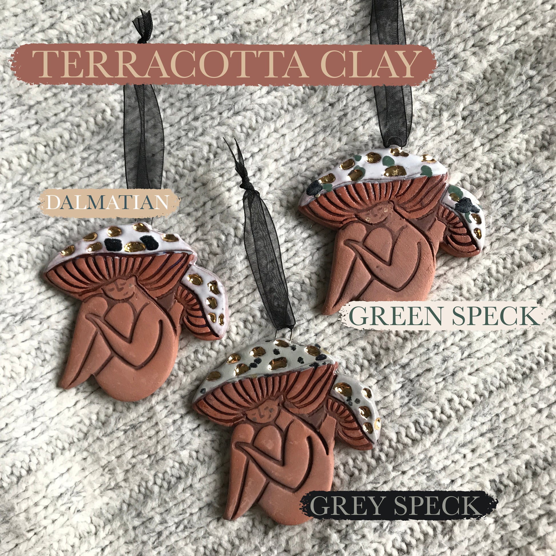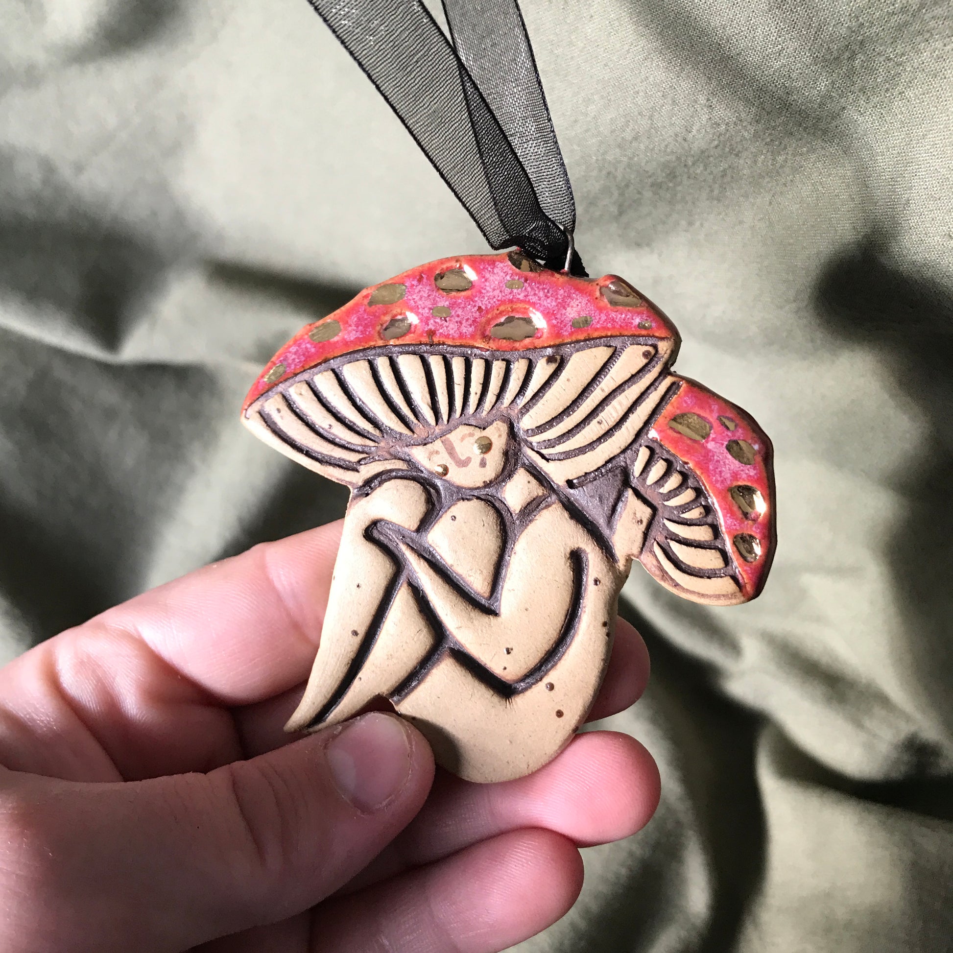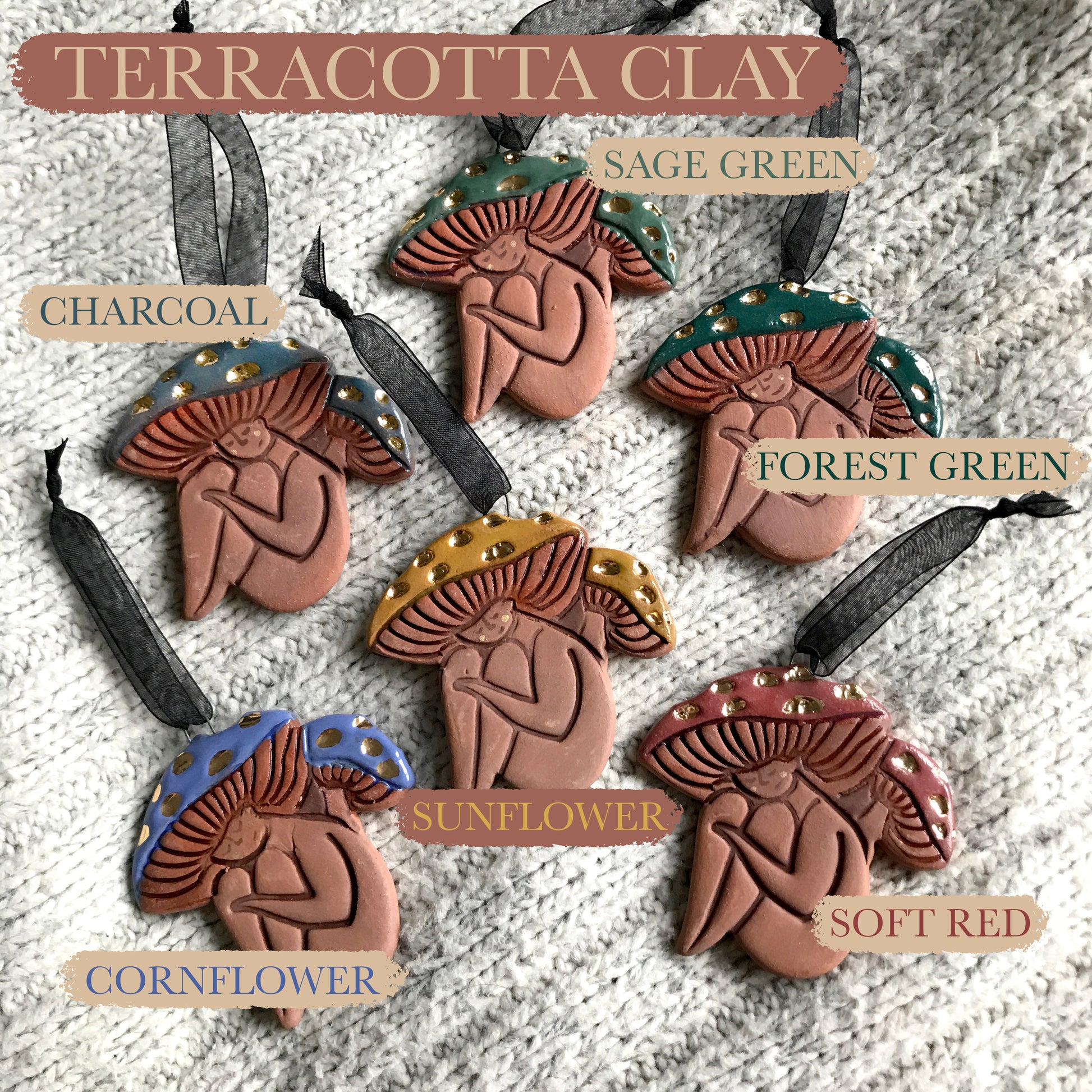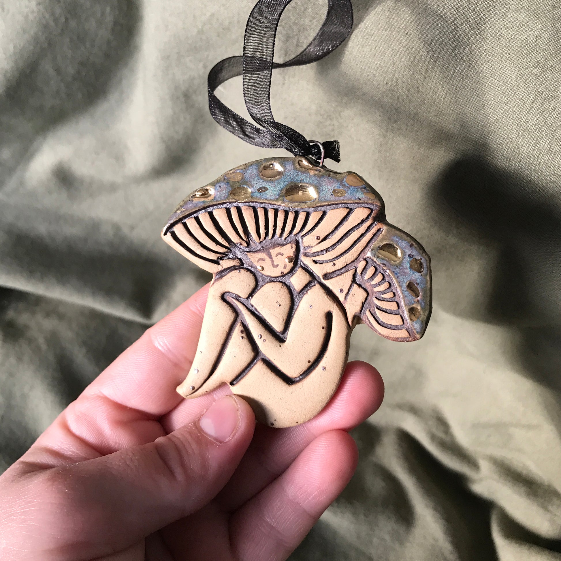 These Fungi folk decorations have been a joy to create. Starting as a pencil sketch, to a full illustration and now a hand made, hand painted, ceramic ornament hand made from reclaimed clay. It has been magical developing them to their final mushie form. Every colour mushroom capped beauties finished with real 24k Gold lustre.