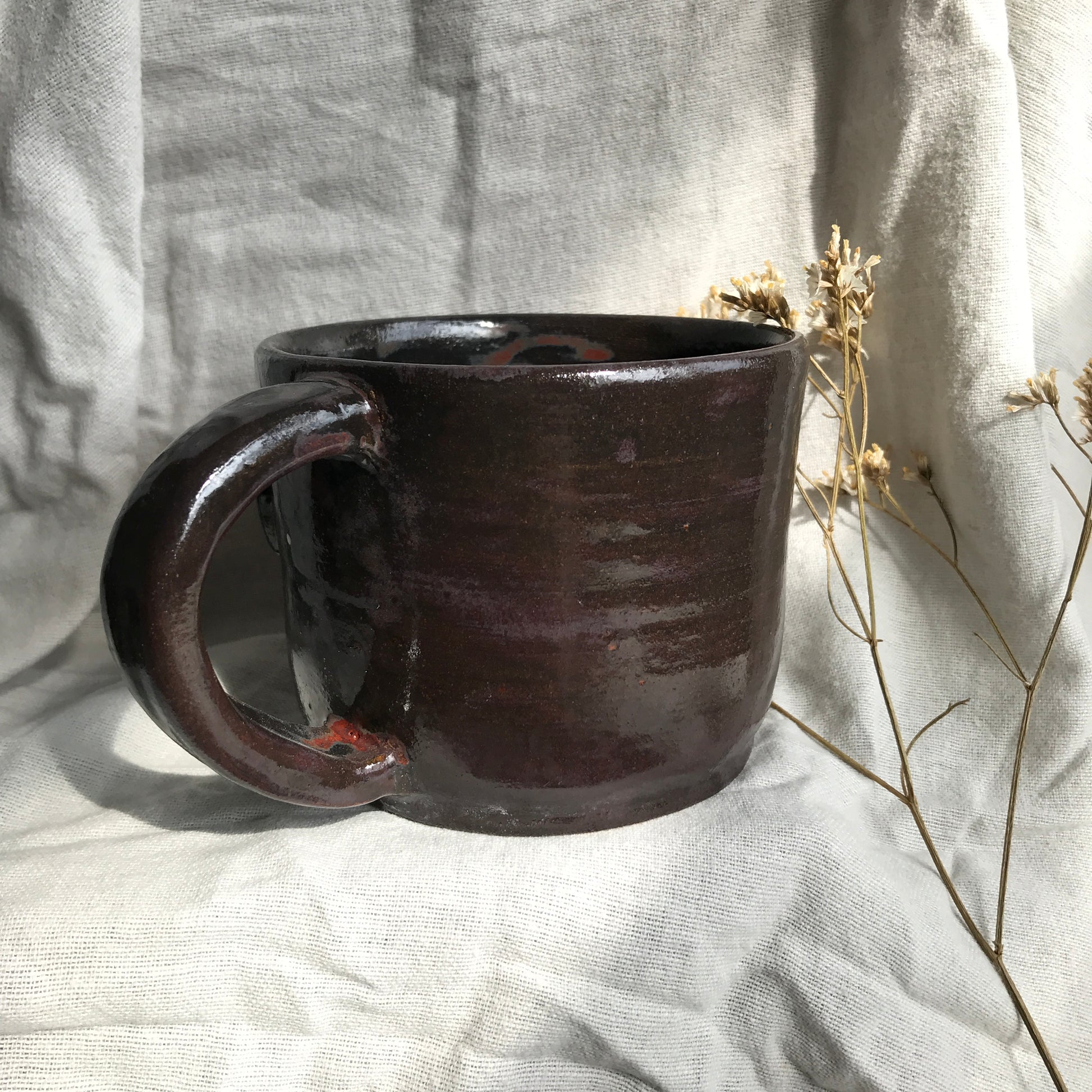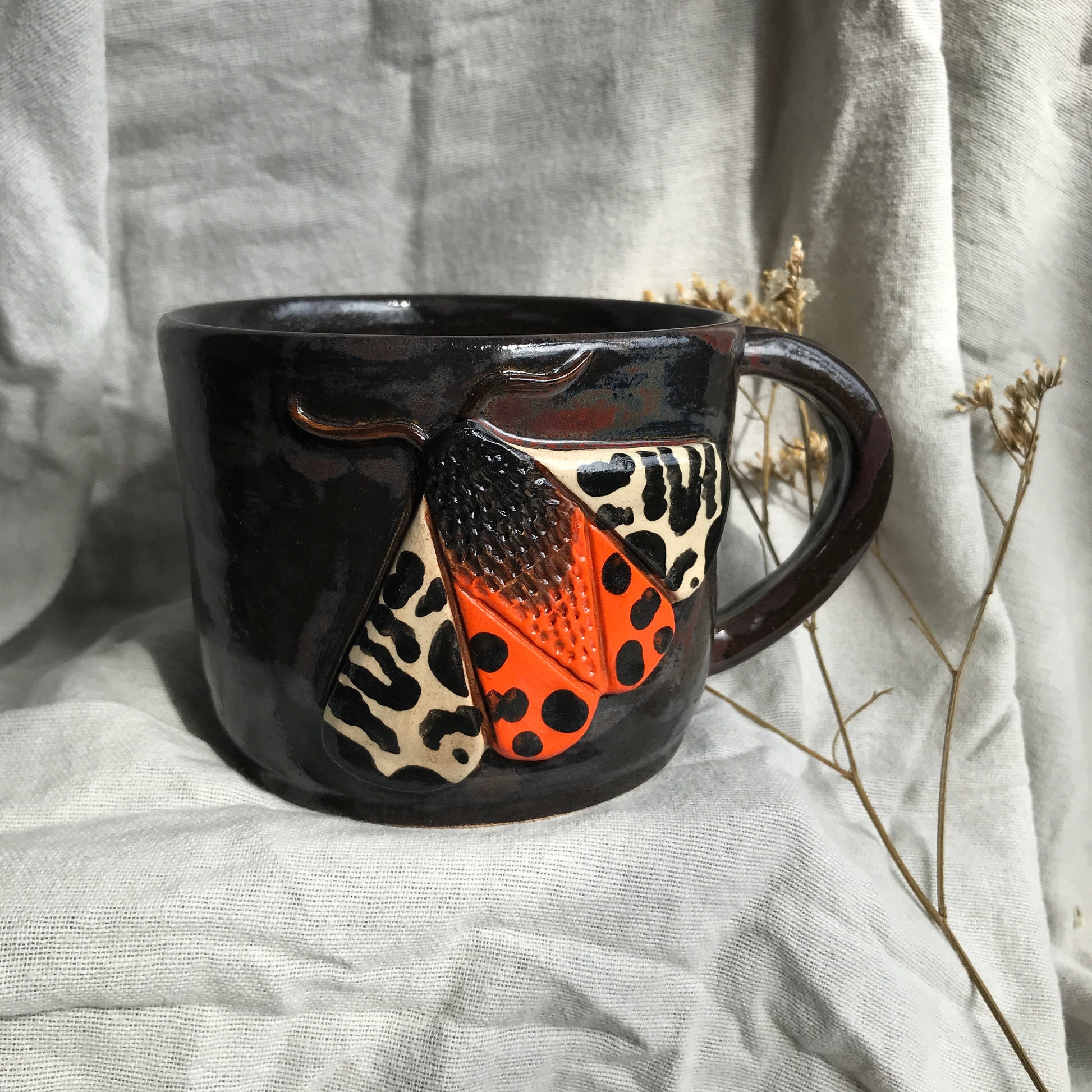 Stoneware mug with hand sculpted Garden tiger moth featuring an interesting Ancient Ore glaze, a warm earthy colour with flashes or deep reds and greens and colourful underglaze moth details. Also available in Firebrick Red and Ancient Ore colours.
