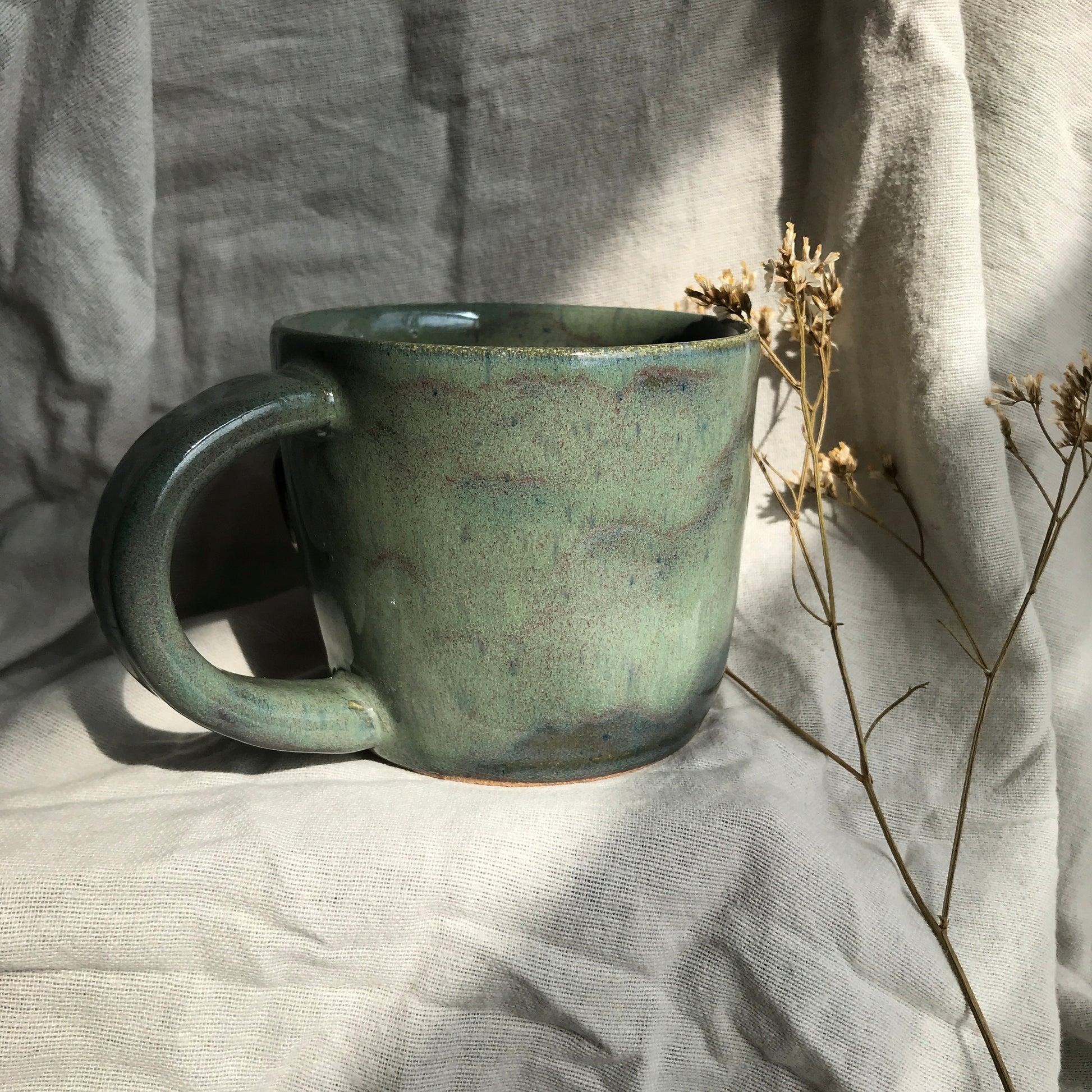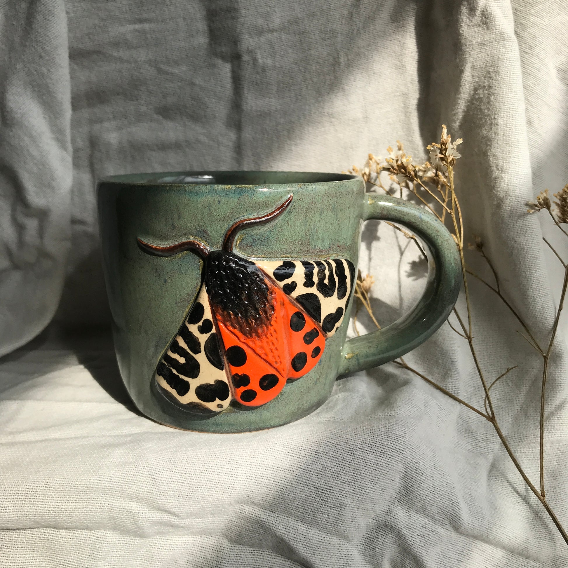 Stoneware mug with hand sculpted Garden tiger moth featuring a Sage Green glaze and colourful underglaze moth details. Also available in Firebrick Red and Ancient Ore colours.