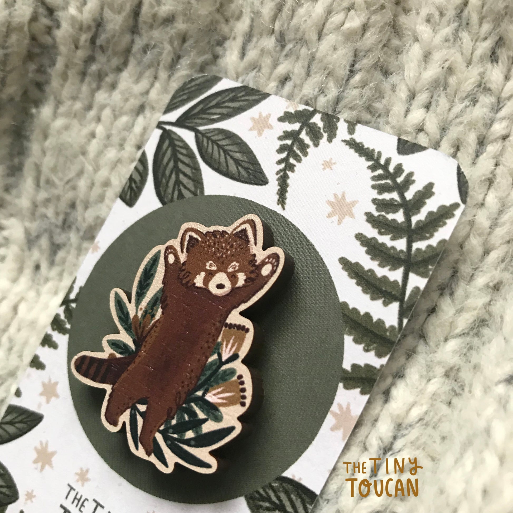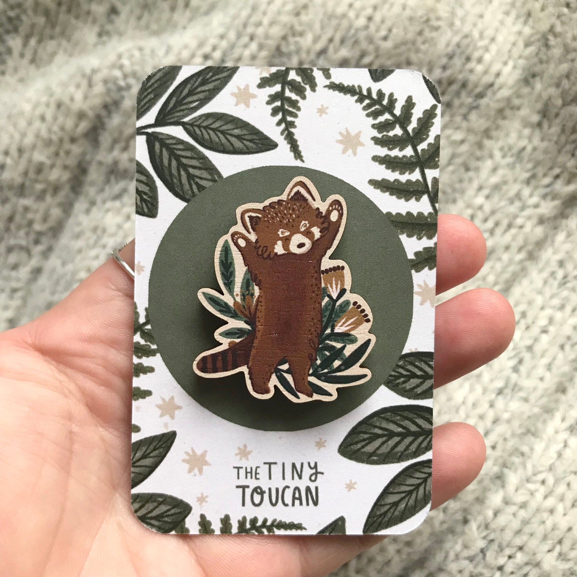 Excited little red panda with their little paws in the air, illustrated wooden pin.