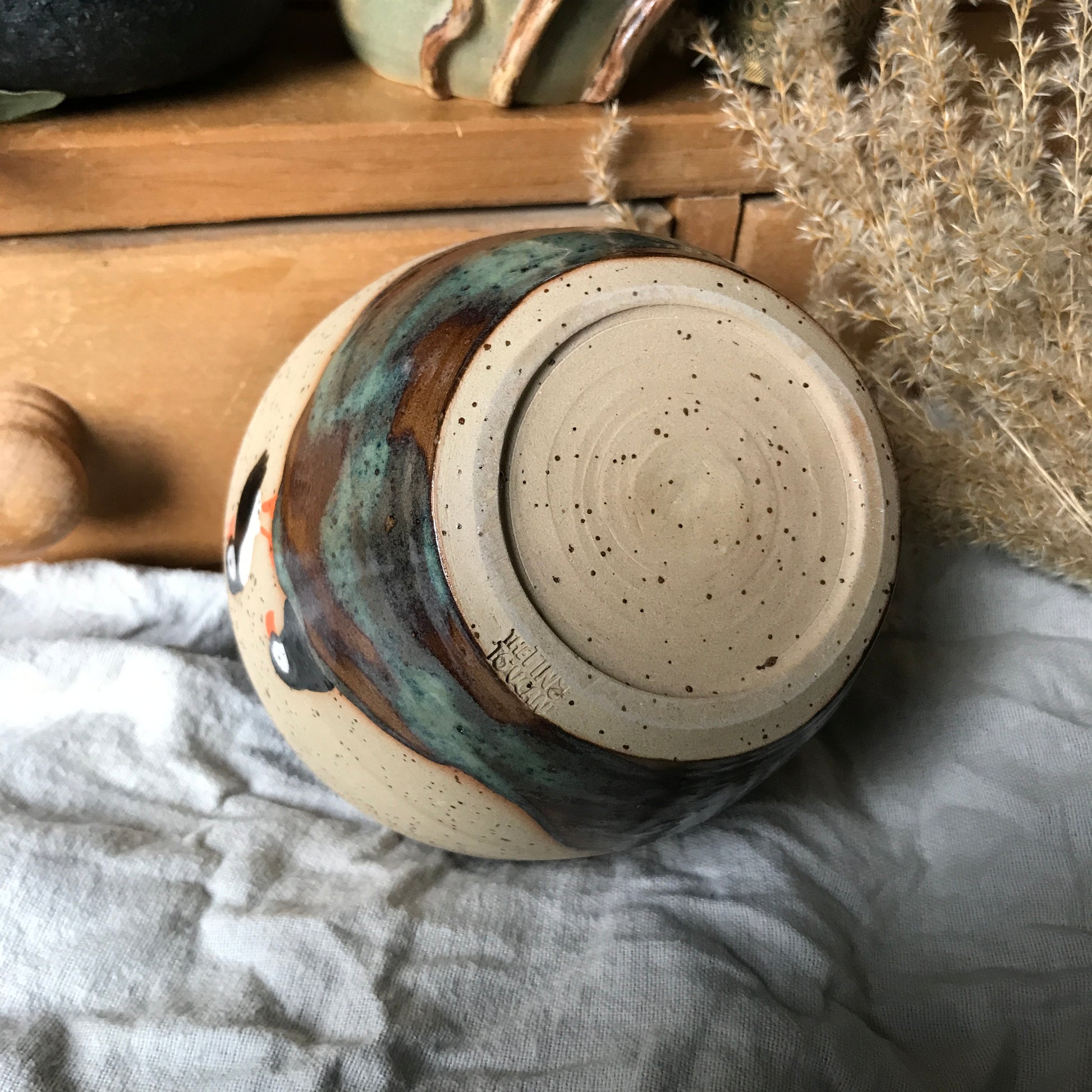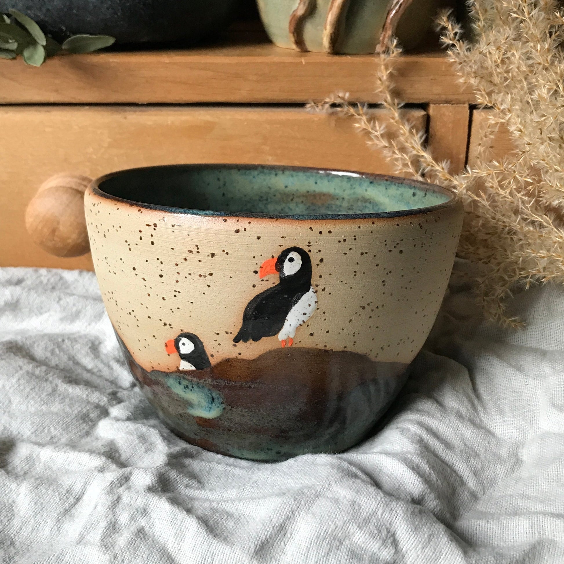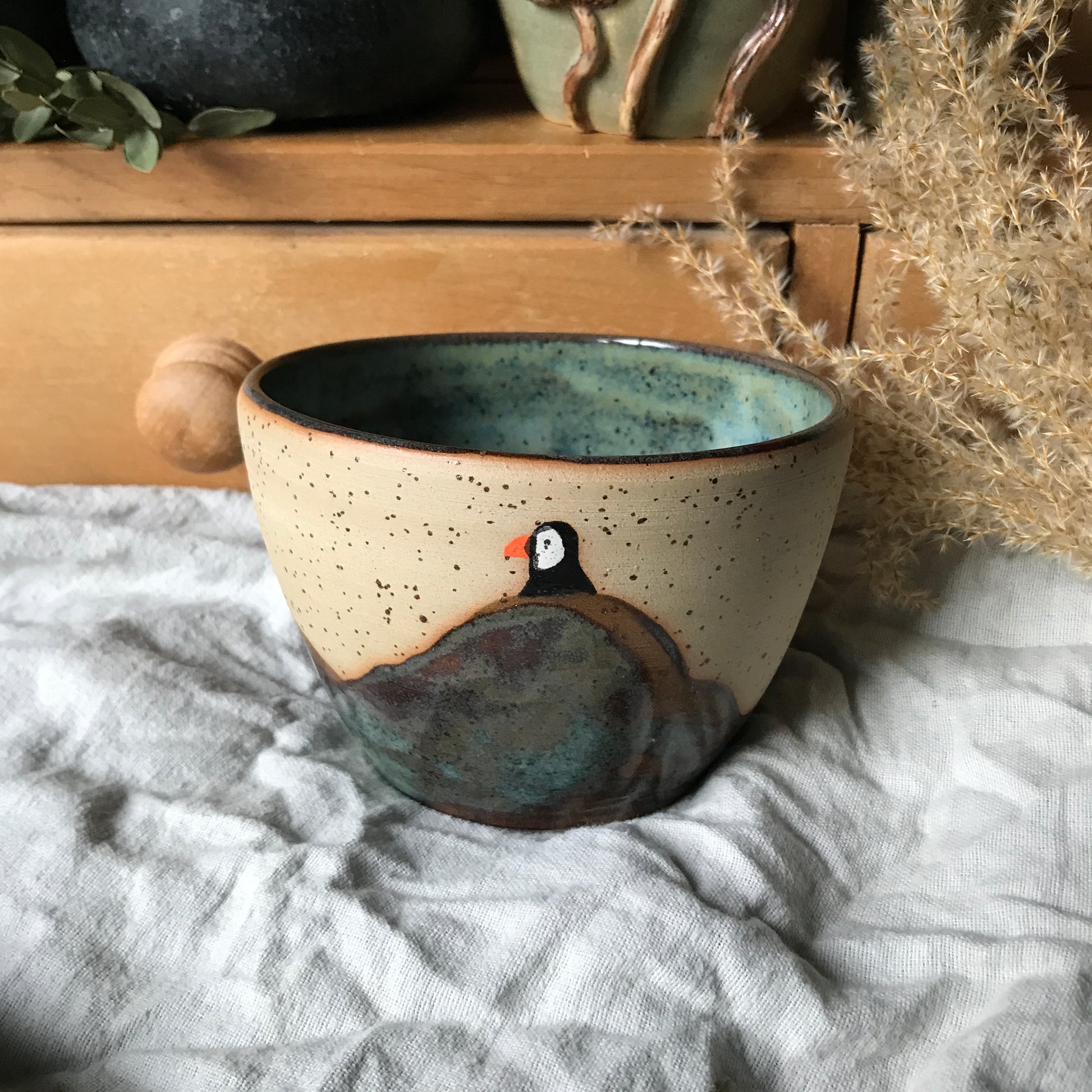 Thrown stoneware bowl with hand painted Puffin illustrations.
