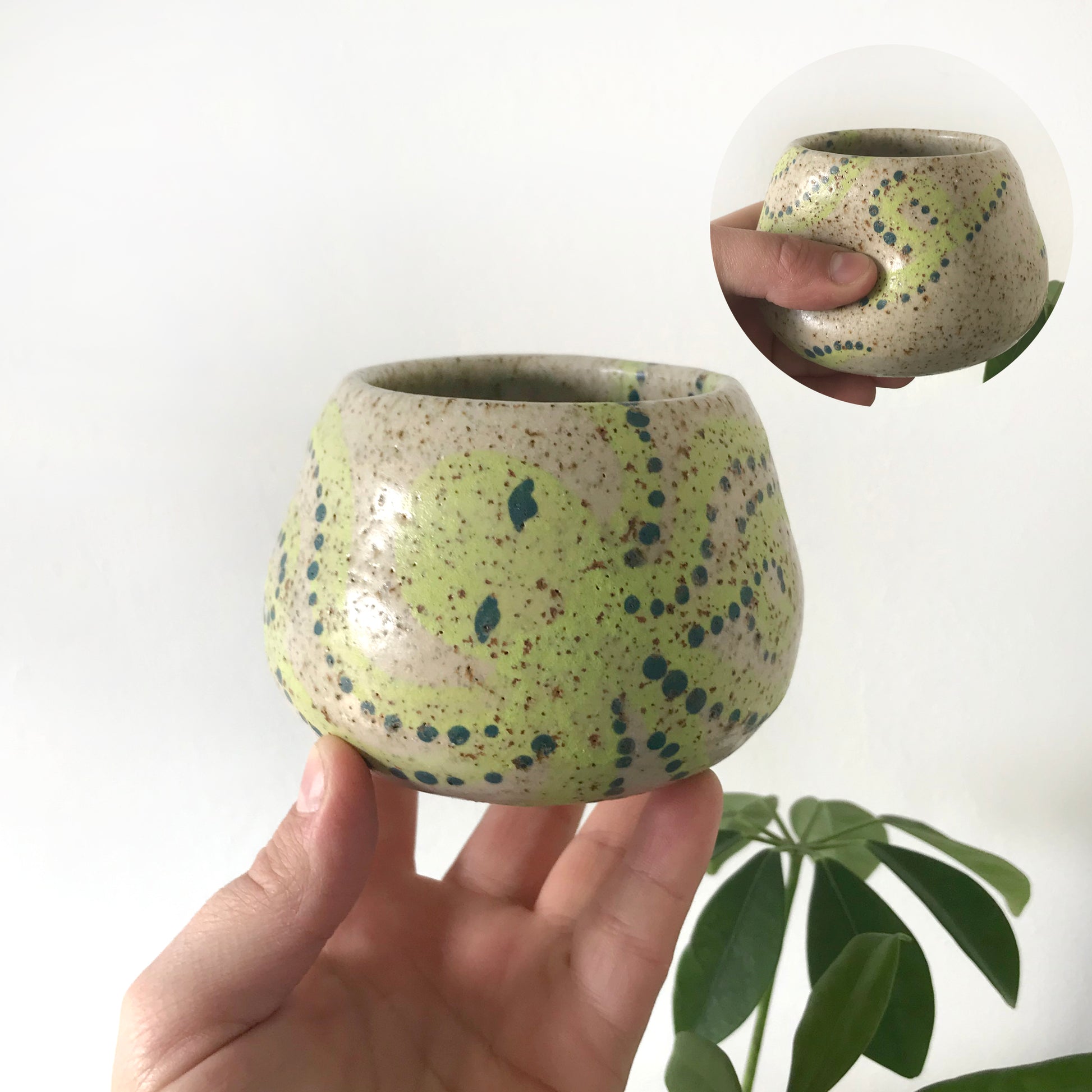 Stoneware handle-less mug with thumb dimple perfect for tea, sake, or a short coffee.