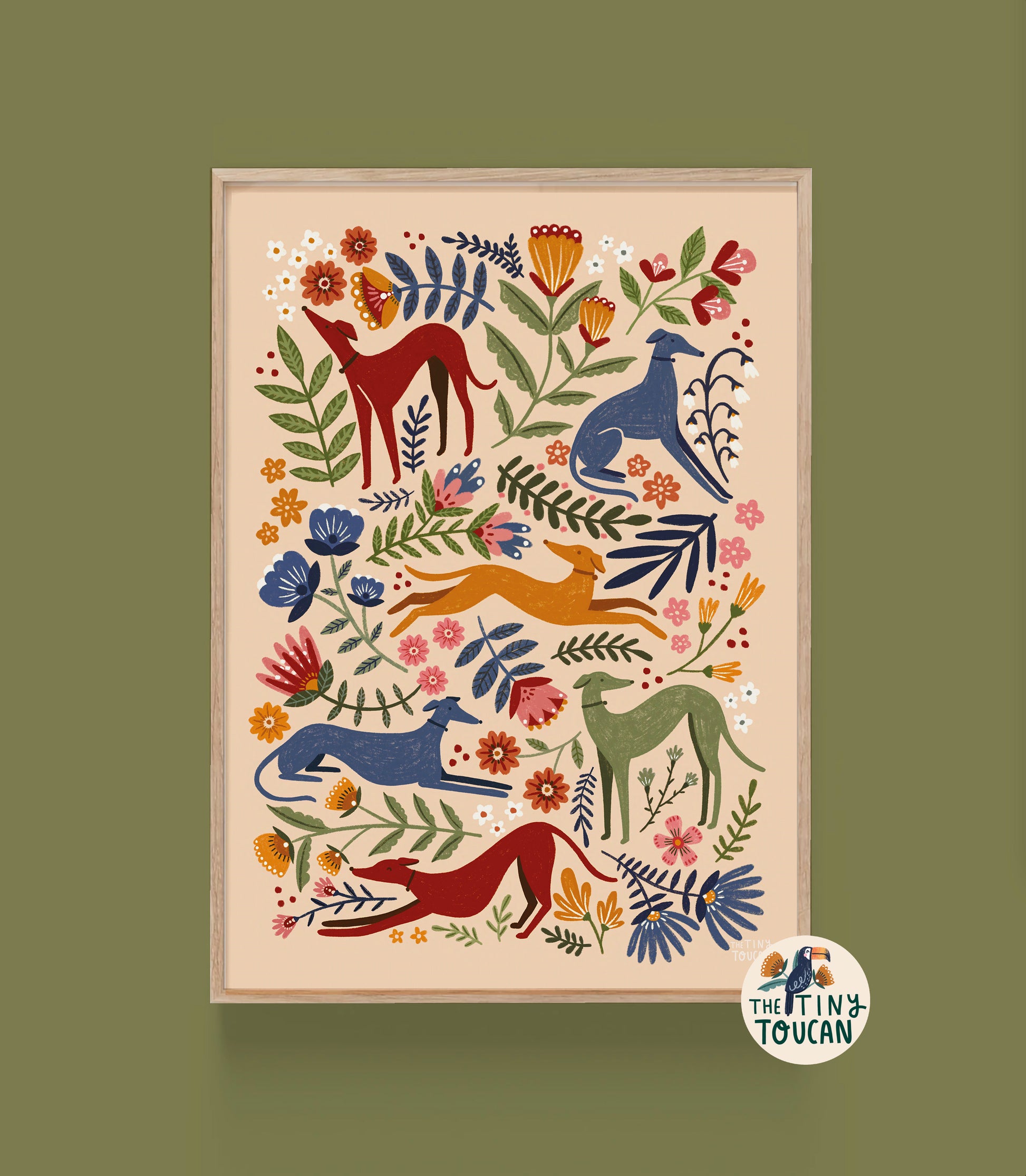 Pretty illustrated art print inspired by long dog, whippet, greyhound, lurcher, salukis. Something to capture their goofy, loving nature and of course the longest snoots of all!