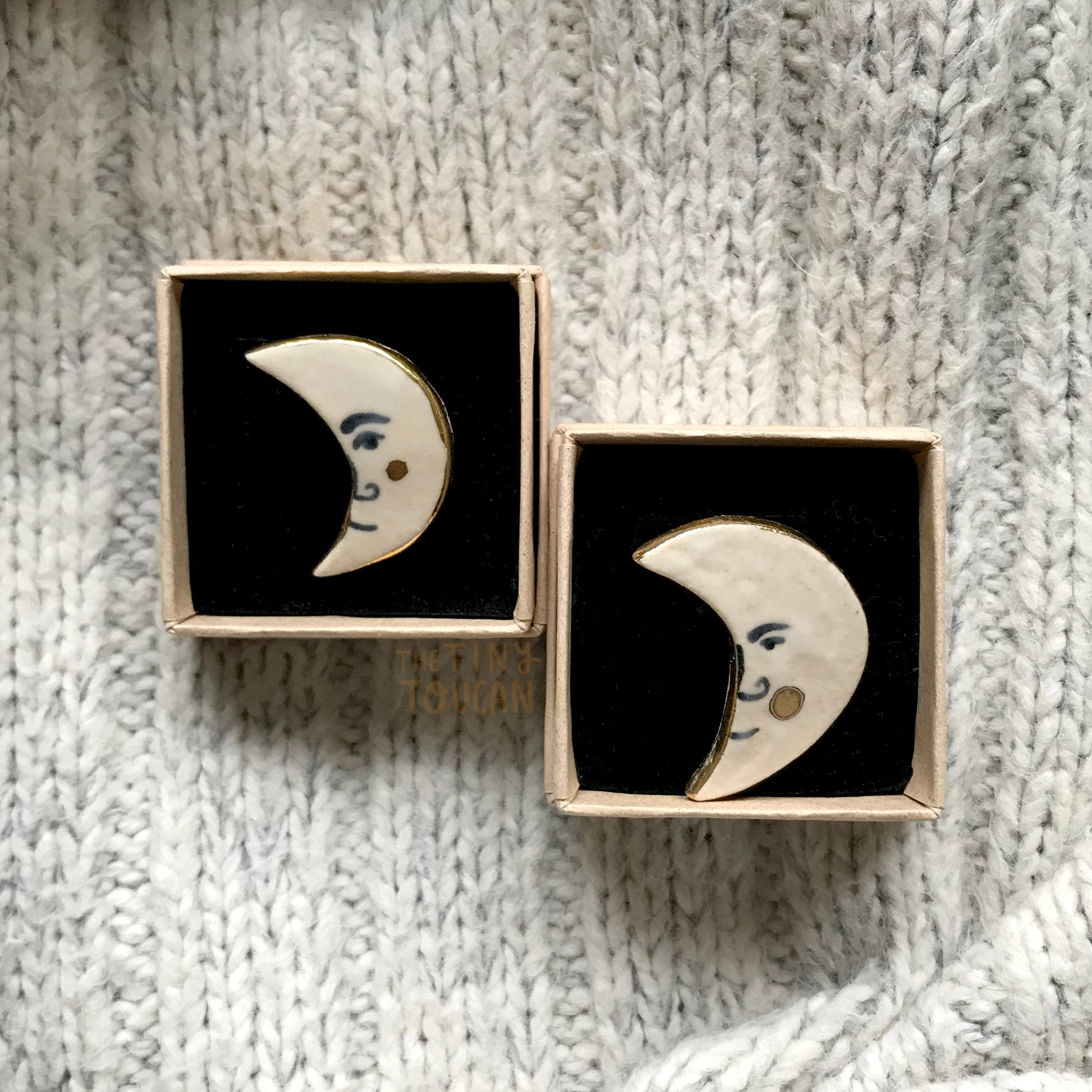 Hand made Stoneware ceramic moon pin with real 24k Gold Details and brass butterfly clasp.