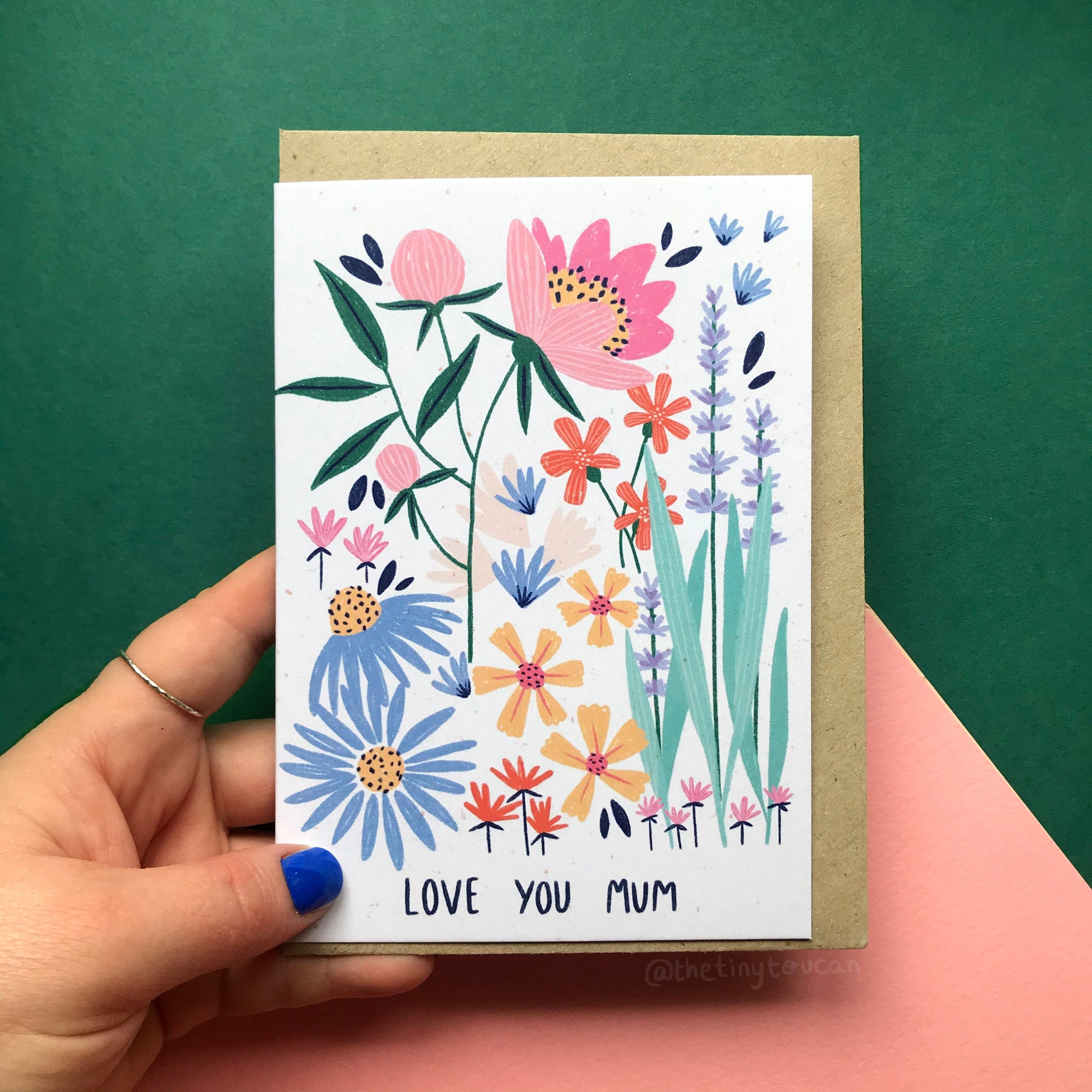 greetingsThis pretty floral Mothers Day card is printed on 350gsm, extra thick, Matte, velvet soft recycled card. It comes with a brown recycled envelope. No plastic used.
