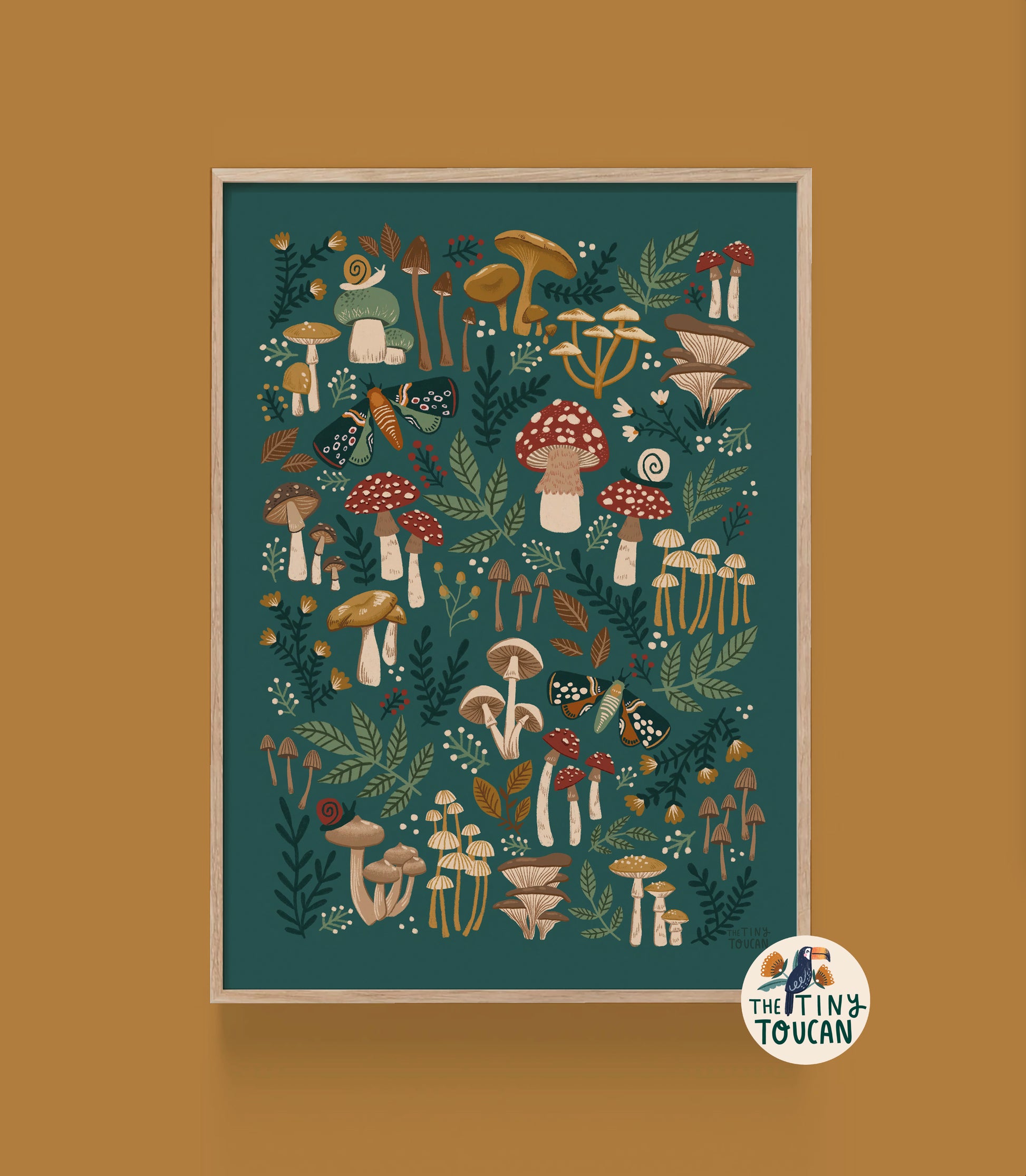 Featuring an assortment of illustrated wild fungi and all sorts of shapes and sizes.