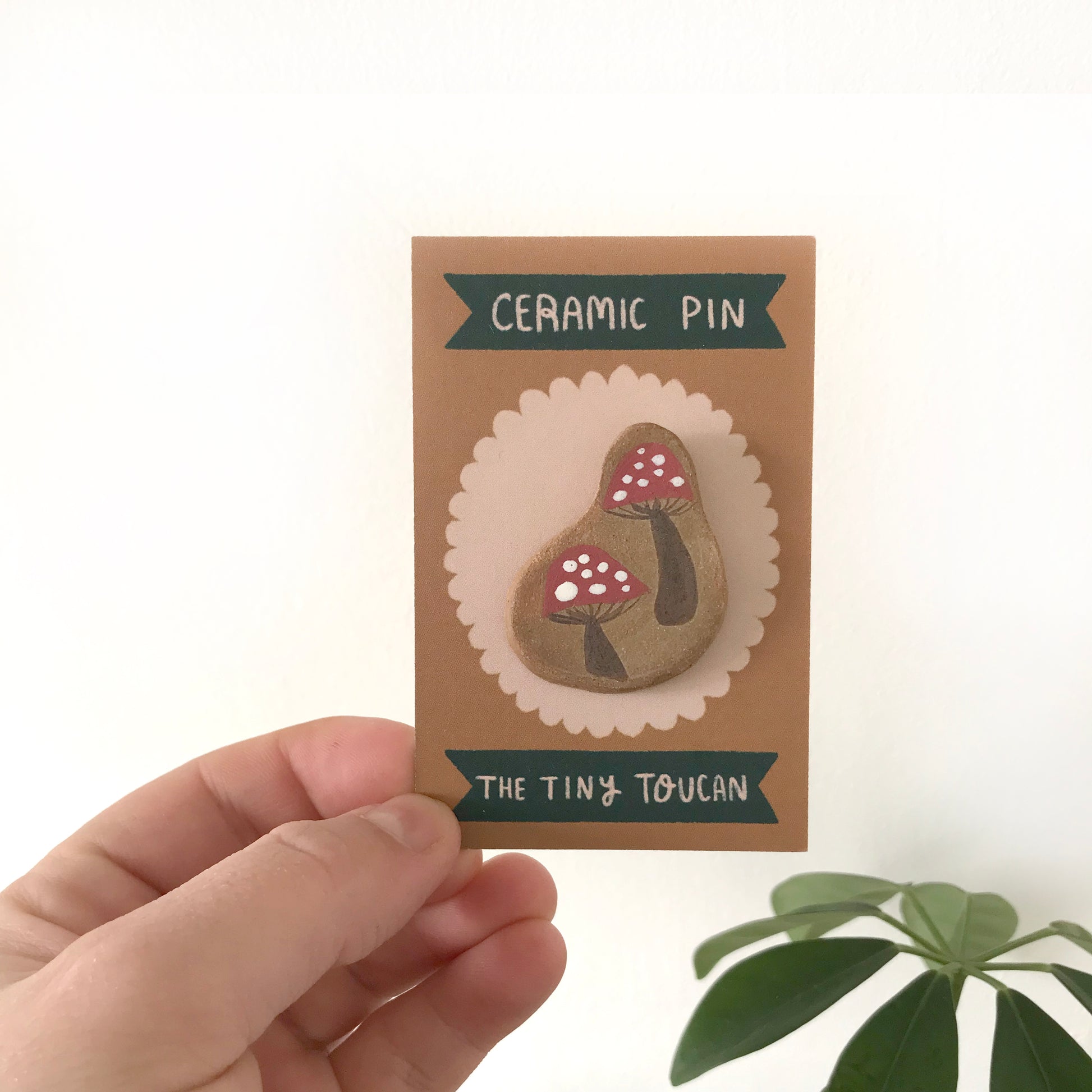 Handmade Stoneware ceramic illustrated mushroom pin with brass butterfly clasp.
