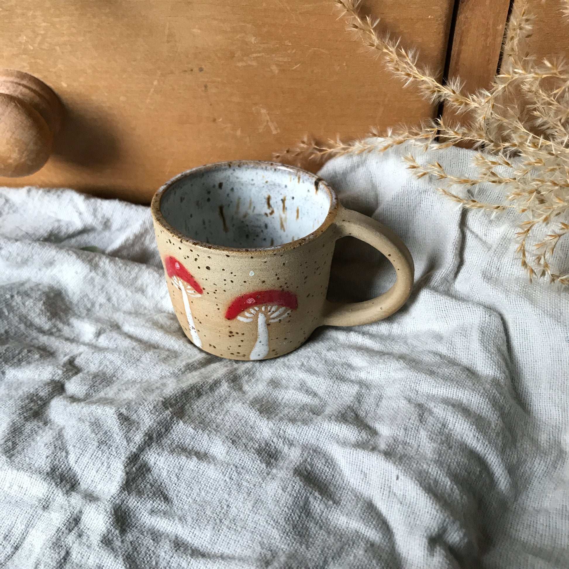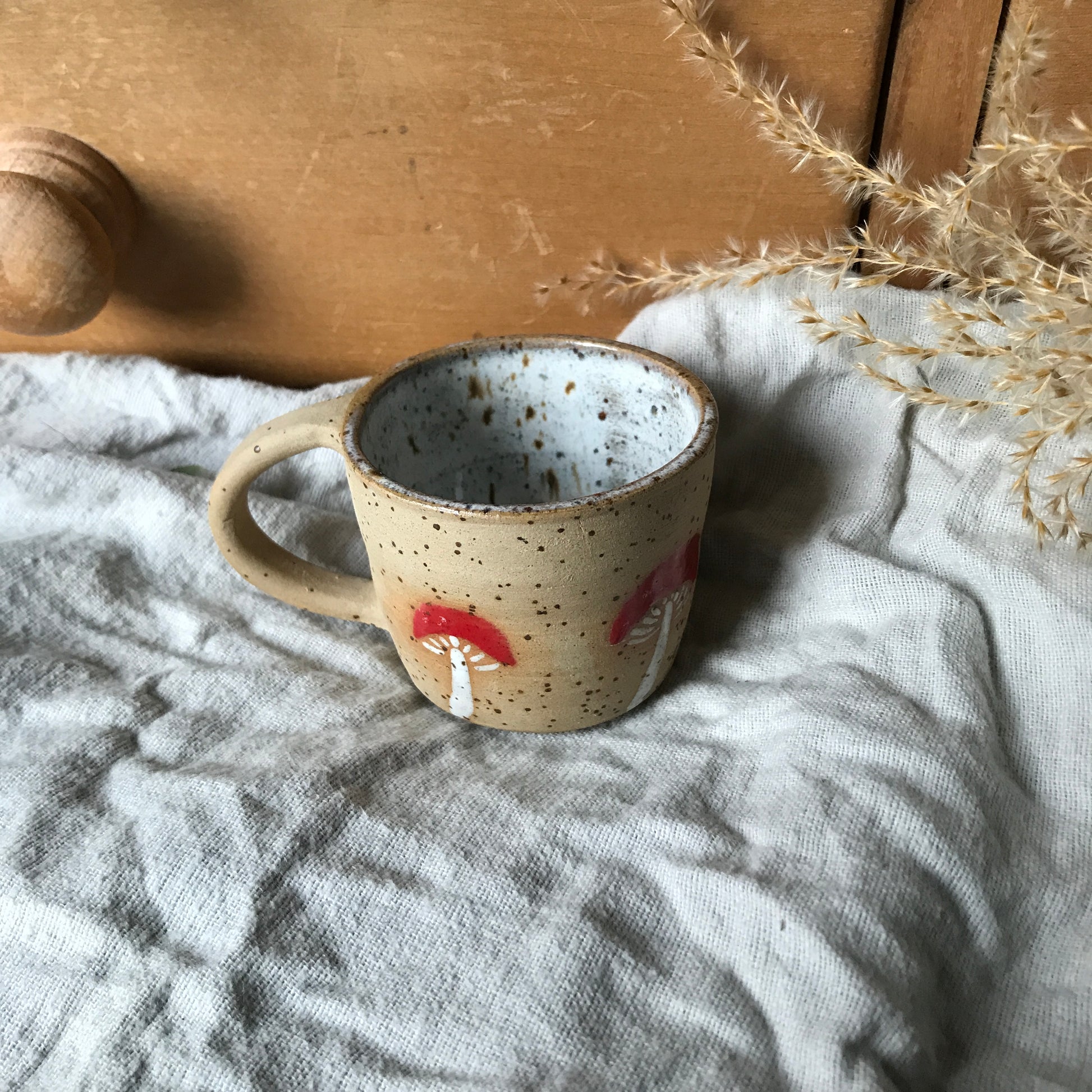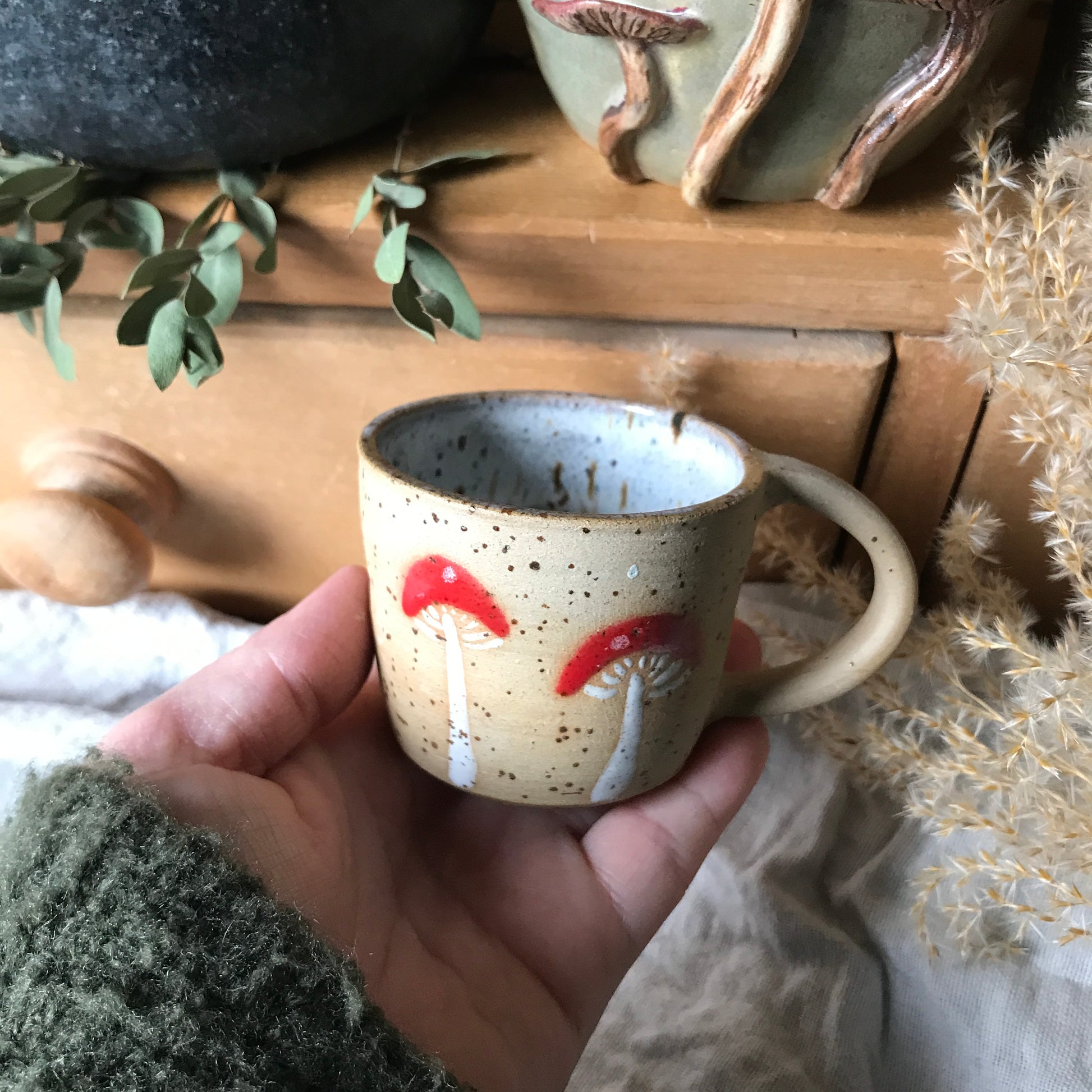 Stoneware espresso mug with mushroom illustrations and a teal internal glaze.