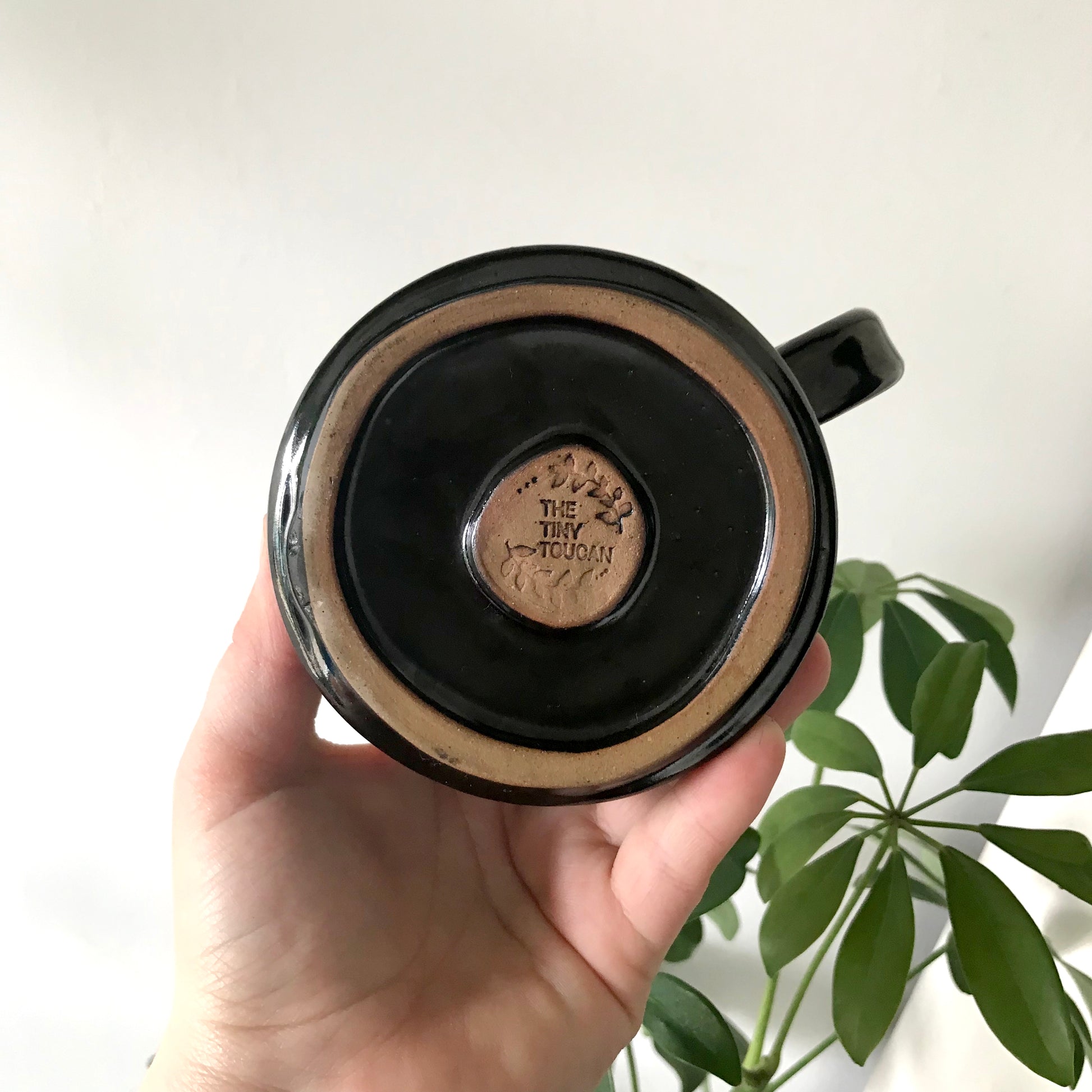 Made with beautifully toasted speckled British clay, hand painted with bright, high quality lead free underglazes, finished with a gloss black glaze.