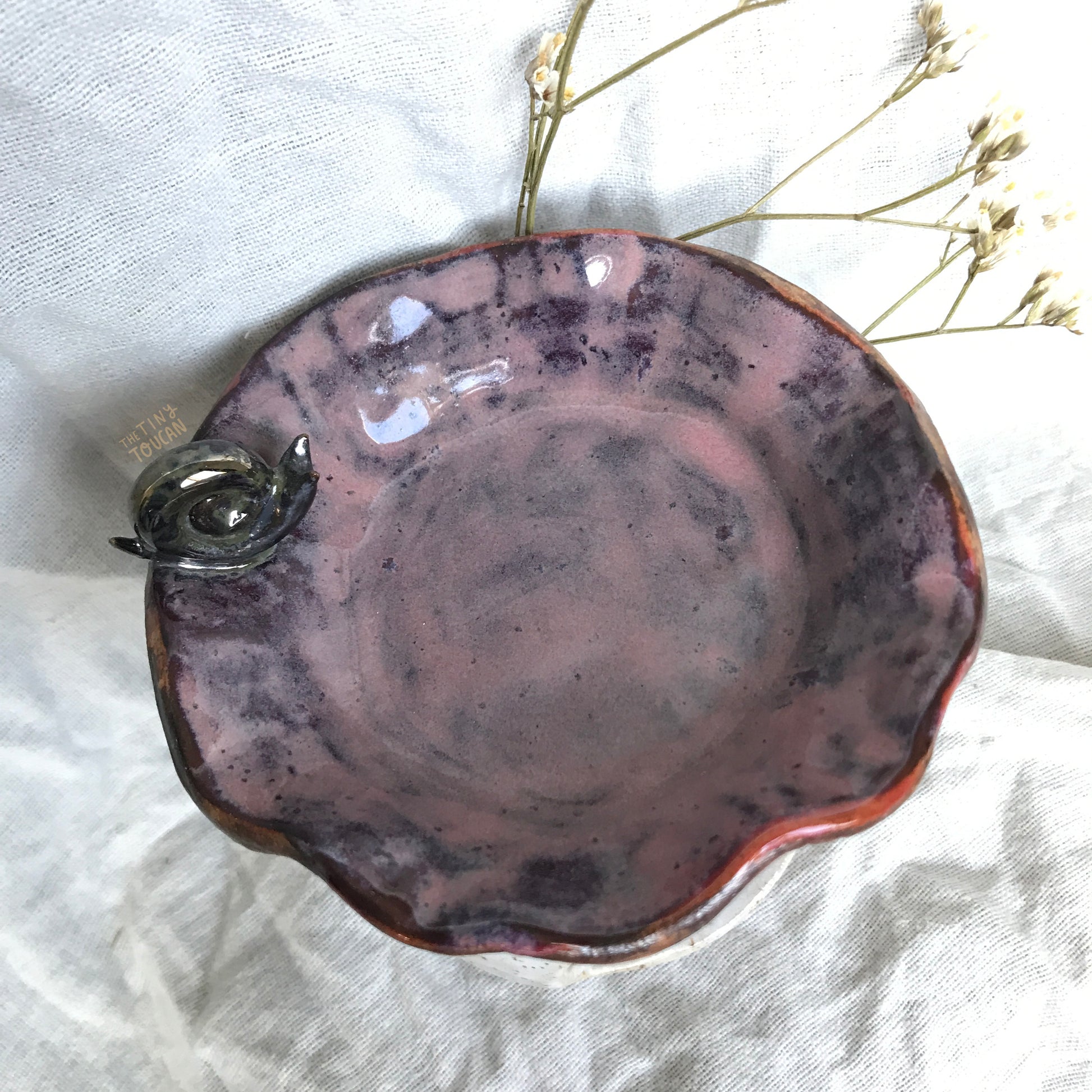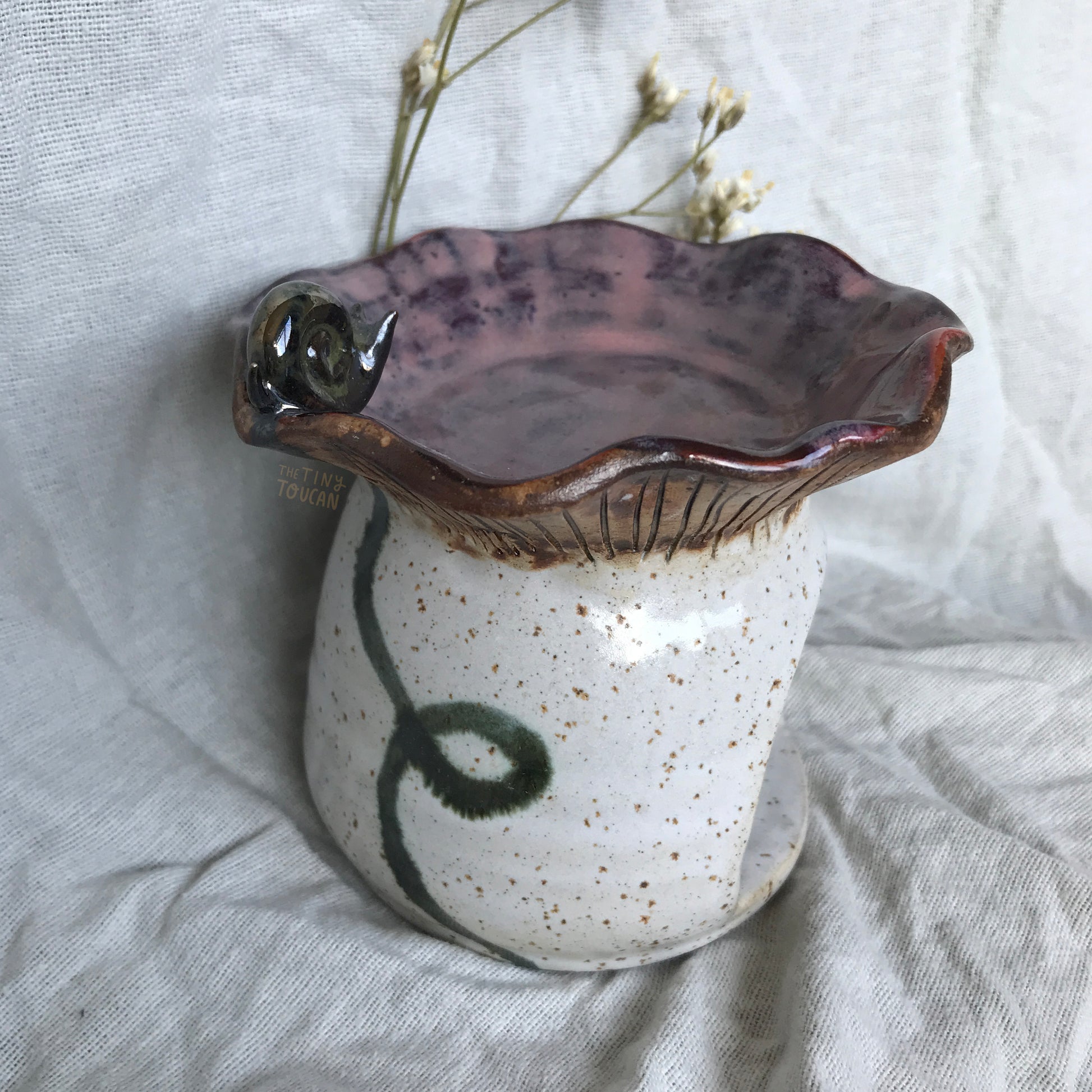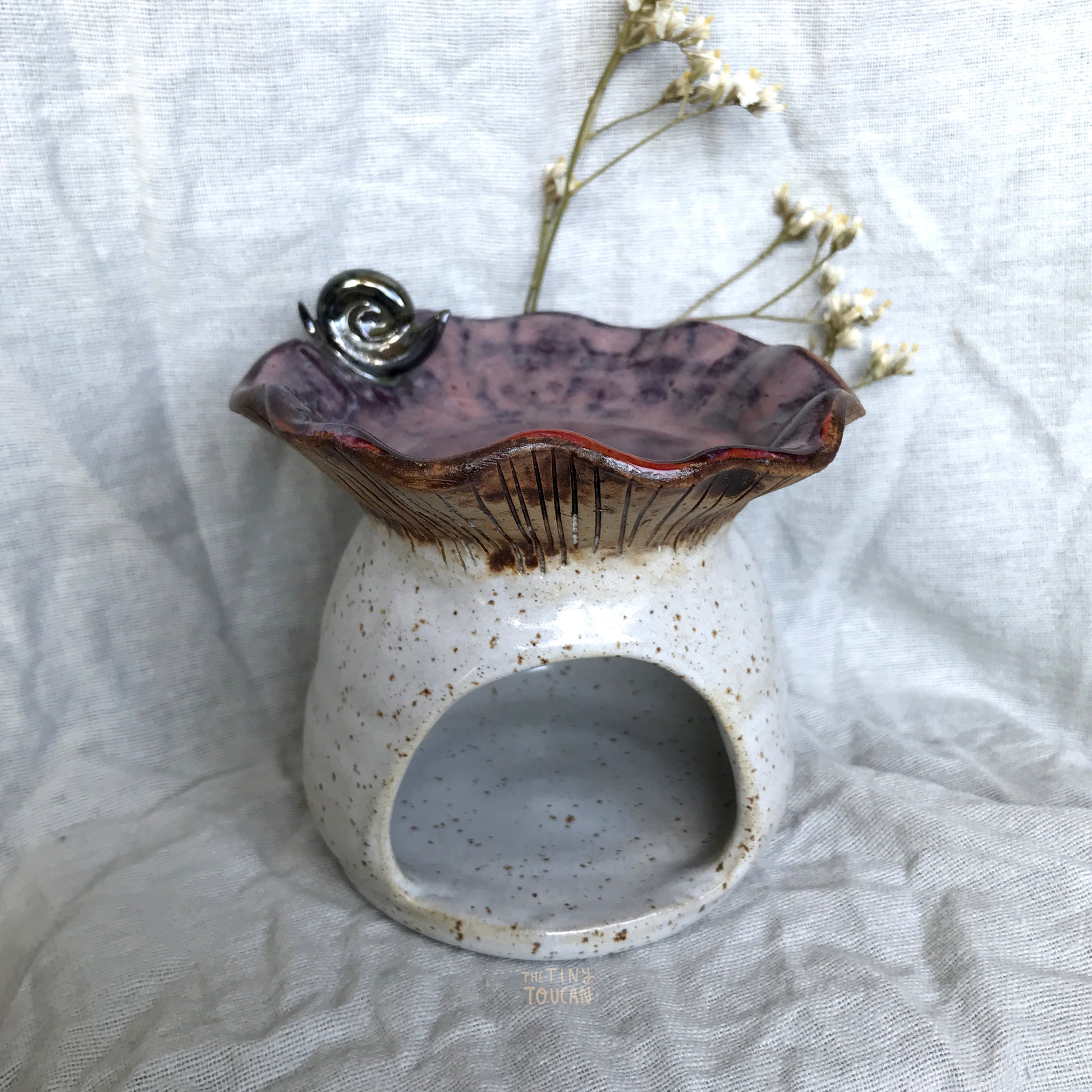 Stoneware mixed media piece featuring a hand thrown oil burner body with a hand sculpted mushroom cap and snail.