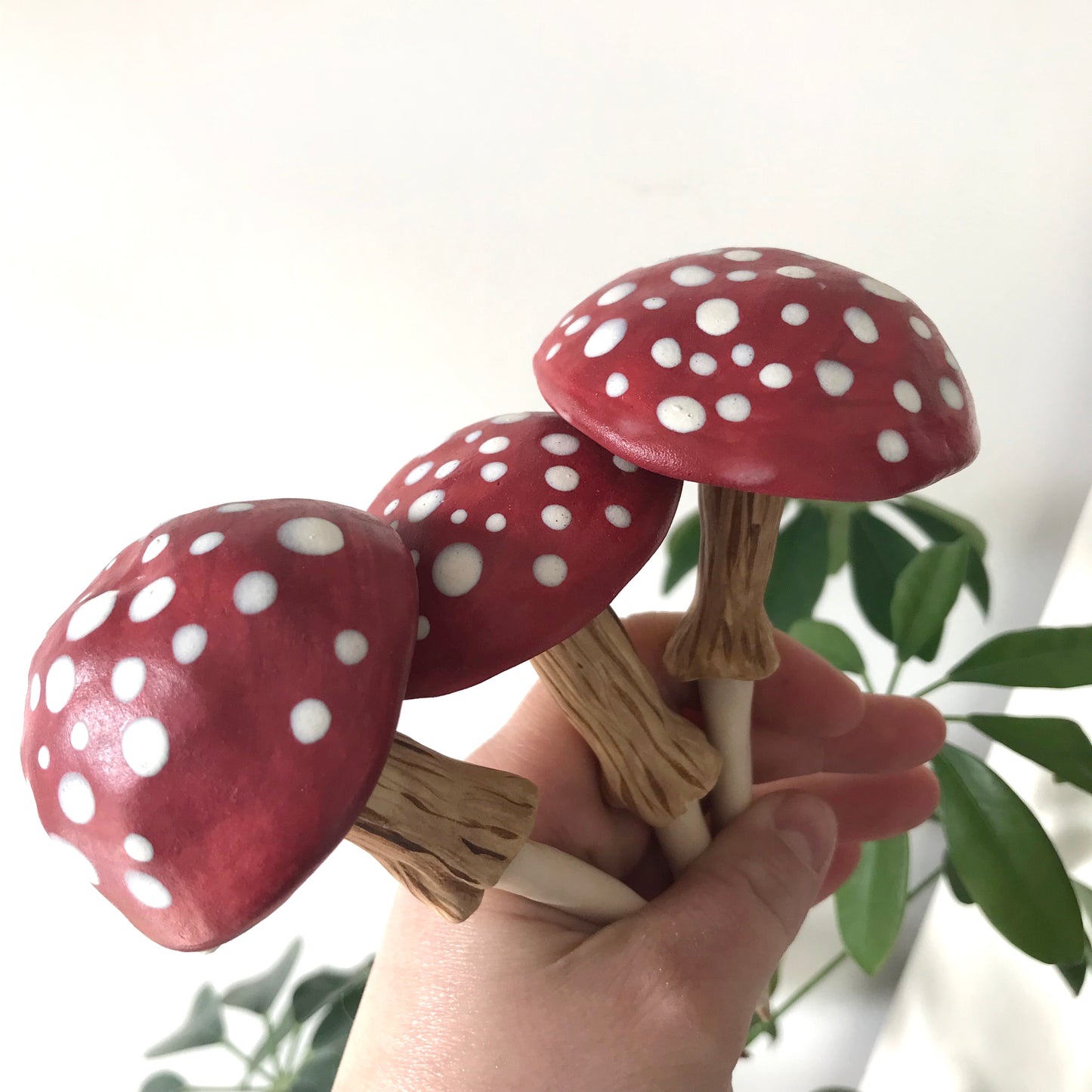 Handmade Stoneware Fly Alargic mushroom plat stakes. Add a cute pop of colour to your houseplants or garden. These can also be used as cake toppers.