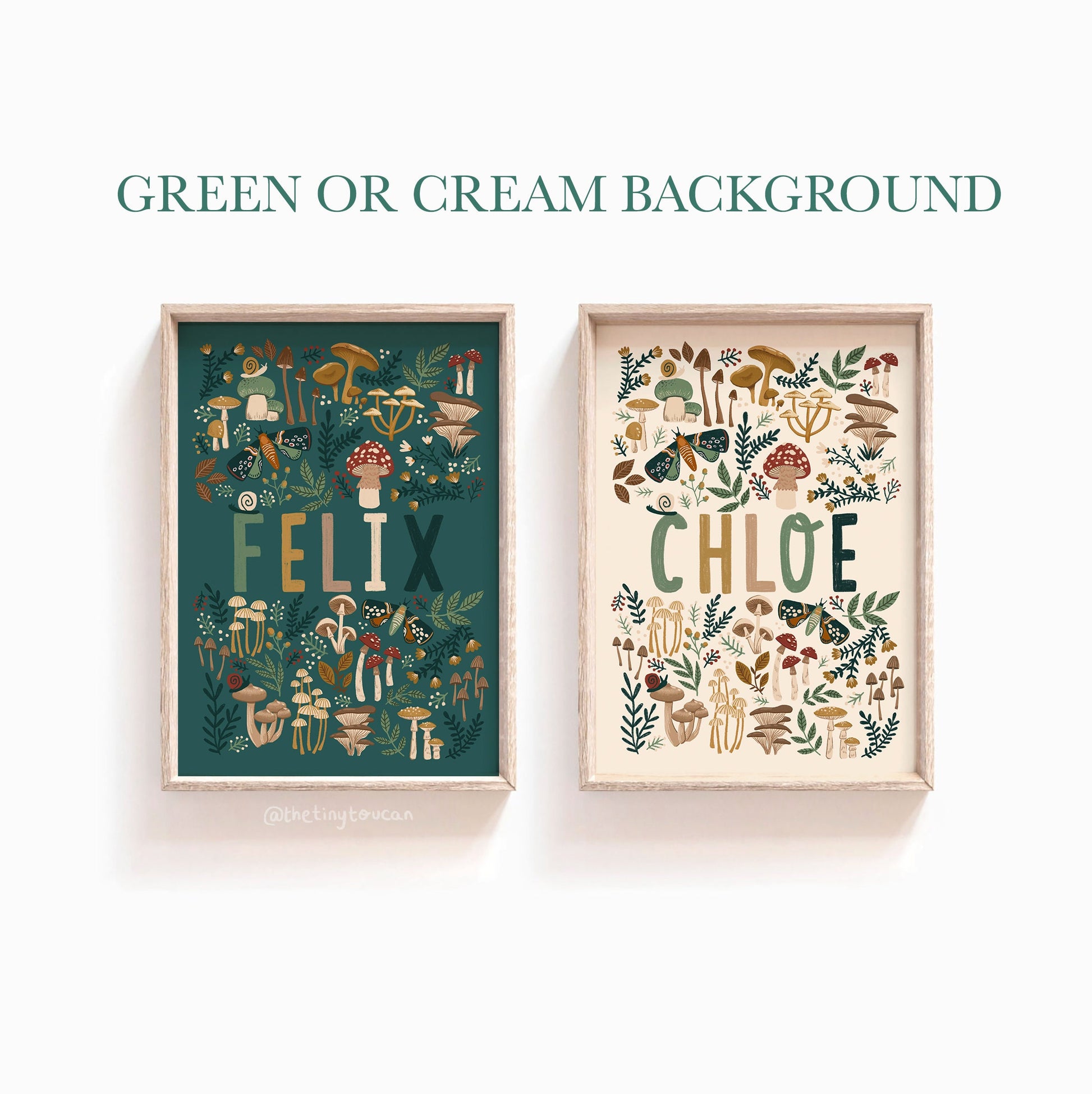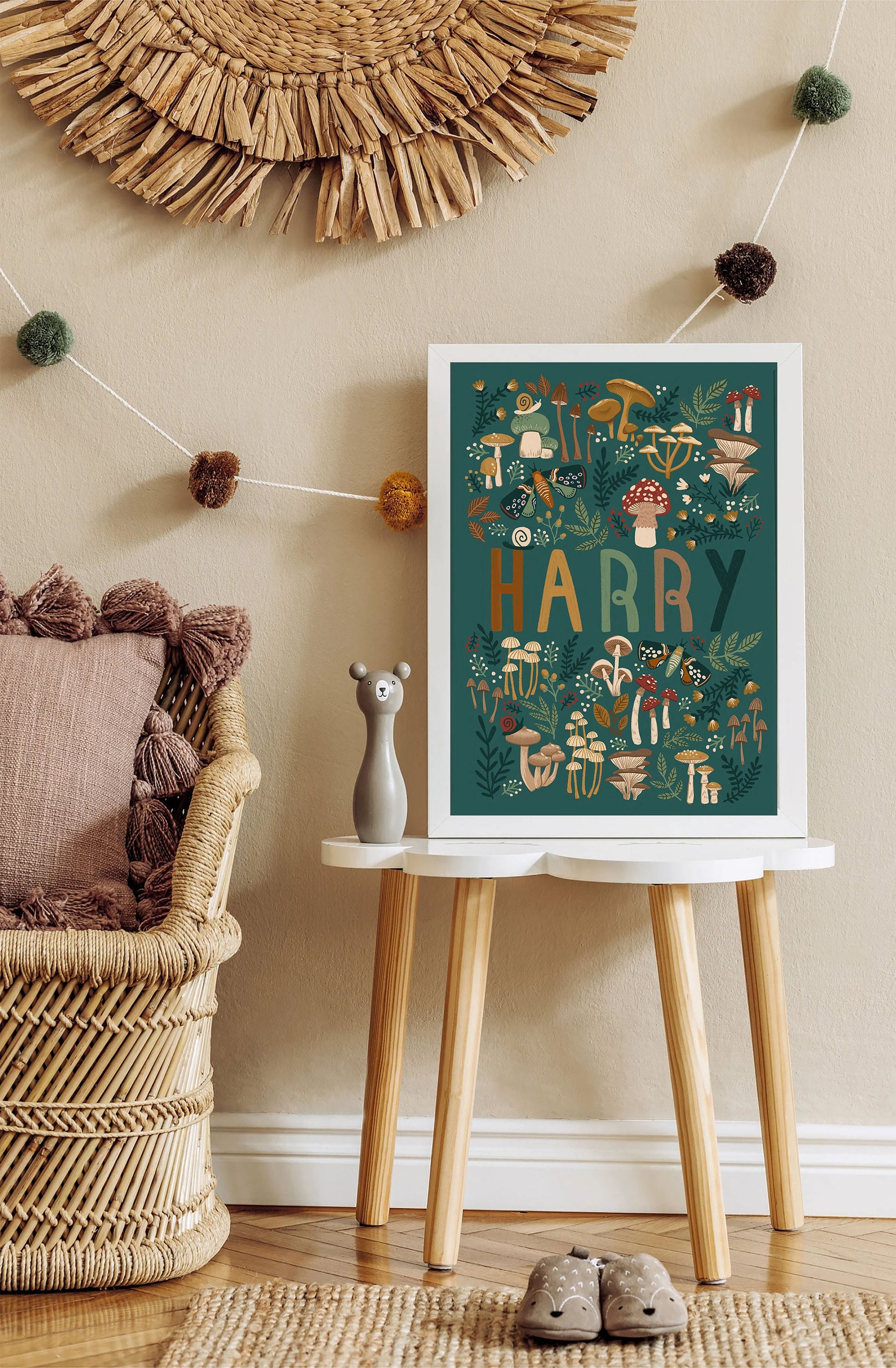Custom woodland mushrooms name art perfect for children's bedroom, nursery or playroom. A fun and earthy decor option a great choice for a woodland, cosy, warm theme room.