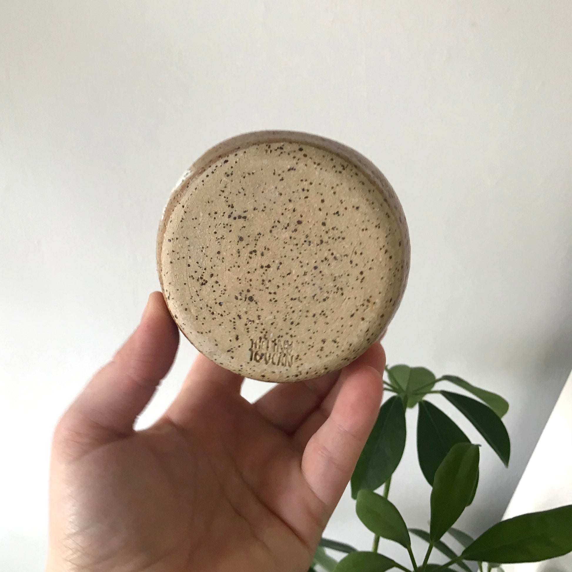 Stoneware handle-less mug with thumb dimple perfect for tea, sake, or a short coffee.