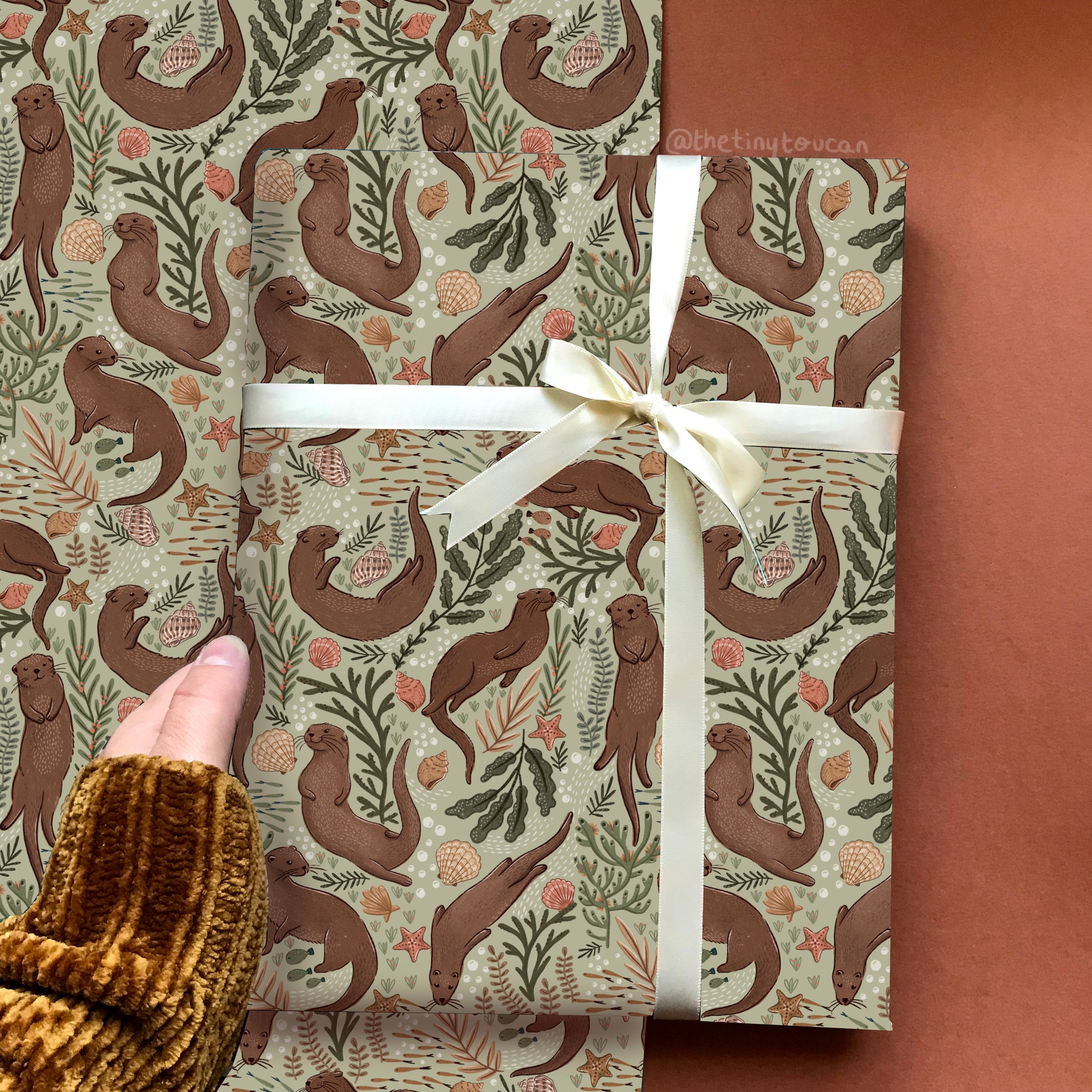 Illustrated Otters, Seaweed and shells wrapping paper sheet.