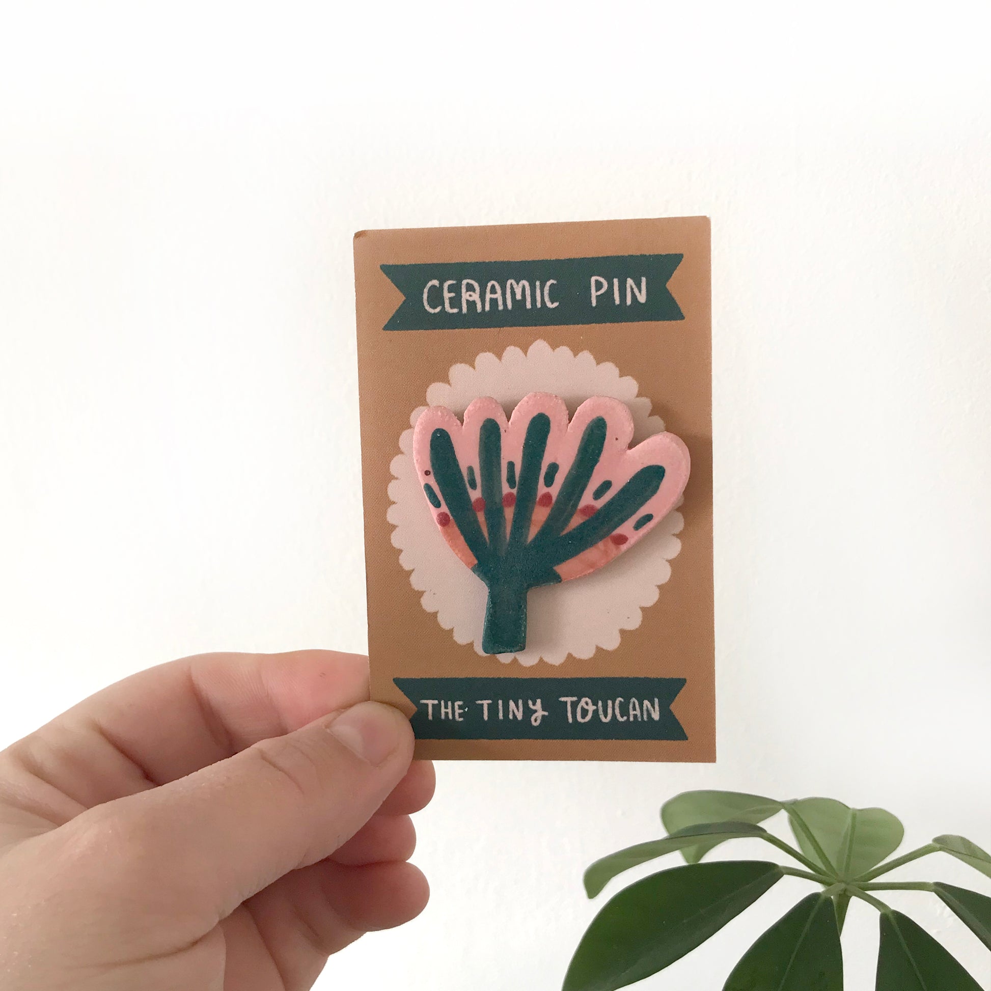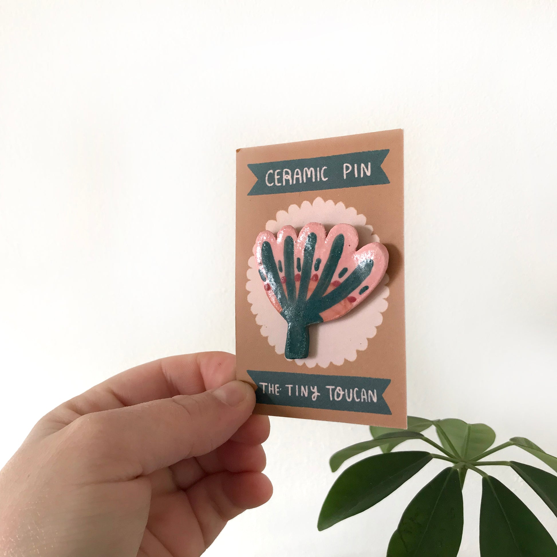 Handmade Stoneware ceramic illustrated flower pin with brass butterfly clasp.