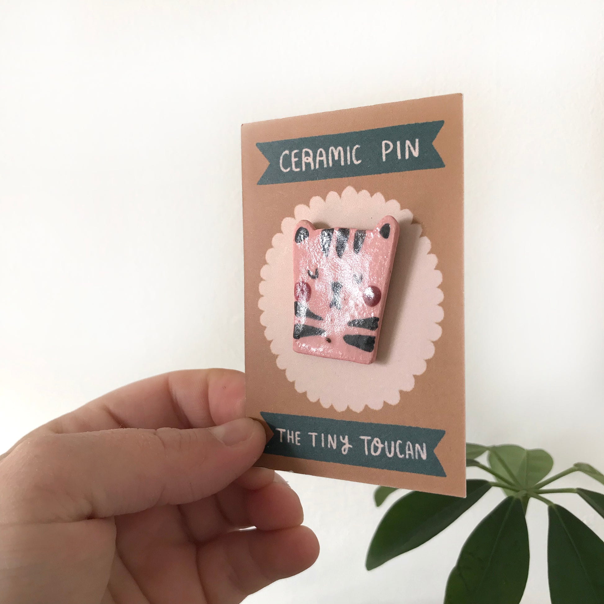 Handmade Stoneware ceramic pink tiger pin with brass butterfly clasp.