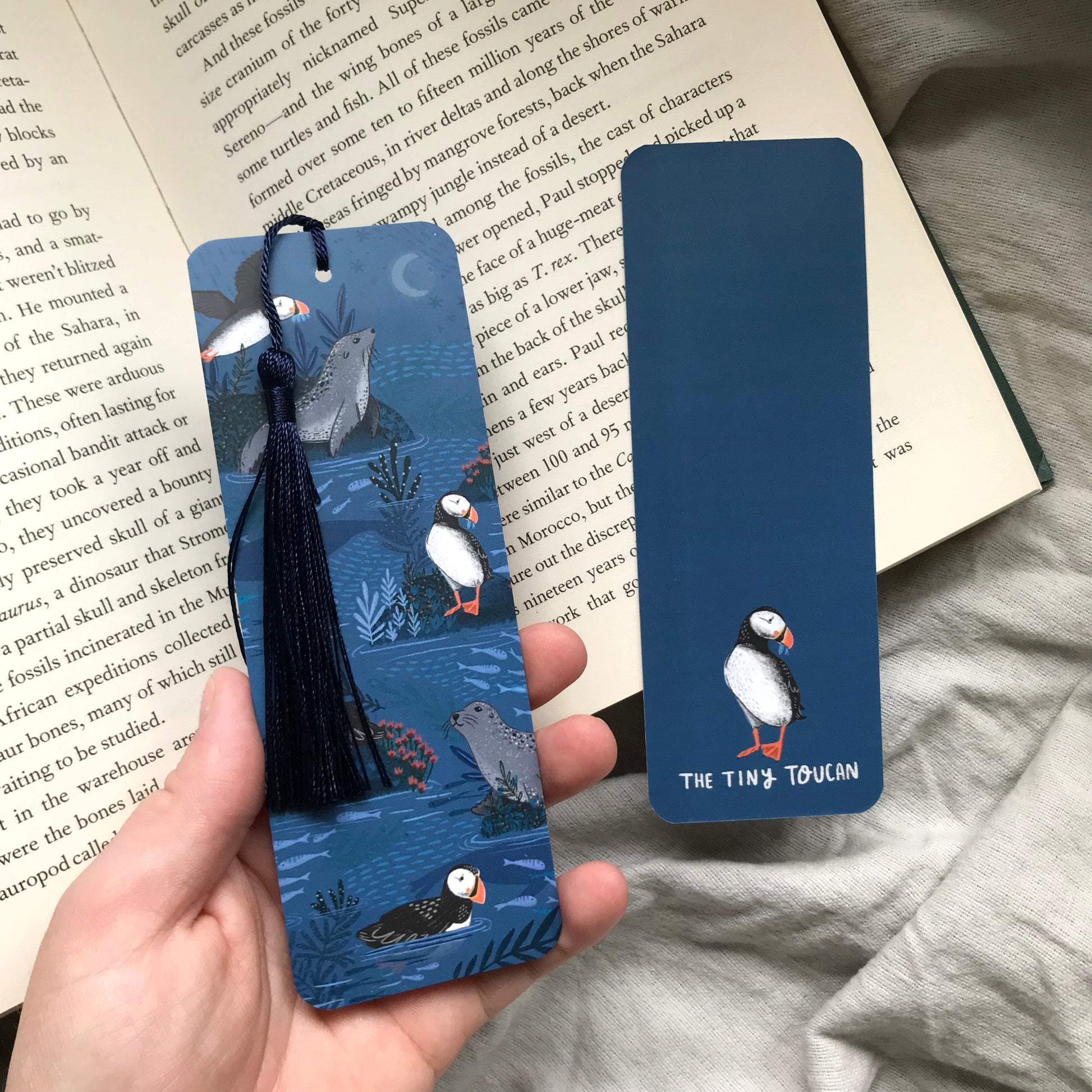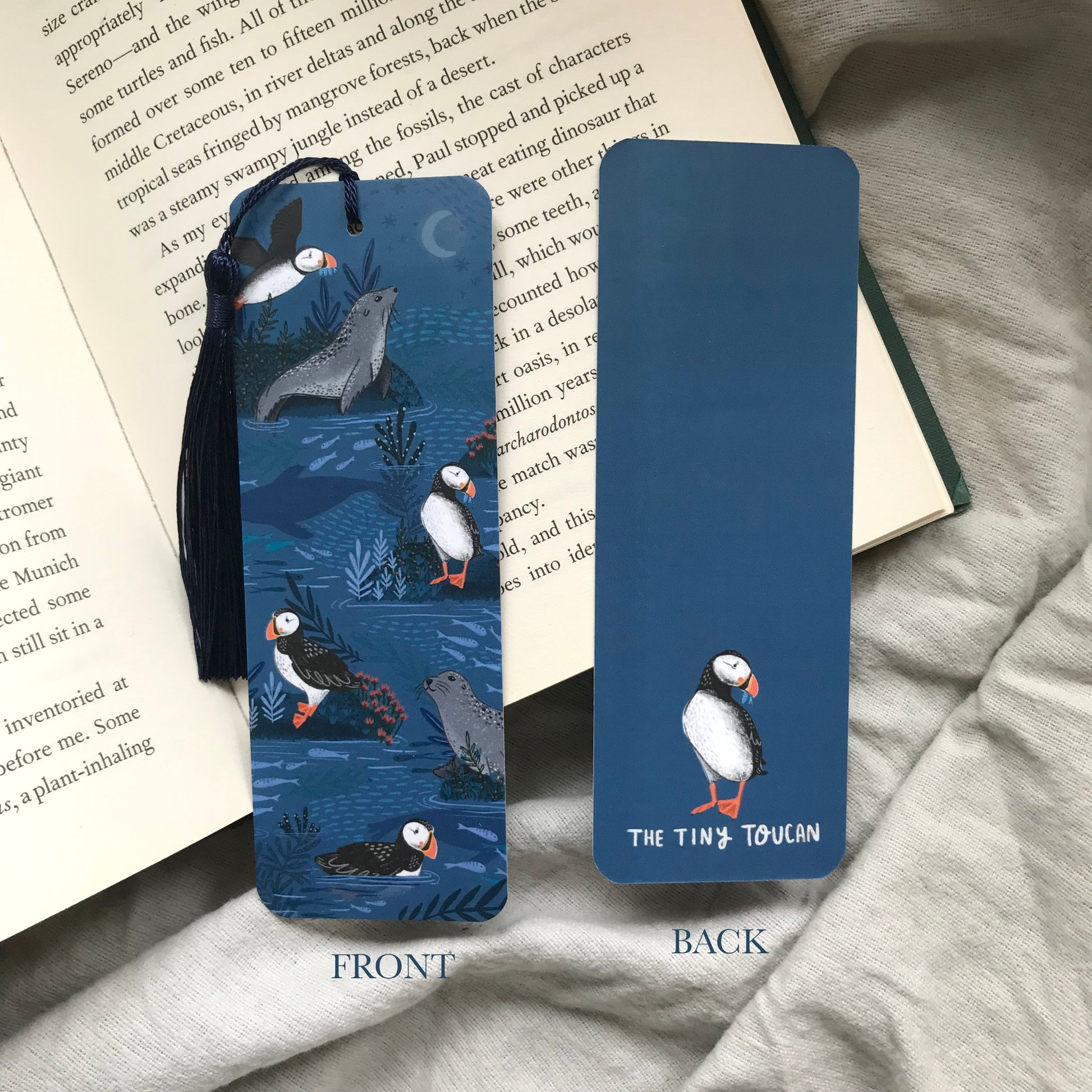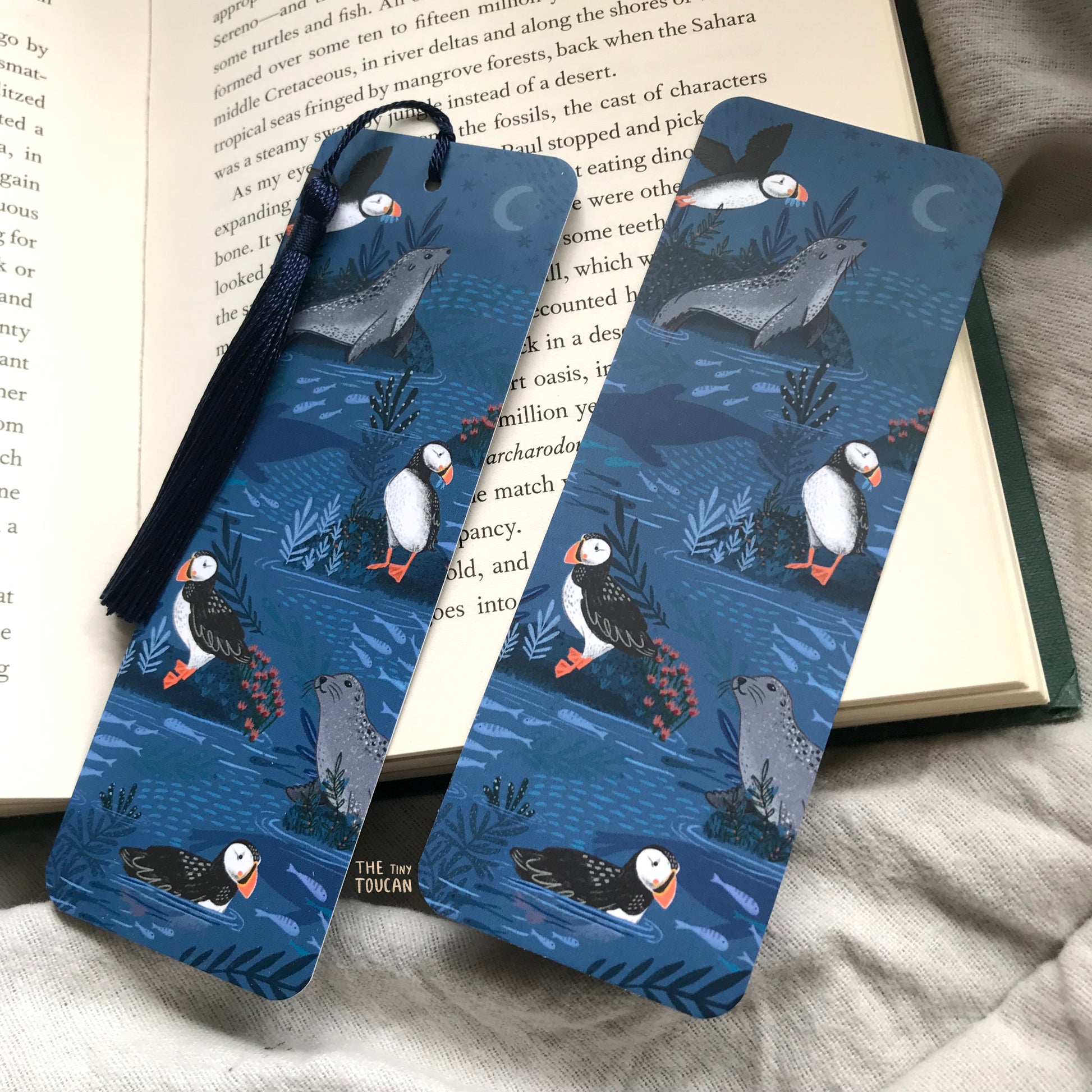 Illustrated puffins and seals in the moonlight bookmark available with or without a silky soft tassel.
