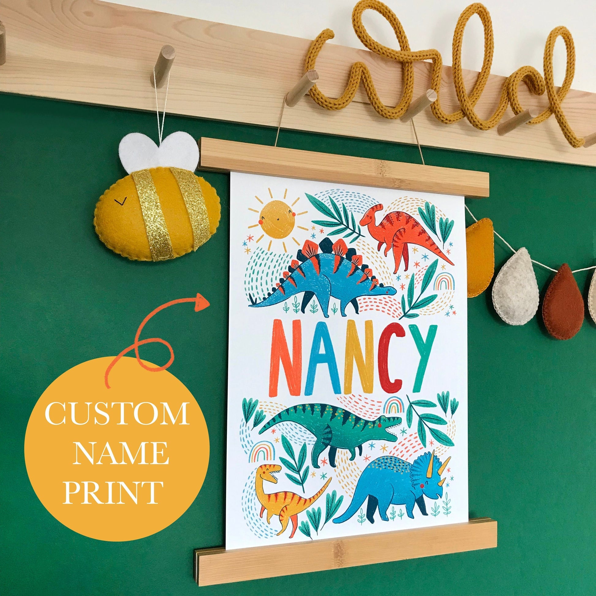 Custom colourful dinosaur name art with rainbows and star, perfect for any Child's bedroom, nursery or playroom. A fun and colourful decor option to brighten up your Childs wall.