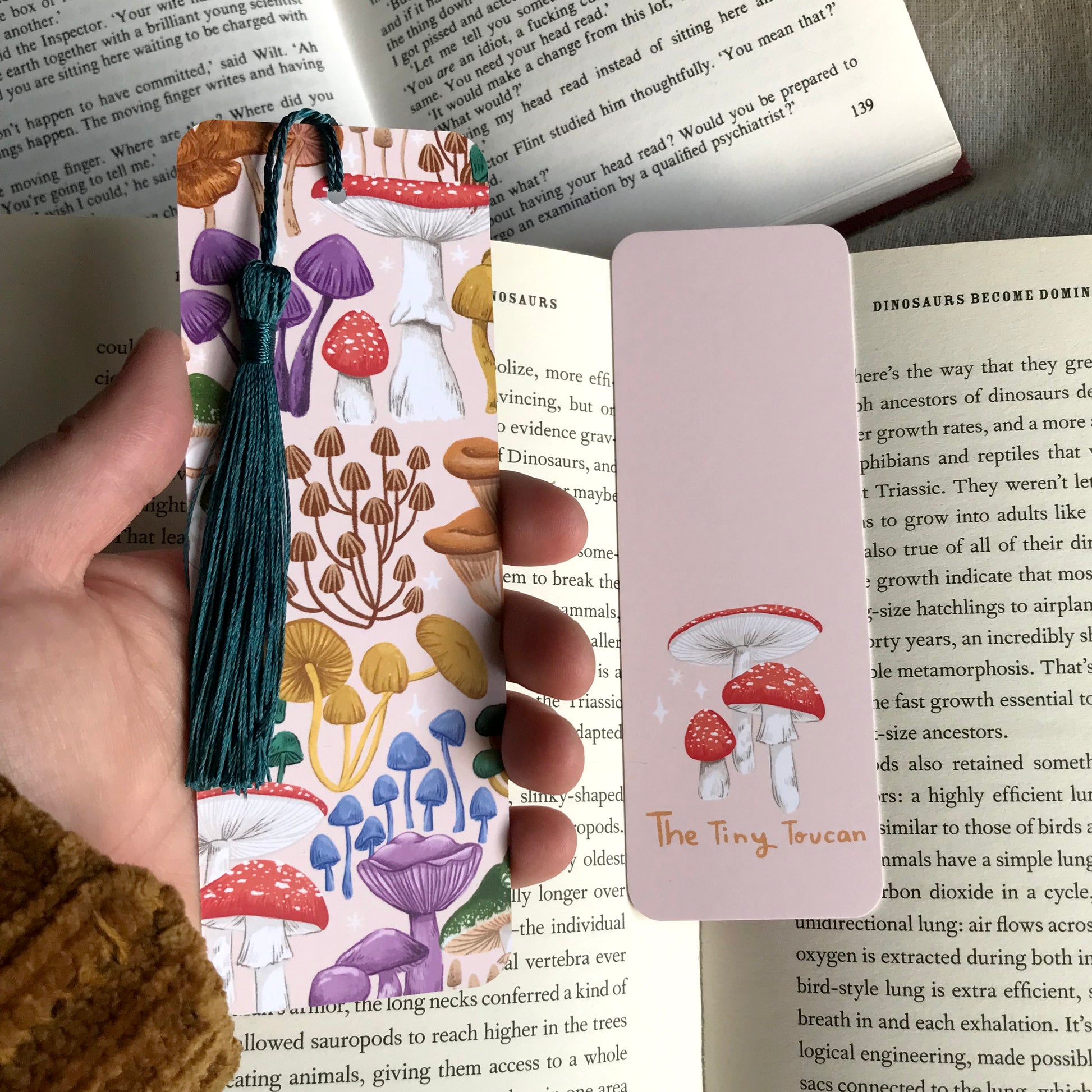 Illustrated mushrooms bookmark available with or without a silky soft tassel.