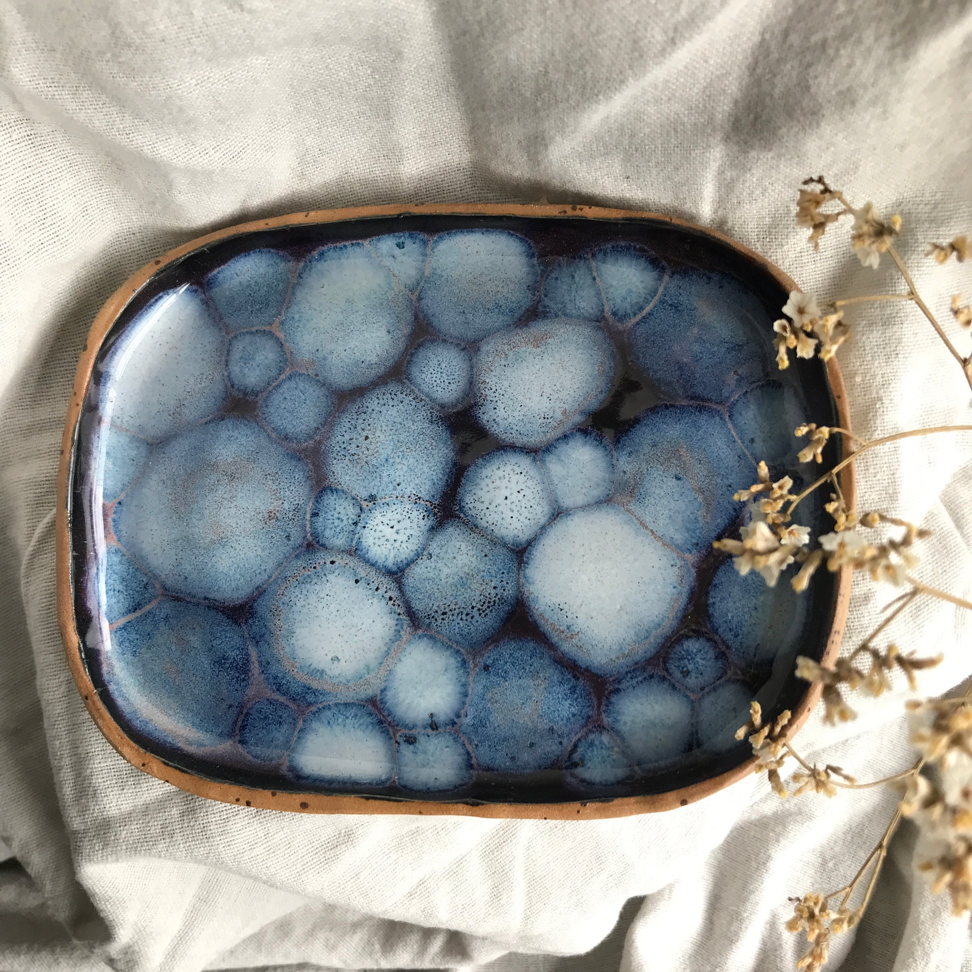 Stoneware butter dish with hand sculpted sitting shrew with a little backpack, lillypads and snail best friend. Glazed with a complex deep purple glaze with hand painted blue water ripple effect adding loads of depth and character.